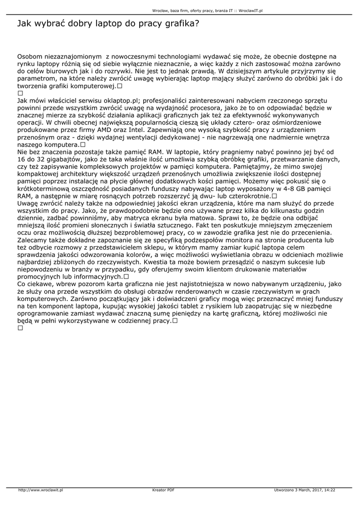 Wrocław, baza firm, oferty pracy, branża IT :: WroclawIT.pl Jak wybrać dobry laptop do pracy grafika? Osobom niezaznajomionym z nowoczesnymi technologiami wydawać się może, że obecnie dostępne na rynku laptopy różnią się od siebie wyłącznie nieznacznie, a więc każdy z nich zastosować można zarówno do celów biurowych jak i do rozrywki. Nie jest to jednak prawdą. W dzisiejszym artykule przyjrzymy się parametrom, na które należy zwrócić uwagę wybierając laptop mający służyć zarówno do obróbki jak i do tworzenia grafiki komputerowej. Jak mówi właściciel serwisu oklaptop.pl; profesjonaliści zainteresowani nabyciem rzeczonego sprzętu powinni przede wszystkim zwrócić uwagę na wydajność procesora, jako że to on odpowiadać będzie w znacznej mierze za szybkość działania aplikacji graficznych jak też za efektywność wykonywanych operacji. W chwili obecnej największą popularnością cieszą się układy cztero- oraz ośmiordzeniowe produkowane przez firmy AMD oraz Intel. Zapewniają one wysoką szybkość pracy z urządzeniem przenośnym oraz - dzięki wydajnej wentylacji dedykowanej - nie nagrzewają one nadmiernie wnętrza naszego komputera. Nie bez znaczenia pozostaje także pamięć RAM. W laptopie, który pragniemy nabyć powinno jej być od 16 do 32 gigabajtów, jako że taka właśnie ilość umożliwia szybką obróbkę grafiki, przetwarzanie danych, czy też zapisywanie kompleksowych projektów w pamięci komputera. Pamiętajmy, że mimo swojej kompaktowej architektury większość urządzeń przenośnych umożliwia zwiększenie ilości dostępnej pamięci poprzez instalację na płycie głównej dodatkowych kości pamięci. Możemy więc pokusić się o krótkoterminową oszczędność posiadanych funduszy nabywając laptop wyposażony w 4-8 GB pamięci RAM, a następnie w miarę rosnących potrzeb rozszerzyć ją dwu- lub czterokrotnie. Uwagę zwrócić należy także na odpowiedniej jakości ekran urządzenia, które ma nam służyć do przede wszystkim do pracy. Jako, że prawdopodobnie będzie ono używane przez kilka do kilkunastu godzin dziennie, zadbać powinniśmy, aby matryca ekranu była matowa. Sprawi to, że będzie ona odbijać mniejszą ilość promieni słonecznych i światła sztucznego. Fakt ten poskutkuje mniejszym zmęczeniem oczu oraz możliwością dłuższej bezproblemowej pracy, co w zawodzie grafika jest nie do przecenienia. Zalecamy także dokładne zapoznanie się ze specyfiką podzespołów monitora na stronie producenta lub też odbycie rozmowy z przedstawicielem sklepu, w którym mamy zamiar kupić laptopa celem sprawdzenia jakości odwzorowania kolorów, a więc możliwości wyświetlania obrazu w odcieniach możliwie najbardziej zbliżonych do rzeczywistych. Kwestia ta może bowiem przesądzić o naszym sukcesie lub niepowodzeniu w branży w przypadku, gdy oferujemy swoim klientom drukowanie materiałów promocyjnych lub informacyjnych. Co ciekawe, wbrew pozorom karta graficzna nie jest najistotniejsza w nowo nabywanym urządzeniu, jako że służy ona przede wszystkim do obsługi obrazów renderowanych w czasie rzeczywistym w grach komputerowych. Zarówno początkujący jak i doświadczeni graficy mogą więc przeznaczyć mniej funduszy na ten komponent laptopa, kupując wysokiej jakości tablet z rysikiem lub zaopatrując się w niezbędne oprogramowanie zamiast wydawać znaczną sumę pieniędzy na kartę graficzną, której możliwości nie będą w pełni wykorzystywane w codziennej pracy. http://www.wroclawit.pl Kreator PDF Utworzono 3 March, 2017, 14:22