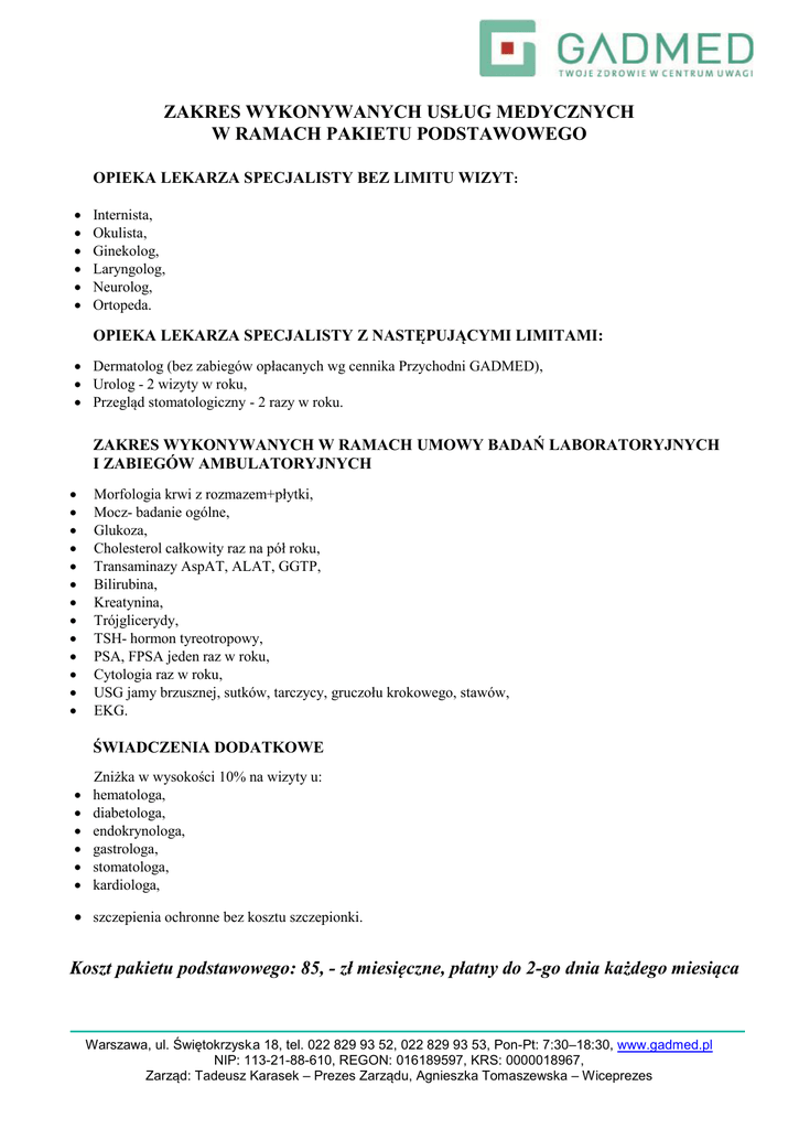 ZAKRES WYKONYWANYCH USŁUG MEDYCZNYCH W RAMACH PAKIETU PODSTAWOWEGO OPIEKA LEKARZA SPECJALISTY BEZ LIMITU WIZYT:       Internista, Okulista, Ginekolog, Laryngolog, Neurolog, Ortopeda. OPIEKA LEKARZA SPECJALISTY Z NASTĘPUJĄCYMI LIMITAMI:  Dermatolog (bez zabiegów opłacanych wg cennika Przychodni GADMED),  Urolog - 2 wizyty w roku,  Przegląd stomatologiczny - 2 razy w roku. ZAKRES WYKONYWANYCH W RAMACH UMOWY BADAŃ LABORATORYJNYCH I ZABIEGÓW AMBULATORYJNYCH              Morfologia krwi z rozmazem+płytki, Mocz- badanie ogólne, Glukoza, Cholesterol całkowity raz na pół roku, Transaminazy AspAT, ALAT, GGTP, Bilirubina, Kreatynina, Trójglicerydy, TSH- hormon tyreotropowy, PSA, FPSA jeden raz w roku, Cytologia raz w roku, USG jamy brzusznej, sutków, tarczycy, gruczołu krokowego, stawów, EKG. ŚWIADCZENIA DODATKOWE       Zniżka w wysokości 10% na wizyty u: hematologa, diabetologa, endokrynologa, gastrologa, stomatologa, kardiologa,  szczepienia ochronne bez kosztu szczepionki. Koszt pakietu podstawowego: 85, - zł miesięczne, płatny do 2-go dnia każdego miesiąca Warszawa, ul. Świętokrzyska 18, tel. 022 829 93 52, 022 829 93 53, Pon-Pt: 7:30–18:30, www.gadmed.pl NIP: 113-21-88-610, REGON: 016189597, KRS: 0000018967, Zarząd: Tadeusz Karasek – Prezes Zarządu, Agnieszka Tomaszewska – Wiceprezes ZAKRES WYKONYWANYCH USŁUG MEDYCZNYCH W RAMACH PAKIETU ROZSZERZONEGO OPIEKA LEKARZA SPECJALISTY BEZ LIMITU WIZYT: ● ● ● ● Internista, Okulista, Ginekolog, Laryngolog, ● ● ● ● Neurolog, Diabetolog, Hematolog. Ortopeda. OPIEKA LEKARZA SPECJALISTY Z NASTĘPUJĄCYMI LIMITAMI: ● Dermatolog (bez zabiegów opłacanych wg cennika Przychodni GADMED), ● Urolog - 2 wizyty w roku, ● Przegląd stomatologiczny - 2 razy w roku. ZAKRES WYKONYWANYCH W RAMACH UMOWY BADAŃ LABORATORYJNYCH I ZABIEGÓW AMBULATORYJNYCH ● ● ● ● ● ● ● ● Morfologia krwi z rozmazem+płytki, Mocz- badanie ogólne, Glukoza, Cholesterol całkowity raz na pół roku, Transaminazy AspAT, ALAT, GGTP, Czas protrombinowy PT, INR, Bilirubina , Mocznik, ● ● ● ● ● ● ● ● ● ● ● Cytologia raz w roku, USG jamy brzusznej, sutków, tarczycy, gruczołu krokowego, stawów, EKG, Pole widzenia. Kreatynina, Kwas moczowy, Trójglicerydy, Fosfataza alkaliczna, Grupa krwi i Rh TSH- hormon tyreotropowy, PSA, FPSA jeden raz w roku, ŚWIADCZENIA DODATKOWE Zniżka w wysokości 15% na wizyty u: ● endokrynologa, ● gastrologa, ● stomatologa, ● kardiologa, ● szczepienia ochronne bez kosztu szczepionki, ● zniżka w wysokości 10 % na USG transwaginalne, ● rehabilitacja i fizykoterapia w preferencyjnej cenie 15 zł za zabieg, Koszt pakietu rozszerzonego: 130, - zł miesięczne, płatny do 2-go dnia każdego miesiąca Warszawa, ul. Świętokrzyska 18, tel. 022 829 93 52, 022 829 93 53, Pon-Pt: 7:30–18:30, www.gadmed.pl NIP: 113-21-88-610, REGON: 016189597, KRS: 0000018967, Zarząd: Tadeusz Karasek – Prezes Zarządu, Agnieszka Tomaszewska – Wiceprezes