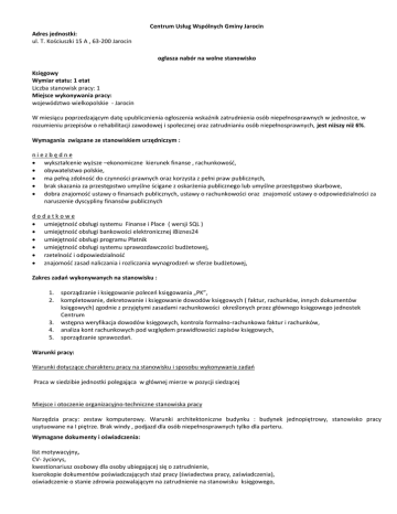 Centrum Usług Wspólnych Gminy Jarocin Adres jednostki: ul. T. Kościuszki 15 A , 63-200 Jarocin ogłasza nabór na wolne stanowisko Księgowy Wymiar etatu: 1 etat Liczba stanowisk pracy: 1 Miejsce wykonywania pracy: województwo wielkopolskie - Jarocin W miesiącu poprzedzającym datę upublicznienia ogłoszenia wskaźnik zatrudnienia osób niepełnosprawnych w jednostce, w rozumieniu przepisów o rehabilitacji zawodowej i społecznej oraz zatrudnianiu osób niepełnosprawnych, jest niższy niż 6%. Wymagania związane ze stanowiskiem urzędniczym : niezbędne wykształcenie wyższe –ekonomiczne kierunek finanse , rachunkowość, obywatelstwo polskie, ma pełną zdolność do czynności prawnych oraz korzysta z pełni praw publicznych, brak skazania za przestępstwo umyślne ścigane z oskarżenia publicznego lub umyślne przestępstwo skarbowe, dobra znajomość ustawy o finansach publicznych, ustawy o rachunkowości oraz znajomość ustawy o odpowiedzialności za naruszenie dyscypliny finansów publicznych dodatkowe umiejętność obsługi systemu Finanse i Place ( wersji SQL ) umiejętność obsługi bankowości elektronicznej iBiznes24 umiejętność obsługi programu Płatnik umiejętność obsługi systemu sprawozdawczości budżetowej, rzetelność i odpowiedzialność znajomość zasad naliczania i rozliczania wynagrodzeń w sferze budżetowej, Zakres zadań wykonywanych na stanowisku : 1. 2. 3. 4. 5. sporządzanie i księgowanie poleceń księgowania „PK”, kompletowanie, dekretowanie i księgowanie dowodów księgowych ( faktur, rachunków, innych dokumentów księgowych) zgodnie z przyjętymi zasadami rachunkowości określonych przez głównego księgowego jednostek Centrum wstępna weryfikacja dowodów księgowych, kontrola formalno-rachunkowa faktur i rachunków, analiza kont rachunkowych pod względem prawidłowości zapisów księgowych, sporządzanie sprawozdań. Warunki pracy: Warunki dotyczące charakteru pracy na stanowisku i sposobu wykonywania zadań Praca w siedzibie jednostki polegająca w głównej mierze w pozycji siedzącej Miejsce i otoczenie organizacyjno-techniczne stanowiska pracy Narzędzia pracy: zestaw komputerowy. Warunki architektoniczne budynku : budynek jednopiętrowy, stanowisko pracy usytuowane na I piętrze. Brak windy , podjazd dla osób niepełnosprawnych tylko dla parteru. Wymagane dokumenty i oświadczenia: list motywacyjny, CV- życiorys, kwestionariusz osobowy dla osoby ubiegającej się o zatrudnienie, kserokopie dokumentów poświadczających staż pracy (świadectwa pracy, zaświadczenia), oświadczenie o stanie zdrowia pozwalającym na zatrudnienie na stanowisku księgowego, kserokopie dokumentów potwierdzające wykształcenie i kwalifikacje zawodowe, oraz inne dokumenty o posiadanych kwalifikacjach i umiejętnościach oświadczenie o niekaralności za przestępstwa popełnione umyślnie, Oświadczenie o pełnej zdolności do czynności prawnych oraz korzystania z pełni praw publicznych Inne dokumenty i oświadczenia: kopia dokumentu potwierdzającego niepełnosprawność - w przypadku kandydatów, zamierzających skorzystać z pierwszeństwa w zatrudnieniu w przypadku, gdy znajdą się w gronie najlepszych kandydatów, wymagane dokumenty aplikacyjne: list motywacyjny, szczegółowe CV, powinny zostać opatrzone klauzulą : „Wyrażam zgodę na przetwarzanie moich danych osobowych zawartych w ofercie pracy niezbędnych dla przeprowadzenia procesu rekrutacji, zgodnie z ustawa z dnia 29 sierpnia 1997 roku o ochronie danych osobowych (t.j. Dz. U. z 2014 roku, poz. 1182 ze zm.) oraz ustawą z dnia 21.11.2008 r. o pracownikach samorządowych (t. j. Dz. U. z 2014r., poz. 1202) Termin składania dokumentów: 00 09-05-2016 do godz. 9 Dokumenty złożone po wyżej określonym terminie nie będą rozpatrywane. Miejsce składania dokumentów: Wymagane dokumenty aplikacyjne należy składać w zaklejonej kopercie z dopiskiem "Konkurs na stanowisko księgowego". Centrum Usług Wspólnych Gminy Jarocin pok. 1-3 , I piętro ul. T. Kościuszki 15 A 63-200 Jarocin Z osobami, które spełnią wymagania formalne na podstawie oceny złożonych dokumentów aplikacyjnych, komisja konkursowa przeprowadzi rozmowę kwalifikacyjną. Dokumenty zawarte w nadesłanych ofertach nie będą zwracane. Informacje o kandydatach, którzy zgłosili się do naboru, stanowi informację publiczną w zakresie objętym wymogami związanymi ze stanowiskiem urzędniczym, określonymi w ogłoszeniu o naborze. Informacja o wynikach naboru będzie umieszczona na stronie internetowej Biuletynu Informacji Publicznej oraz na tablicy informacyjnej Urzędu Miejskiego w Jarocinie. Dyrektor /-/ Mariusz Gryska