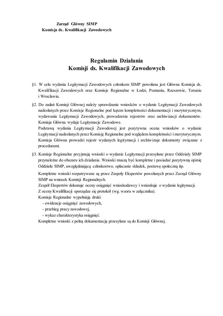 Zarząd Główny SIMP Komisja ds. Kwalifikacji Zawodowych Regulamin Działania Komisji ds. Kwalifikacji Zawodowych §1. W celu wydania Legitymacji Zawodowych członkom SIMP powołana jest Główna Komisja ds. Kwalifikacji Zawodowych oraz Komisje Regionalne w Łodzi, Poznaniu, Rzeszowie, Toruniu i Wrocławiu. §2. Do zadań Komisji Głównej należy sprawdzanie wniosków o wydanie Legitymacji Zawodowych nadesłanych przez Komisje Regionalne pod kątem kompletności dokumentacji i merytorycznym, wydawania Legitymacji Zawodowych, prowadzenia rejestrów oraz archiwizacji dokumentów. Komisja Główna wydaje Legitymacje Zawodowe. Podstawą wydania Legitymacji Zawodowej jest pozytywna ocena wniosków o wydanie Legitymacji nadesłanych przez Komisję Regionalne pod względem kompletności i merytorycznym. Komisja Główna prowadzi rejestr wydanych legitymacji i archiwizuje dokumenty związane z procedurami. §3. Komisje Regionalne przyjmują wnioski o wydanie Legitymacji przesyłane przez Oddziały SIMP przynależne do obszaru ich działania. Wnioski muszą być kompletne i posiadać pozytywną opinię Oddziału SIMP, uwzględniającą członkostwo, opłacanie składek, postawę społeczną itp. Kompletne wnioski rozpatrywane są przez Zespoły Ekspertów powołanych przez Zarząd Główny SIMP na wniosek Komisji Regionalnych. Zespół Ekspertów dokonuje oceny osiągnięć wnioskodawcy i wnioskuje o wydanie legitymacji. Z oceny Kwalifikacji sporządza się protokół (wg. wzoru w załączniku). Komisje Regionalne wypełniają druki: - ewidencje osiągnięć zawodowych, - przebieg pracy zawodowej, - wykaz charakterystyka osiągnięć. Kompletne wnioski z pełną dokumentacją przesyłane są do Komisji Głównej. Rok założenia 1926 Stowarzyszenie Inżynierów i Techników Mechaników Polskich Komisja ds. Kwalifikacji Zawodowych Region: Wrocław, Łódź, Poznań, Toruń, Rzeszów ..................................................... (miejscowość i data) PROTOKÓŁ nr .............../201..... Komisji Kwalifikacyjnej d/s Kwalifikacji Zawodowych - Region .................... działającej na podstawie „Regulaminu Potwierdzania Kwalifikacji Zawodowych Stowarzyszenia Inżynierów i Techników Mechaników Polskich” uchwalonego przez Zarząd Główny SIMP w dn. 16. marca 2008 r. Komisja w składzie; 1. ............................................................................................... 2. ............................................................................................... 3. ............................................................................................... 4. ............................................................................................... Na posiedzeniu w dniu ................................. proponuje wydać Legitymację Zawodową Kol. ............................................................................................................................. ............ w zakresie ............................................................................................................................................................ Podpisy członków Komisji Regionalnej: 1. ............................................................................................... 2. ............................................................................................... 3. ............................................................................................... 4. ............................................................................................... PROPOZYCJA PRZYDZIAŁÓW ODDZIAŁÓW SIMP DO POSZCZEGÓLNYCH PODKOMISJI Bielsko Biała Częstochowa Gliwice WROCŁAW Jelenia Góra Katowice Legnica Opole Wałbrzych Wrocław Gorzów Kalisz Konin POZNAŃ Koszalin Leszno Piła Poznań Szczecin Zielona Góra TORUŃ Olsztyn Słupsk Toruń Włocławek Chełm Gorlice Kielce Kraków RZESZÓW Lublin Rzeszów Sanok Skarżysko Kamienna Stalowa Wola Starachowice Tarnów Zamość Biała Podlaska Białystok Ciechanów Łódź ŁÓDŹ Ostrołęka Piotrków Trybunalski Płock Radom Bydgoszcz Elbląg Gdańsk Siedlce Sieradz Skierniewice Warszawa Zasady uzyskiwania autoryzacji „Legitymacji zawodowej" inżynierów i techników - mechaników członków Stowarzyszenia Inżynierów i Techników Mechaników Polskich. Podstawowym celem uzyskiwania „Legitymacji zawodowej" jest ocena kwalifikacji jej posiadacza w zakresie wykonywanego zawodu w szeroko pojętej branży mechanicznej i pokrewnych wydawanej swoim członkom przez SIMP. Posiadanie „Legitymacji zawodowej" jest potwierdzeniem posiadanych kwalifikacji i świadczy o wysokim standardzie tych kwalifikacji w określonej dziedzinie zawodowej. 1. Legitymacja zawodowa służy do oceny i potwierdzenia posiadanych kwalifikacji. Osiąga się to przez monitorowanie kariery zawodowej, a w szczególności: - podawanie informacji o ukończonych uczelniach (posiadane dyplomy), szkoleniach dodatkowych itp.; - podawanie informacji o zdobytym doświadczeniu zawodowe (gdzie zdobyte, zakres działania, wykonane prace itp.). 2. Wniosek o uzyskanie .Legitymacji zawodowej' 7 składa zainteresowany do właściwego Oddziału SIMP. Oddział po stwierdzeniu kompletności wniosku przesyła go do Komisji Kwalifikacyjnej, 3. Komisja Kwalifikacyjna zebrane wnioski przedstawia Zespołom Oceniającym. Zespoły te powołuje Zarząd Główny SIMP na wniosek Komisji Kwalifikacyjnej. 4. Zespół Oceniający dokonuje merytorycznej oceny kwalifikacji osoby zainteresowanej. Ocena może być poparta rozmową kwalifikacyjną (nieobligatoryjnie). Proponuje się przeprowadzać rozmowy przy pierwszym wystąpieniu o ,Legitymację zawodową". 5. Legitymacja zawodowa" jest ważna przez 5 lat. Po tym okresie posiadacz obowiązany jest poddać się ponownej ocenie. Na wniosek posiadacza legitymacji okres ten może być skrócony. 6. ,Legitymację zawodową" podpisuje Prezes SIMP i Przewodniczący Komisji lub osoby upoważnione.