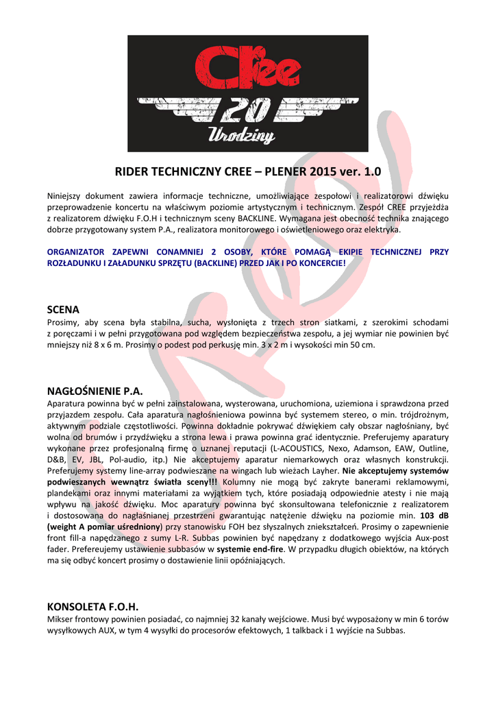 RIDER TECHNICZNY CREE – PLENER 2015 ver. 1.0 Niniejszy dokument zawiera informacje techniczne, umożliwiające zespołowi i realizatorowi dźwięku przeprowadzenie koncertu na właściwym poziomie artystycznym i technicznym. Zespół CREE przyjeżdża z realizatorem dźwięku F.O.H i technicznym sceny BACKLINE. Wymagana jest obecność technika znającego dobrze przygotowany system P.A., realizatora monitorowego i oświetleniowego oraz elektryka. ORGANIZATOR ZAPEWNI CONAMNIEJ 2 OSOBY, KTÓRE POMAGĄ EKIPIE TECHNICZNEJ PRZY ROZŁADUNKU I ZAŁADUNKU SPRZĘTU (BACKLINE) PRZED JAK I PO KONCERCIE! SCENA Prosimy, aby scena była stabilna, sucha, wysłonięta z trzech stron siatkami, z szerokimi schodami z poręczami i w pełni przygotowana pod względem bezpieczeństwa zespołu, a jej wymiar nie powinien być mniejszy niż 8 x 6 m. Prosimy o podest pod perkusję min. 3 x 2 m i wysokości min 50 cm. NAGŁOŚNIENIE P.A. Aparatura powinna być w pełni zainstalowana, wysterowana, uruchomiona, uziemiona i sprawdzona przed przyjazdem zespołu. Cała aparatura nagłośnieniowa powinna być systemem stereo, o min. trójdrożnym, aktywnym podziale częstotliwości. Powinna dokładnie pokrywać dźwiękiem cały obszar nagłośniany, być wolna od brumów i przydźwięku a strona lewa i prawa powinna grać identycznie. Preferujemy aparatury wykonane przez profesjonalną firmę o uznanej reputacji (L-ACOUSTICS, Nexo, Adamson, EAW, Outline, D&B, EV, JBL, Pol-audio, itp.) Nie akceptujemy aparatur niemarkowych oraz własnych konstrukcji. Preferujemy systemy line-array podwieszane na wingach lub wieżach Layher. Nie akceptujemy systemów podwieszanych wewnątrz światła sceny!!! Kolumny nie mogą być zakryte banerami reklamowymi, plandekami oraz innymi materiałami za wyjątkiem tych, które posiadają odpowiednie atesty i nie mają wpływu na jakość dźwięku. Moc aparatury powinna być skonsultowana telefonicznie z realizatorem i dostosowana do nagłaśnianej przestrzeni gwarantując natężenie dźwięku na poziomie min. 103 dB (weight A pomiar uśredniony) przy stanowisku FOH bez słyszalnych zniekształceń. Prosimy o zapewnienie front fill-a napędzanego z sumy L-R. Subbas powinien być napędzany z dodatkowego wyjścia Aux-post fader. Prefereujemy ustawienie subbasów w systemie end-fire. W przypadku długich obiektów, na których ma się odbyć koncert prosimy o dostawienie linii opóźniających. KONSOLETA F.O.H. Mikser frontowy powinien posiadać, co najmniej 32 kanały wejściowe. Musi być wyposażony w min 6 torów wysyłkowych AUX, w tym 4 wysyłki do procesorów efektowych, 1 talkback i 1 wyjście na Subbas. Preferowane konsolety frontowe (cyfrowe): Digidesign VENUE, Avid S3L, Soundraft Vi, Digico, Yamaha (serie PM, QL, CL, M7CL), Allen & Heat iLive, Midas (w tej kolejności). Mikser wraz z peryferiami powinien być umieszczony na stabilnym podeście o wysokości maks. 30 cm i znajdować się centralnie względem sceny i nagłośnienia. Preferowana odległość F.O.H. od frontu sceny to min. 25 m. Stanowisko FOH nie może znajdować się na zabudowanych przyczepach, czy samochodach. Podczas koncertów plenerowych konieczne jest zadaszenie. Alternatywna konsoleta analogowa musi posiadać: minimum 32 kanały mono, pełną 4-punktową korekcję, przełącznik fazy, zasilanie phantom, płynnie strojony filtr górnoprzepustowy, oraz min. 8 podgrup VCA. Ponadto, w przypadku użycia konsolety analogowej, po próbie dźwięku pozostaje ona (wraz z zainsertowanymi procesorami dynamiki) do wyłącznego użytku zespołu. Peryferia w przypadku systemy analogowego FOH: • korektor graficzny na sumie (Ashly, BSS, Klark Teknik) • 4 x bramka (BSS, Dbx, Drawmer, Altair) • 12 x kompresor (BSS, Dbx, Drawmer, Altair) • min. 3 x procesory efektów (Lexicon, t.c. electronic, Yamaha) Nie akceptujemy urządzeń firmy Klark-Teknik Square One, Behringer, Phonic, Alto, Samson. INNE: Prosimy o zapewnienie: • dwustronnego interkomu scena-FOH • odtwarzacz CD/MP3 przy stole FOH • oświetlenie mixera i peryferii • mikrofonu talkback wysłanego do monitorów na scenie (zagwarantuje to szybką i sprawną realizacje próby mikrofonowej) KONSOLETA MONITOROWA Stół monitorowy jest niezbędny. Prosimy o ustawienie go z lewej strony patrząc na scenę z pozycji F.O.H. (patrz plan sceny), na tym samym poziomie, co scena umożliwiająca kontakt wzrokowy z muzykami znajdującymi się na scenie. System monitorowy musi posiadać, co najmniej 7 torów AUX: M 1 – Sebastian (2 monitory) M 2 – Kramek (1 monitor) M 3 – Piano (1 monitor) 2 tory do perkusji: M 4 * - pełnopasmowy drumfill o wysokiej skuteczności z dedykowanym subbasem M 5 - wtyk XLR przy podeście perkusyjnym M 6, 7 * - pełnopasmowy Side Fill o wysokiej skuteczności z subbasami na głośnikach 18". * - Tylko na dużych scenach. Prosimy o konsultacje telefoniczne. Preferujemy firmowe monitory oparte na przetwornikach 15"+1,5" (D&B, Martin Audio, L-ACOUSTICS, EAW, EV, Adamson, Nexo). PLAN SCENY INPUT LISTA: INPUT LISTA CREE - PLENER Nr kanału Źródło Mikrofon Insert 1 Kick drum / Stopa Shure Beta 52, Audix D6, EV 868 Bramka 2 Snare top / Werbel góra Shure SM 57 / Audix I5 Kompresor 3 Snare bottom / Werbel dół Shure SM 57 / Sennheiser 604 Kompresor 4 Hi-hat Mik. pojemnościowy 5 Tom 1 Sennheiser e904, 604, Audix D2 Bramka 6 Tom 2 Sennheiser e904, 604, Audix D2 Bramka 7 Tom 3 Sennheiser e904, 604, Audix D2 Bramka 8 Over head - lewa Mik. pojemnościowy 9 Over head - prawa Mik. pojemnościowy 10 Bass - linia XLR (gniazdo z tyłu wzmacniacza) 11 Bass - mikrofon Shure SM 57 12 1 Gitara L - Sebastain Sennheiser e906, Shure SM 57 13 1 Gitara R - Sebastain Sennheiser e906, Shure SM 57 14 2 Gitara L - Kramek Sennheiser e906, Shure SM 57 15 2 Gitara R - Kramek Sennheiser e906, Shure SM 57 16 Leslie - Dół Własny mikrofon Kompresor 17 Leslie - góra lewa Shure SM 57 Kompresor 18 Leslie - góra prawa Shure SM 57 Kompresor 19 Piano L Dibox BSS/Radial/K