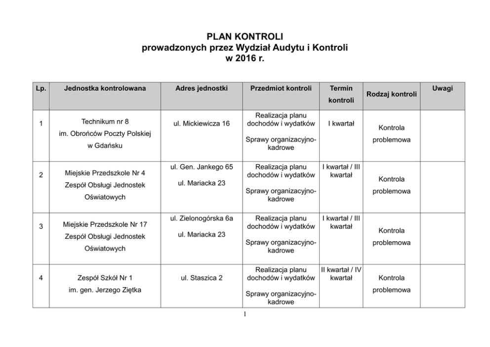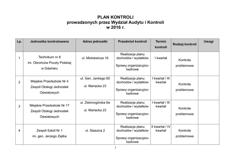 PLAN KONTROLI prowadzonych przez Wydział Audytu i Kontroli w 2016 r. Lp. Jednostka kontrolowana Adres jednostki Przedmiot kontroli Termin kontroli 1 Technikum nr 8 ul. Mickiewicza 16 im. Obrońców Poczty Polskiej 2 Zespół Obsługi Jednostek ul. Gen. Jankego 65 3 Zespół Obsługi Jednostek Zespół Szkół Nr 1 im. gen. Jerzego Ziętka I kwartał / III kwartał Sprawy organizacyjnokadrowe ul. Zielonogórska 6a Realizacja planu dochodów i wydatków I kwartał / III kwartał Sprawy organizacyjnokadrowe Realizacja planu II kwartał / IV dochodów i wydatków kwartał ul. Staszica 2 Sprawy organizacyjnokadrowe 1 Kontrola problemowa ul. Mariacka 23 Oświatowych 4 Realizacja planu dochodów i wydatków Kontrola problemowa ul. Mariacka 23 Oświatowych Miejskie Przedszkole Nr 17 I kwartał Sprawy organizacyjnokadrowe w Gdańsku Miejskie Przedszkole Nr 4 Realizacja planu dochodów i wydatków Rodzaj kontroli Kontrola problemowa Kontrola problemowa Uwagi 5 Urząd Miasta Katowice Pl. Wolności 12 a Urząd Stanu Cywilnego 6 Zespół Obsługi Jednostek ul. Mariacka 23 Oświatowych w Katowicach, w tym wybrane jednostki oświatowe obsługiwane przez ZOJO 7 Miejskie Przedszkole Nr 19 Zespół Obsługi Jednostek XV Liceum Ogólnokształcące I kwartał / III kwartał im. Wesołej Ludwiczki ul. Mariacka 23 Realizacja planu dochodów i wydatków Sprawy organizacyjnokadrowe 2 Kontrola problemowosystemowa Kontrola problemowa I kwartał / III kwartał Sprawy organizacyjnokadrowe ul. Tysiąclecia 27 Oświatowych Realizacja planu dochodów i wydatków ul. Obroki 87 Kontrola problemowa Sprawy organizacyjnokadrowe Miejskie Przedszkole Nr 21 Zespół Obsługi Jednostek Realizacja planu dochodów i wydatków ul. Mariacka 23 im. rtm. Witolda Pileckiego 9 I kwartał Prawidłowość prowadzonych I kwartał / III postępowań w zakresie kwartał realizacji wydatków inwestycyjnych w jednostkach oświatowych miasta Katowice ul. Marcinkowskiego 13 Oświatowych 8 Ocena stanu realizacji zadań związanych z migracją aktów stanu cywilnego do Bazy Usług Stanu Cywilnego Kontrola problemowa I kwartał / III kwartał Kontrola problemowa (wyniki kontroli - do końca marca 2016) 10 Zespół Szkolno-Przedszkolny Nr 1 11 Zespół Obsługi Jednostek Oświatowych 13 14 15 Realizacja planu dochodów i wydatków ul. Grzegorzka 4 Miejskie Przedszkole Nr 23 I kwartał / III kwartał Sprawy organizacyjnokadrowe Zespół Szkolno-Przedszkolny Nr 3 12 Realizacja planu dochodów i wydatków ul. Sportowa 29 problemowa I kwartał / III kwartał Sprawy organizacyjnokadrowe Realizacja planu dochodów i wydatków ul. Dębowa 3 ul. Mariacka 23 Dom Dziecka „Tęcza” ul. Rybnicka 1 Dom Dziecka „Stanica” ul. Plebiscytowa 46 Dom Dziecka „Zakątek” ul. Brynowska 70 a Realizacja planu dochodów i wydatków Realizacja planu dochodów i wydatków 3 Kontrola problemowa I kwartał / III kwartał Sprawy organizacyjnokadrowe Realizacja planu dochodów i wydatków Kontrola Kontrola problemowa I kwartał / III kwartał Kontrola problemowa I kwartał / III kwartał Kontrola problemowa I kwartał / III kwartał Kontrola problemowa 16 Kontrola dokumentacji II kwartał / IV z zakresu kwartał bezpieczeństwa i higieny pracy Wybrane jednostki organizacyjne miasta Katowice (poza oświatowe) Prowadzenie postępowań administracyjnych w sprawach o wydanie pozwoleń na budowę oraz przyjmowanie zgłoszeń o zamiarze przystąpienia do realizacji robót budowlanych 17 ul. Rynek 13 Urząd Miasta Katowice Wydział Budownictwa Miejskie Przedszkole nr 26 18 im. Mariana Mroza Zespół Obsługi Jednostek ul. Zarębskiego 2 ul. Mariacka 23 Oświatowych 19 Zespół Szkół Ogólnokształcących Nr 1 im. Mikołaja Kopernika ul. Sienkiewicza 74 problemowosystemowa II kwartał / IV kwartał Realizacja planu dochodów i wydatków II kwartał / IV kwartał Sprawy organizacyjnokadrowe Realizacja planu dochodów i wydatków II kwartał / IV kwartał Sprawy organizacyjnokadrowe 4 Kontrola Kontrola problemowa Kontrola problemowa Kontrola problemowa 20 Zespół Szkół Technicznych ul. Mikołowska 131 i Ogólnokształcących Nr 2 21 Zespół Szkół Technicznych i Ogólnokształcących Nr 3 im. ul. Harcerzy Września 1939 r. Nr 2 Edwarda Abramowskiego 22 23 Żłobek Miejski Miejskie Przedszkole Nr 30 Zespół Obsługi Jednostek Miejskie Przedszkole Nr 34 im. Jasia i Małgosi Zespół Obsługi Jednostek Oświatowych Realizacja planu dochodów i wydatków II kwartał / IV kwartał Sprawy organizacyjnokadrowe ul. Ordona 3a ul. Gliwicka 157 ul. Mariacka 23 Oświatowych 24 Realizacja planu dochodów i wydatków II kwartał / IV kwartał Sprawy organizacyjnokadrowe ul. Tysiąclecia 84a ul. Mariacka 23 Realizacja planu dochodów i wydatków II kwartał / IV kwartał Realizacja planu dochodów i wydatków II kwartał / IV kwartał Sprawy organizacyjnokadrowe Realizacja planu dochodów i wydatków II kwartał / IV kwartał Sprawy organizacyjnokadrowe 5 Kontrola problemowa Kontrola problemowa Kontrola problemowa Kontrola problemowa Kontrola problemowa 25 Miejskie Przedszkole Nr 52 Zespół Obsługi Jednostek Oświatowych 26 ul. Iłłakowiczówny 15a ul. Mariacka 23 Realizacja planu dochodów i wydatków II kwartał / IV kwartał Sprawy organizacyjnokadrowe Kontrola problemowa Kontrole doraźne ZATWIERDZAM: PREZYDENT MIASTA KATOWICE (-) Marcin Krupa 11 grudnia 2015 r. ..................................... ............................................................................... (pieczątka i podpis Prezydenta Miasta Katowice ) (data) Sporządziła: Elżbieta Solska-Kuchciak 6 7