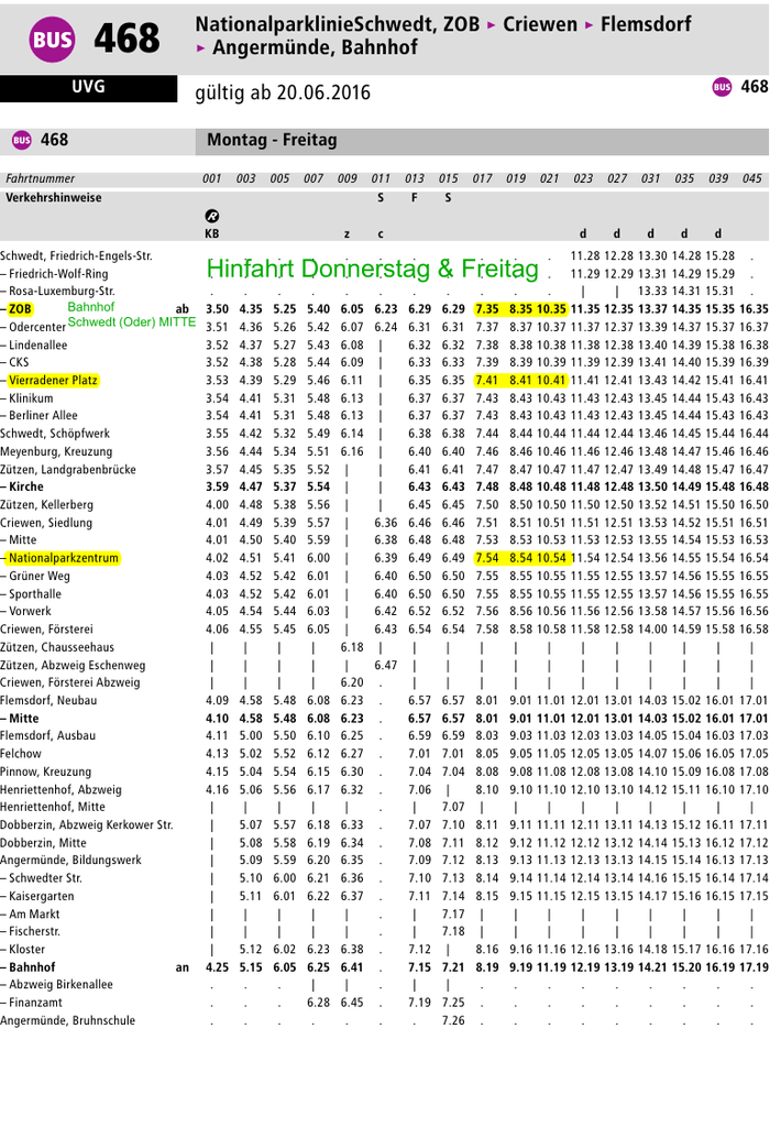 0b 468 UVG 0b 468 Fahrtnummer NationalparklinieSchwedt, ZOB > Criewen > Flemsdorf > Angermünde, Bahnhof 0b 468 gültig ab 20.06.2016 Montag - Freitag 001 003 005 007 009 Verkehrshinweise 0~ KB Schwedt, Friedrich-Engels-Str. . . – Friedrich-Wolf-Ring . . – Rosa-Luxemburg-Str. . . Bahnhof – ZOB ab 3.50 4.35 – Odercenter Schwedt (Oder) MITTE 3.51 4.36 – Lindenallee 3.52 4.37 – CKS 3.52 4.38 – Vierradener Platz 3.53 4.39 – Klinikum 3.54 4.41 – Berliner Allee 3.54 4.41 Schwedt, Schöpfwerk 3.55 4.42 Meyenburg, Kreuzung 3.56 4.44 Zützen, Landgrabenbrücke 3.57 4.45 – Kirche 3.59 4.47 Zützen, Kellerberg 4.00 4.48 Criewen, Siedlung 4.01 4.49 – Mitte 4.01 4.50 – Nationalparkzentrum 4.02 4.51 – Grüner Weg 4.03 4.52 – Sporthalle 4.03 4.52 – Vorwerk 4.05 4.54 Criewen, Försterei 4.06 4.55 Zützen, Chausseehaus | | Zützen, Abzweig Eschenweg | | Criewen, Försterei Abzweig | | Flemsdorf, Neubau 4.09 4.58 – Mitte 4.10 4.58 Flemsdorf, Ausbau 4.11 5.00 Felchow 4.13 5.02 Pinnow, Kreuzung 4.15 5.04 Henriettenhof, Abzweig 4.16 5.06 Henriettenhof, Mitte | | Dobberzin, Abzweig Kerkower Str. | 5.07 Dobberzin, Mitte | 5.08 Angermünde, Bildungswerk | 5.09 – Schwedter Str. | 5.10 – Kaisergarten | 5.11 – Am Markt | | – Fischerstr. | | – Kloster | 5.12 – Bahnhof an 4.25 5.15 – Abzweig Birkenallee . . – Finanzamt . . Angermünde, Bruhnschule . . . . . 5.25 5.26 5.27 5.28 5.29 5.31 5.31 5.32 5.34 5.35 5.37 5.38 5.39 5.40 5.41 5.42 5.42 5.44 5.45 | | | 5.48 5.48 5.50 5.52 5.54 5.56 | 5.57 5.58 5.59 6.00 6.01 | | 6.02 6.05 . . . . . . 5.40 5.42 5.43 5.44 5.46 5.48 5.48 5.49 5.51 5.52 5.54 5.56 5.57 5.59 6.00 6.01 6.01 6.03 6.05 | | | 6.08 6.08 6.10 6.12 6.15 6.17 | 6.18 6.19 6.20 6.21 6.22 | | 6.23 6.25 | 6.28 . 011 013 015 S F S . . . 6.29 6.31 6.32 6.33 6.35 6.37 6.37 6.38 6.40 6.41 6.43 6.45 6.46 6.48 6.49 6.50 6.50 6.52 6.54 | | | 6.57 6.57 6.59 7.01 7.04 7.06 | 7.07 7.08 7.09 7.10 7.11 | | 7.12 7.15 | 7.19 . . . . 6.29 6.31 6.32 6.33 6.35 6.37 6.37 6.38 6.40 6.41 6.43 6.45 6.46 6.48 6.49 6.50 6.50 6.52 6.54 | | | 6.57 6.57 6.59 7.01 7.04 | 7.07 7.10 7.11 7.12 7.13 7.14 7.17 7.18 | 7.21 | 7.25 7.26 z c . . . 6.05 6.07 6.08 6.09 6.11 6.13 6.13 6.14 6.16 | | | | | | | | | | 6.18 | 6.20 6.23 6.23 6.25 6.27 6.30 6.32 | 6.33 6.34 6.35 6.36 6.37 | | 6.38 6.41 | 6.45 . . . . 6.23 6.24 | | | | | | | | | | 6.36 6.38 6.39 6.40 6.40 6.42 6.43 | 6.47 . . . . . . . . . . . . . . . . . . . . 017 019 021 023 d d d d d . . . 7.35 7.37 7.38 7.39 7.41 7.43 7.43 7.44 7.46 7.47 7.48 7.50 7.51 7.53 7.54 7.55 7.55 7.56 7.58 | | | 8.01 8.01 8.03 8.05 8.08 8.10 | 8.11 8.12 8.13 8.14 8.15 | | 8.16 8.19 . . . . . . 8.35 8.37 8.38 8.39 8.41 8.43 8.43 8.44 8.46 8.47 8.48 8.50 8.51 8.53 8.54 8.55 8.55 8.56 8.58 | | | 9.01 9.01 9.03 9.05 9.08 9.10 | 9.11 9.12 9.13 9.14 9.15 | | 9.16 9.19 . . . . . . 10.35 10.37 10.38 10.39 10.41 10.43 10.43 10.44 10.46 10.47 10.48 10.50 10.51 10.53 10.54 10.55 10.55 10.56 10.58 | | | 11.01 11.01 11.03 11.05 11.08 11.10 | 11.11 11.12 11.13 11.14 11.15 | | 11.16 11.19 . . . 11.28 11.29 | 11.35 11.37 11.38 11.39 11.41 11.43 11.43 11.44 11.46 11.47 11.48 11.50 11.51 11.53 11.54 11.55 11.55 11.56 11.58 | | | 12.01 12.01 12.03 12.05 12.08 12.10 | 12.11 12.12 12.13 12.14 12.15 | | 12.16 12.19 . . . 12.28 12.29 | 12.35 12.37 12.38 12.39 12.41 12.43 12.43 12.44 12.46 12.47 12.48 12.50 12.51 12.53 12.54 12.55 12.55 12.56 12.58 | | | 13.01 13.01 13.03 13.05 13.08 13.10 | 13.11 13.12 13.13 13.14 13.15 | | 13.16 13.19 . . . 13.30 13.31 13.33 13.37 13.39 13.40 13.41 13.43 13.45 13.45 13.46 13.48 13.49 13.50 13.52 13.53 13.55 13.56 13.57 13.57 13.58 14.00 | | | 14.03 14.03 14.05 14.07 14.10 14.12 | 14.13 14.14 14.15 14.16 14.17 | | 14.18 14.21 . . . 14.28 14.29 14.31 14.35 14.37 14.39 14.40 14.42 14.44 14.44 14.45 14.47 14.48 14.49 14.51 14.52 14.54 14.55 14.56 14.56 14.57 14.59 | | | 15.02 15.02 15.04 15.06 15.09 15.11 | 15.12 15.13 15.14 15.15 15.16 | | 15.17 15.20 . . . 15.28 15.29 15.31 15.35 15.37 15.38 15.39 15.41 15.43 15.43 15.44 15.46 15.47 15.48 15.50 15.51 15.53 15.54 15.55 15.55 15.56 15.58 | | | 16.01 16.01 16.03 16.05 16.08 16.10 | 16.11 16.12 16.13 16.14 16.15 | | 16.16 16.19 . . . Hinfahrt Donnerstag & Freitag 027 031 035 039 045 . . . 16.35 16.37 16.38 16.39 16.41 16.43 16.43 16.44 16.46 16.47 16.48 16.50 16.51 16.53 16.54 16.55 16.55 16.56 16.58 | | | 17.01 17.01 17.03 17.05 17.08 17.10 | 17.11 17.12 17.13 17.14 17.15 | | 17.16 17.19 . . . 0b 468 Montag - Freitag Fahrtnummer 047 049 051 053 0~ KB Verkehrshinweise Schwedt, Augustiner Tor – ZOB ab – Odercenter – Lindenallee – CKS – Vierradener Platz – Klinikum – Berliner Allee Schwedt, Schöpfwerk Meyenburg, Kreuzung Zützen, Landgrabenbrücke – Kirche Zützen, Kellerberg Criewen, Siedlung – Mitte – Nationalparkzentrum – Grüner Weg – Sporthalle – Vorwerk Criewen, Försterei Flemsdorf, Neubau – Mitte Flemsdorf, Ausbau Felchow Pinnow, Kreuzung Henriettenhof, Abzweig Henriettenhof, Mitte Dobberzin, Abzweig Kerkower Str. Dobberzin, Mitte Angermünde, Bildungswerk – Schwedter Str. – Kaisergarten – Am Markt – Fischerstr. – Kloster Angermünde, Bahnhof an S F c d z KB 0~ . 17.35 17.37 17.38 17.39 17.41 17.43 17.43 17.44 17.46 17.47 17.48 17.50 17.51 17.53 17.54 17.55 17.55 17.56 17.58 18.01 18.01 18.03 18.05 18.08 18.10 | 18.11 18.12 18.13 18.14 18.15 | | 18.16 18.19 . 18.35 18.37 18.38 18.39 18.41 18.43 18.43 18.44 18.46 18.47 18.48 18.50 18.51 18.53 18.54 18.55 18.55 18.56 18.58 19.01 19.01 19.03 19.05 19.08 19.10 | 19.11 19.12 19.13 19.14 19.15 | | 19.16 19.19 . 20.35 20.36 20.37 20.38 20.39 20.41 20.41 20.42 20.44 20.45 20.47 20.48 20.49 20.50 20.51 20.52 20.52 20.54 20.55 20.58 20.58 21.00 21.02 21.04 21.06 | 21.07 21.08 21.09 21.10 21.11 | | 21.12 21.15 22.32 22.35 22.36 22.37 22.37 22.38 22.39 22.39 22.40 22.42 22.43 22.45 22.46 22.47 22.48 22.49 22.50 22.50 22.52 22.53 22.56 22.56 22.58 23.00 23.02 23.04 | | | | | | | | | 23.13 verkehrt nur an Schultagen verkehrt nich