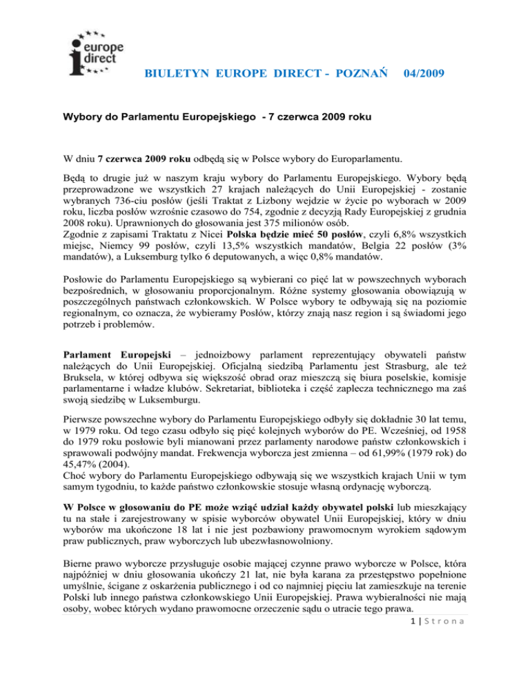 BIULETYN EUROPE DIRECT - POZNAŃ 04/2009 Wybory do Parlamentu Europejskiego - 7 czerwca 2009 roku W dniu 7 czerwca 2009 roku odbędą się w Polsce wybory do Europarlamentu. Będą to drugie już w naszym kraju wybory do Parlamentu Europejskiego. Wybory będą przeprowadzone we wszystkich 27 krajach należących do Unii Europejskiej - zostanie wybranych 736-ciu posłów (jeśli Traktat z Lizbony wejdzie w życie po wyborach w 2009 roku, liczba posłów wzrośnie czasowo do 754, zgodnie z decyzją Rady Europejskiej z grudnia 2008 roku). Uprawnionych do głosowania jest 375 milionów osób. Zgodnie z zapisami Traktatu z Nicei Polska będzie mieć 50 posłów, czyli 6,8% wszystkich miejsc, Niemcy 99 posłów, czyli 13,5% wszystkich mandatów, Belgia 22 posłów (3% mandatów), a Luksemburg tylko 6 deputowanych, a więc 0,8% mandatów. Posłowie do Parlamentu Europejskiego są wybierani co pięć lat w powszechnych wyborach bezpośrednich, w głosowaniu proporcjonalnym. Różne systemy głosowania obowiązują w poszczególnych państwach członkowskich. W Polsce wybory te odbywają się na poziomie regionalnym, co oznacza, że wybieramy Posłów, którzy znają nasz region i są świadomi jego potrzeb i problemów. Parlament Europejski – jednoizbowy parlament reprezentujący obywateli państw należących do Unii Europejskiej. Oficjalną siedzibą Parlamentu jest Strasburg, ale też Bruksela, w której odbywa się większość obrad oraz mieszczą się biura poselskie, komisje parlamentarne i władze klubów. Sekretariat, biblioteka i część zaplecza technicznego ma zaś swoją siedzibę w Luksemburgu. Pierwsze powszechne wybory do Parlamentu Europejskiego odbyły się dokładnie 30 lat temu, w 1979 roku. Od tego czasu odbyło się pięć kolejnych wyborów do PE. Wcześniej, od 1958 do 1979 roku posłowie byli mianowani przez parlamenty narodowe państw członkowskich i sprawowali podwójny mandat. Frekwencja wyborcza jest zmienna – od 61,99% (1979 rok) do 45,47% (2004). Choć wybory do Parlamentu Europejskiego odbywają się we wszystkich krajach Unii w tym samym tygodniu, to każde państwo członkowskie stosuje własną ordynację wyborczą. W Polsce w głosowaniu do PE może wziąć udział każdy obywatel polski lub mieszkający tu na stałe i zarejestrowany w spisie wyborców obywatel Unii Europejskiej, który w dniu wyborów ma ukończone 18 lat i nie jest pozbawiony prawomocnym wyrokiem sądowym praw publicznych, praw wyborczych lub ubezwłasnowolniony. Bierne prawo wyborcze przysługuje osobie mającej czynne prawo wyborcze w Polsce, która najpóźniej w dniu głosowania ukończy 21 lat, nie była karana za przestępstwo popełnione umyślnie, ścigane z oskarżenia publicznego i od co najmniej pięciu lat zamieszkuje na terenie Polski lub innego państwa członkowskiego Unii Europejskiej. Prawa wybieralności nie mają osoby, wobec których wydano prawomocne orzeczenie sądu o utracie tego prawa. 1|Strona BIULETYN EUROPE DIRECT - POZNAŃ 04/2009 Mandatu posła do PE nie można łączyć z m.in. z funkcjami członka rządu państwa członkowskiego, instytucji, organów agencji i trybunałów Unii Europejskiej. Ordynacja wyborcza zakazuje łączenia mandatu m.in. z mandatem posła lub senatora, funkcją członka Rady Ministrów, sekretarza stanu oraz innymi funkcjami, których nie można łączyć z mandatem posła na Sejm lub senatora. Wykaz tych ostatnich określa ustawa o wykonywaniu mandatu posła i senatora, która mówi, że w okresie wykonywania mandatu posłowie i senatorowie nie mogą wykonywać pracy na podstawie stosunku pracy: w Kancelarii Sejmu, w Kancelarii Senatu, w Kancelarii Prezydenta Rzeczypospolitej Polskiej, w Biurze Trybunału Konstytucyjnego, w Najwyższej Izbie Kontroli, w Biurze Rzecznika Praw Obywatelskich, w Biurze Rzecznika Praw Dziecka, w Biurze Krajowej Rady Radiofonii i Telewizji, w Krajowym Biurze Wyborczym, w Państwowej Inspekcji Pracy, w administracji rządowej i samorządu terytorialnego - z wyjątkiem stosunku pracy z wyboru - oraz nie mogą wykonywać pracy w charakterze sędziego i prokuratora, pracownika administracyjnego sądu i prokuratury, a także nie mogą pełnić zawodowej służby wojskowej. Ustawa ogranicza także możliwości prowadzenia działalności gospodarczej i zasiadania we władzach niektórych spółek. Polscy posłowie w Parlamencie W parlamencie 6. kadencji posłowie z Polski zajmowali 54 miejsca. Pod koniec kadencji najliczniejsza polska delegacja znajdowała się w grupie Unii na rzecz Europy Narodów (UEN) - 20 posłów. Następne w kolejności to delegacje w grupie Europejskiej Partii Ludowej - Europejskich Demokratów (EPL-ED) - 15, Europejskich Socjalistów (PES) - 9, Porozumienia Liberałów i Demokratów na rzecz Europy (ALDE) - 6, grupy Niepodległość/Demokracja (IND/DEM) - 3. Jeden poseł nie należał do żadnej grupy Polacy na stanowiskach w Parlamencie Europejskim Stanowiska w Parlamencie Europejskim rozdzielane są między posłów dwukrotnie - na początku i w połowie pięcioletniej kadencji. W całej kadencji czterech posłów z Polski piastowało funkcje wiceprzewodniczących PE, jedna posłanka funkcje kwestora, trzech przewodniczących komisji parlamentarnych (Komisji Spraw Zagranicznych, Komisji Budżetowej, Komisji Petycji), trzech - przewodniczących delegacji parlamentarnych (do spraw stosunków z Ukrainą i dwukrotnie do spraw stosunków z Białorusią). Wpływ prac legislacyjnych Parlamentu Europejskiego na życie codzienne każdego z obywateli Unii jest bardzo wyraźny - większość wprowadzanego dziś prawa w państwach członkowskich to dostosowanie do unijnej legislacji (szacuje się, że 60-80 proc. narodowego prawodawstwa jest ustanawiane na poziomie Wspólnoty). 2|Strona BIULETYN EUROPE DIRECT - POZNAŃ 04/2009 W wielu obszarach decyzyjnych Parlament Europejski posiada takie same uprawnienia legislacyjne jak Rada Ministrów z 27 państw członkowskich. Nawet w takich obszarach ja