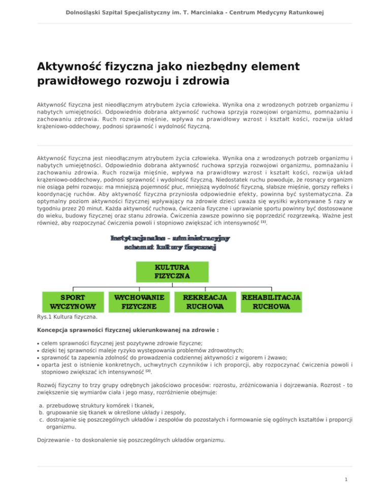 Dolnośląski Szpital Specjalistyczny im. T. Marciniaka - Centrum Medycyny Ratunkowej Aktywność fizyczna jako niezbędny element prawidłowego rozwoju i zdrowia Aktywność fizyczna jest nieodłącznym atrybutem życia człowieka. Wynika ona z wrodzonych potrzeb organizmu i nabytych umiejętności. Odpowiednio dobrana aktywność ruchowa sprzyja rozwojowi organizmu, pomnażaniu i zachowaniu zdrowia. Ruch rozwija mięśnie, wpływa na prawidłowy wzrost i kształt kości, rozwija układ krążeniowo-oddechowy, podnosi sprawność i wydolność fizyczną. Aktywność fizyczna jest nieodłącznym atrybutem życia człowieka. Wynika ona z wrodzonych potrzeb organizmu i nabytych umiejętności. Odpowiednio dobrana aktywność ruchowa sprzyja rozwojowi organizmu, pomnażaniu i zachowaniu zdrowia. Ruch rozwija mięśnie, wpływa na prawidłowy wzrost i kształt kości, rozwija układ krążeniowo-oddechowy, podnosi sprawność i wydolność fizyczną. Niedostatek ruchu powoduje, że rosnący organizm nie osiąga pełni rozwoju: ma mniejszą pojemność płuc, mniejszą wydolność fizyczną, słabsze mięśnie, gorszy refleks i koordynację ruchów. Aby aktywność fizyczna przyniosła odpowiednie efekty, powinna być systematyczna. Za optymalny poziom aktywności fizycznej wpływający na zdrowie dzieci uważa się wysiłki wykonywane 5 razy w tygodniu przez 20 minut. Każda aktywność ruchowa, ćwiczenia fizyczne i uprawianie sportu powinny być dostosowane do wieku, budowy fizycznej oraz stanu zdrowia. Ćwiczenia zawsze powinno się poprzedzić rozgrzewką. Ważne jest również, aby rozpoczynać ćwiczenia powoli i stopniowo zwiększać ich intensywność [1]. Rys.1 Kultura fizyczna. Koncepcja sprawności fizycznej ukierunkowanej na zdrowie : ● ● ● ● celem sprawności fizycznej jest pozytywne zdrowie fizyczne; dzięki tej sprawności maleje ryzyko występowania problemów zdrowotnych; sprawność ta zapewnia zdolność do prowadzenia codziennej aktywności z wigorem i żwawo; oparta jest o istnienie konkretnych, uchwytnych czynników i ich proporcji, aby rozpoczynać ćwiczenia powoli i stopniowo zwiększać ich intensywność [2]. Rozwój fizyczny to trzy grupy odrębnych jakościowo procesów: rozrostu, zróżnicowania i dojrzewania. Rozrost - to zwiększenie się wymiarów ciała i jego masy, rozróżnienie obejmuje: a. przebudowę struktury komórek i tkanek, b. grupowanie się tkanek w określone układy i zespoły, c. dostrajanie się poszczególnych układów i zespołów do pozostałych i formowanie się ogólnych kształtów i proporcji organizmu. Dojrzewanie - to doskonalenie się poszczególnych układów organizmu. 1 Dolnośląski Szpital Specjalistyczny im. T. Marciniaka - Centrum Medycyny Ratunkowej Wyżej wymienione procesy są nierozłącznymi elementami składowymi rozwoju fizycznego organizmu. Rozwój ten jest możliwy dzięki pobieraniu z zewnątrz odpowiednich dawek materiału budulcowego i energetycznego, chociaż nie są to jedyne warunki prawidłowego rozwoju fizycznego jednostki. Charakteryzując rozwój fizyczny dziecka w okresie wczesnoszkolnym uwzględniono takie czynniki jak: mięśnie, stawy, aparat ruchowy, narzędzia wewnętrzne (serce i płuca), przemiana energetyczna. Ruch, wysiłek fizyczny powoduje wiele korzystnych zmian wewnątrz poszczególnych układów organizmu człowieka: ● ● w układzie ruchu- aktywność fizyczna wpływa na mineralizacje kośćca: wzrastanie kości u dzieci: zapobiega i koryguje wady postawy; wzmacnia i stabilizuje stawy; wzmacnia przyczepy, ścięgna i więzadła: następuje przyrost roboczy mięśni, poprawnie ulega przekrwieniu mięśni, zwiększa przekrój i objętość włókien mięśniowych: zwłaszcza napięcie siłę i sprężystość mięśni, dzięki czemu organizm lepiej przystosowuje się do różnych obciążeń. przemiana energetyczna- u dzieci w wyróżnionym okresie znacznie intensywniejsza niż u dorosłych, na skutek większej żywotności rosnących komórek i wysokiego spoczynkowego zapotrzebowania kalorycznego. Aktywność ruchowa, sport jest ściśle powiązana z naszym zdrowiem. Istnieje konieczność harmonijnego i racjonalnego rozwoju człowieka od dzieciństwa po wiek dojrzały. Wiemy, że w zdrowym ciele żyje zdrowy duch, że wychowanie fizyczne, sport ma służyć wszechstronnemu rozwojowi człowieka, ma wychowywać, jednoczyć ludzi [3]. Korzyści wynikających z aktywnego trybu życia jest wiele. Obejmują one min.: układ krwionośny, oddechowy, odpornościowy. Ruch wpływa dobroczynnie również na sferę psychiczną, wspomaga sprawność intelektualną, daje odprężenie, ułatwia procesy adaptacyjne i poprawia samopoczucie. Brak lub zbyt uboga aktywność ruchowa upośledza motoryczność, wydolność fizyczną dziecka, a także zwiększa możliwość występowania chorób cywilizacyjnych (otyłość, choroba wieńcowa, cukrzyca, miażdżyca). Skutkiem spędzania zbyt długiego czasu przed telewizorem i komputerem jest: zmniejszenie zdolności uczenia się przemęczenie fizyczne i psychiczne kłopoty z koncentracją, niechęć do nauki, drażliwość, a nawet agresja [4]. Znany jest i podkreślany w piśmiennictwie pogląd, że na aktywność fizyczną dzieci i młodzieży bardzo duży wpływ mają rodzice, a szczególnie cenne jest uprawianie różnych form ruchu w rodzinie. Poziom aktywności fizycznej młodzieży w czasie wolnym w dużym stopniu zależy od świadomości, ale także poziomu wiedzy i sytuacji materialnej rodziców. Stwierdzono, że dzieci rodziców aktywnych są częściej (niż dzieci rodziców nieaktywnych) aktywne ruchowo. Piramida obrazuje prawidłowy rozkład różnych form aktywności fizycznej pozwalający na utrzymanie dobrej kondycji fizycznej i zdrowia. Formy aktywności znajdujące się na dole piramidy powinny być wykorzystywane częściej (codziennie) niż aktywność znajdująca się bliżej wierzchołka piramidy, czyli czynności niewymagające ak