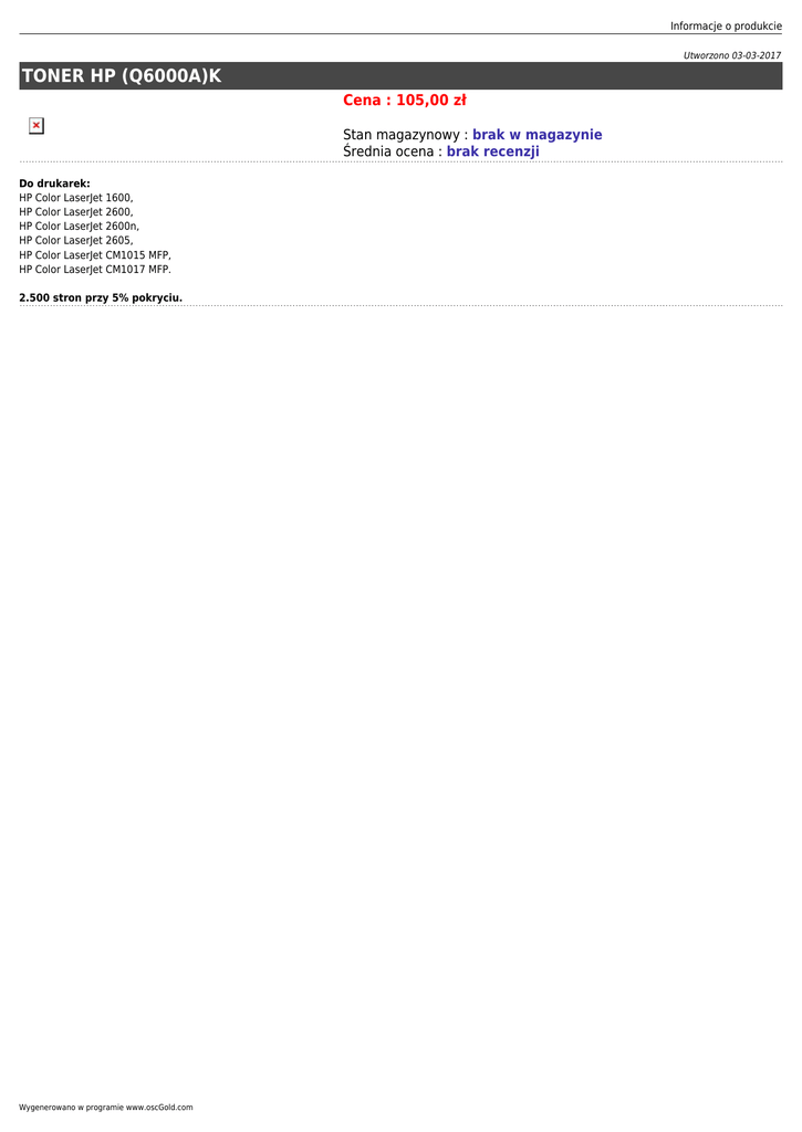 Informacje o produkcie Utworzono 03-03-2017 TONER HP (Q6000A)K Cena : 105,00 zł Stan magazynowy : brak w magazynie Średnia ocena : brak recenzji Do drukarek: HP Color LaserJet 1600, HP Color LaserJet 2600, HP Color LaserJet 2600n, HP Color LaserJet 2605, HP Color LaserJet CM1015 MFP, HP Color LaserJet CM1017 MFP. 2.500 stron przy 5% pokryciu. Wygenerowano w programie www.oscGold.com