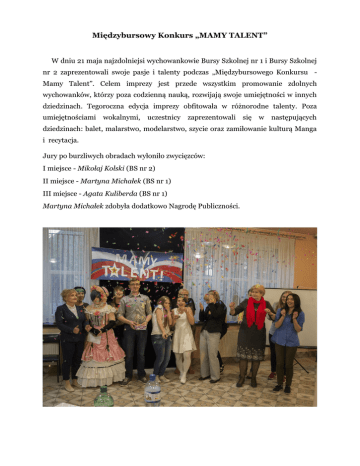 Międzybursowy Konkurs „MAMY TALENT” W dniu 21 maja najzdolniejsi wychowankowie Bursy Szkolnej nr 1 i Bursy Szkolnej nr 2 zaprezentowali swoje pasje i talenty podczas „Międzybursowego Konkursu Mamy Talent”. Celem imprezy jest przede wszystkim promowanie zdolnych wychowanków, którzy poza codzienną nauką, rozwijają swoje umiejętności w innych dziedzinach. Tegoroczna edycja imprezy obfitowała w różnorodne talenty. Poza umiejętnościami wokalnymi, uczestnicy zaprezentowali się w następujących dziedzinach: balet, malarstwo, modelarstwo, szycie oraz zamiłowanie kulturą Manga i recytacja. Jury po burzliwych obradach wyłoniło zwycięzców: I miejsce - Mikołaj Kolski (BS nr 2) II miejsce - Martyna Michałek (BS nr 1) III miejsce - Agata Kuliberda (BS nr 1) Martyna Michałek zdobyła dodatkowo Nagrodę Publiczności.