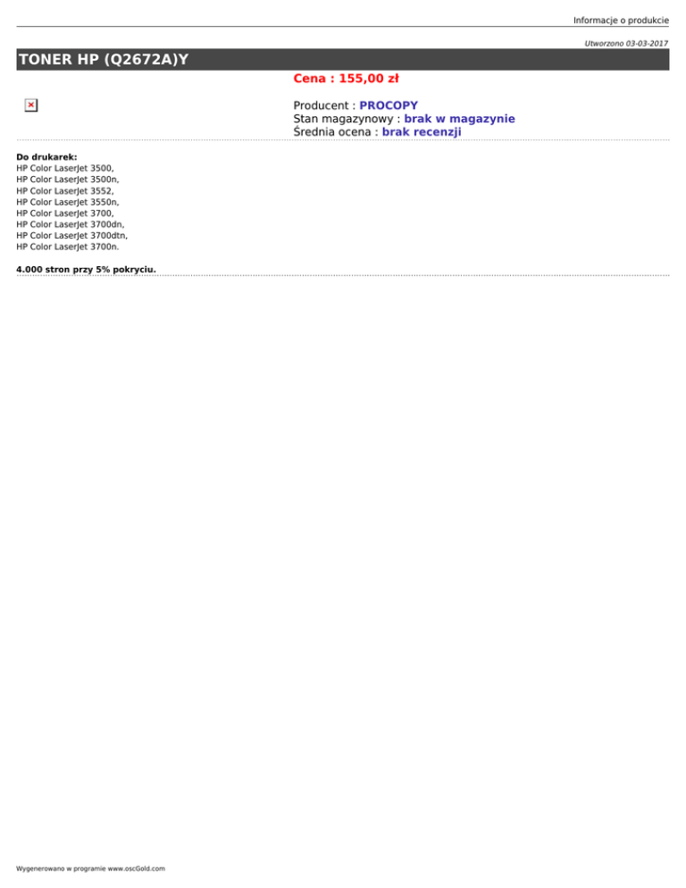 Informacje o produkcie Utworzono 03-03-2017 TONER HP (Q2672A)Y Cena : 155,00 zł Producent : PROCOPY Stan magazynowy : brak w magazynie Średnia ocena : brak recenzji Do drukarek: HP Color LaserJet 3500, HP Color LaserJet 3500n, HP Color LaserJet 3552, HP Color LaserJet 3550n, HP Color LaserJet 3700, HP Color LaserJet 3700dn, HP Color LaserJet 3700dtn, HP Color LaserJet 3700n. 4.000 stron przy 5% pokryciu. Wygenerowano w programie www.oscGold.com