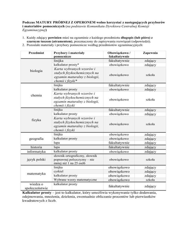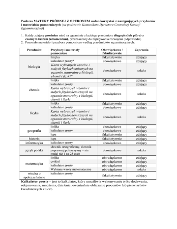 Podczas MATURY PRÓBNEJ Z OPERONEM wolno korzystać z następujących przyborów i materiałów pomocniczych (na podstawie Komunikatu Dyrektora Centralnej Komisji Egzaminacyjnej) 1. Każdy zdający powinien mieć na egzaminie z każdego przedmiotu długopis (lub pióro) z czarnym tuszem (atramentem), przeznaczony do zapisywania rozwiązań (odpowiedzi). 2. Pozostałe materiały i przybory pomocnicze według przedmiotów egzaminacyjnych: Przedmiot biologia Przybory i materiały pomocnicze Obowiązkowo / fakultatywnie Zapewnia linijka fakultatywnie kalkulator prosty* obowiązkowo zdający zdający Karta wybranych wzorów i stałych fizykochemicznych na egzamin maturalny z biologii, chemii i fizyki* obowiązkowo szkoła fakultatywnie obowiązkowo zdający zdający obowiązkowo szkoła fakultatywnie obowiązkowo zdający zdający obowiązkowo szkoła obowiązkowo obowiązkowo obowiązkowo zdający zdający zdający zdający zdający obowiązkowo szkoła obowiązkowo obowiązkowo obowiązkowo obowiązkowo zdający zdający zdający linijka kalkulator prosty chemia Karta wybranych wzorów i stałych fizykochemicznych na egzamin maturalny z biologii, chemii i fizyki linijka kalkulator prosty fizyka geografia historia informatyka język polski matematyka Karta wybranych wzorów i stałych fizykochemicznych na egzamin maturalny z biologii, chemii i fizyki linijka kalkulator prosty lupa lupa kalkulator prosty słownik ortograficzny, słownik poprawnej polszczyzny – nie mniej niż 1 na 25 osób linijka cyrkiel kalkulator prosty Wybrane wzory matematyczne kalkulator prosty fakultatywnie fakultatywnie szkoła wiedza o fakultatywnie zdający społeczeństwie Kalkulator prosty – jest to kalkulator, który umożliwia wykonywanie tylko dodawania, odejmowania, mnożenia, dzielenia, ewentualnie obliczanie procentów lub pierwiastków kwadratowych z liczb.