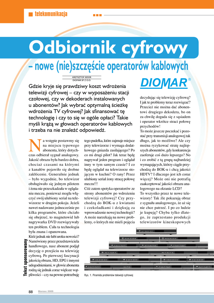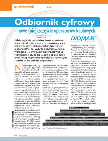 telekomunikacja Odbiornik cyfrowy – nowe (nie)szcz´Êcie operatorów kablowych Krzysztof Sidor DIOMAR Sp. z o.o. Gdzie kryje si´ prawdziwy koszt wdro˝enia telewizji cyfrowej – czy w wyposa˝eniu stacji czołowej, czy w dekoderach instalowanych u abonentów? Jak wybraç optymalnà Êcie˝k´ wdro˝enia TV cyfrowej? Jak sfinansowaç t´ technologi´ i czy to si´ w ogóle opłaci? Takie myÊli krà˝à w głowach operatorów kablowych i trzeba na nie znaleêç odpowiedê. Tekst sponsorowany N a wstępie postawmy się na miejscu typowego abonenta, który dotychczas odbierał sygnał analogowy. Jakość obrazu była bardzo dobra, chociaż czasami na którymś z kanałów pojawiło się drobne zakłócenie. Generalnie jednak – było wygodnie, bo telewizor obsługiwało się jednym pilotem i żona nie przeszkadzała w oglądaniu meczu, ponieważ mogła włączyć swój ulubiony serial na telewizorze w drugim pokoju. Jeżeli nawet nadawano jednocześnie po kilka programów, które chciało się obejrzeć, to magnetowid lub nagrywarka DVD rozwiązywały ten problem. Cała ta technologia była znana i opanowana. Któż jednak nie lubi uroku nowości? Namówiony przez przedstawiciela handlowego, nasz abonent podjął decyzję o przejściu na telewizję cyfrową. Po pierwszej fascynacji jakością obrazu, HD, EPG i innymi udogodnieniami, w głowie abonenta rodzą się jednak coraz większe wątpliwości – czy na pewno potrzebuję 88 Marzec 2009 tego pudełka, które zajmuje miejsce przy telewizorze i wymaga dodatkowego gniazda zasilającego? Po co mi drugi pilot? Jak teraz będę nagrywał jeden program i oglądał inny w tym samym czasie? I co będę oglądał na telewizorze stojącym w kuchni? O rany! Przez ulubiony serial żony stracę połowę meczu!!! Cóż zatem spotyka operatorów ze strony abonentów po wdrożeniu telewizji cyfrowej? Czy przychodzą do BOK-u z kwiatami i czekoladkami i dziękują za wprowadzenie nowej technologii? A może narzekają na nowe problemy, o których nie mieli pojęcia Rys. 1.Piramida problemów telewizji cyfrowej decydując się telewizję cyfrową? I jak te problemy teraz rozwiązać? Przecież nie można dać abonentowi drugiego dekodera, bo on za chwilę dogada się z sąsiadem i operator wkrótce straci połowę przychodów! To może jeszcze poczekać i pozostać przy transmisji analogowej tak długo, jak to możliwe? Ale czy można ryzykować stratę najlepszych abonentów, gdy konkurencja zaoferuje coś dużo lepszego? No i co zrobić z tą grupą najbardziej wymagających, którzy ciągle przychodzą do BOK-u i chcą jakości HDTV? I dlaczego jest ich coraz więcej? Może oni nie potrafią zaakceptować jakości obrazu analogowego na ekranie LCD? To wszystko przez te nowe telewizory! Tak źle pokazują obraz z sygnału analogowego, że aż się nie chce patrzeć. I po co ludzie je kupują? Chyba tylko dlatego, że zaprzestano produkcji telewizorów kineskopowych nej sieci kablowej. Tylko czy to w ogóle jest warte zainteresowania? Cóż, kupić czy nie kupić, obejrzeć zawsze warto. Umawiamy się więc na demonstrację działania tego multipleksera, ale jak testować, to tylko w najtrudniejszych warunkach. Na początek zobaczymy, co się stanie z sygnałem DVB-T na ostatnim kanale K69. W stacji wszystko działa OK, więc przenosimy się do najdalszych zakątków sieci i sprawdzamy, co się wydarzy. Testujemy jakość sygnału w różnych punktach – zarówno po długich kaskadach wzmacniaczy, jak i po transmisji optycznej. DVB-T wszędzie działa bezbłędnie, nawet w najgorszych możliwych warunkach. Sprawdzamy, czy DVB-T pracuje tak samo dobrze w środku pasma w sąsiedztwie kanałów analogowych, cyfrowego dosyłu internetu i innych kanałów cyfrowych DVB-C i DVB-T, ale jakość sygnału jest zawsze OK. Technologia jest zatem odpowiednia, nawet dla dużych instalacji kablowych. Tymczasem dzwoni Pani Kasia z BOK-u informując, że przyszedł do niej abonent zainteresowany telewizją cyfrową, bo na swym telewizorze odebrał „jakiś” sygnał cyfrowy, z kilkoma programami w superjakości. Jak tak dalej pójdzie, to nawet nie da się spokojnie do końca przeprowadzić testów! Z drugiej strony to dobrze, że nawet wówczas gdy prowadzone są testy telewizji cyfrowej, abonenci sami mogą ocenić ten system. No tak, DVB-T ma kilka niezaprzeczalnych zalet, ale czy to rzeczywiście możliwe, żeby telewizja cyfrowa działała bez dekodera? Nowe telewizory same, w trybie automatycznego strojenia znajdują programy cyfrowe, a abonenci przychodzą do BOK- ów i cieszą się, że ich cyfrowy telewizor odbiera programy cyfrowe. A przecież ten dekoder MPEG2 miał nie działać! I wcale nie narzekają, ale proszą o więcej kanałów cyfrowych! Nie ma też problemu wyboru typu dekodera – abonenci ze starszymi Rys. 2. Telewizja cyfrowa bez dekodera odbiornikami TV sami mogą kupić sobie tanie odbiorniki DVB-T. Zadziwia również wysoka odporność na zakłócenia, gdyż ten system wymaga zaledwie 24dB odstępu sygnał/szum, czyli działa po prostu wszędzie w sieci kablowej. Czy wiecie, że firma WISI od ponad 80 lat działa na rynku instalacji radiowych i telewizyjnych? Gdy telewizja kablowa jeszcze nie istniała, pracownicy tej firmy budowali zbiorcze sieci radiowe! To firma z bogatym doświadczeniem, patrząca na potrzeby operatorów kablowych z zupełnie innej perspektywy. Po co narzucać abonentom własne pomysły, skoro można dopasować się do ich potrzeb? Z telewizorów nie trzeba robić monitorów tylko po to, aby później mieć problem z wyborem typów dekoderów cyfrowych, ich zakupem, obsługą serwisową i kosztownym złomowaniem. Prawdziwa ekonomia we wdrożeniu telewizji cyfrowej polega na maksymalnym wykorzystaniu technologii posiadanej przez abonentów. l Marzec 2009 89 Tekst sponsorowany i nie można kupić nic innego. Ale komu przeszkadzała tamta technologia i w czym są lepsze telewizory LCD? Niekompetentni sprzedawcy naopo