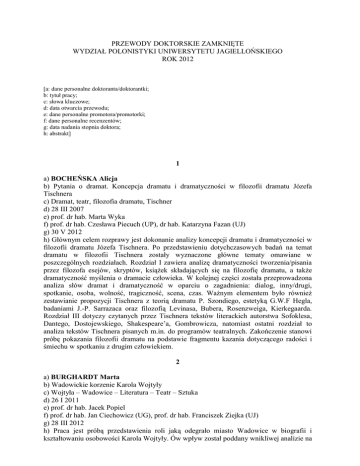 PRZEWODY DOKTORSKIE ZAMKNIĘTE WYDZIAŁ POLONISTYKI UNIWERSYTETU JAGIELLOŃSKIEGO ROK 2012 [a: dane personalne doktoranta/doktorantki; b: tytuł pracy; c: słowa kluczowe; d: data otwarcia przewodu; e: dane personalne promotora/promotorki; f: dane personalne recenzentów; g: data nadania stopnia doktora; h: abstrakt] 1 a) BOCHEŃSKA Alicja b) Pytania o dramat. Koncepcja dramatu i dramatyczności w filozofii dramatu Józefa Tischnera c) Dramat, teatr, filozofia dramatu, Tischner d) 28 III 2007 e) prof. dr hab. Marta Wyka f) prof. dr hab. Czesława Piecuch (UP), dr hab. Katarzyna Fazan (UJ) g) 30 V 2012 h) Głównym celem rozprawy jest dokonanie analizy koncepcji dramatu i dramatyczności w filozofii dramatu Józefa Tischnera. Po przedstawieniu dotychczasowych badań na temat dramatu w filozofii Tischnera zostały wyznaczone główne tematy omawiane w poszczególnych rozdziałach. Rozdział I zawiera analizę dramatyczności tworzenia/pisania przez filozofa esejów, skryptów, książek składających się na filozofię dramatu, a także dramatyczność myślenia o dramacie człowieka. W kolejnej części została przeprowadzona analiza słów dramat i dramatyczność w oparciu o zagadnienia: dialog, inny/drugi, spotkanie, osoba, wolność, tragiczność, scena, czas. Ważnym elementem było również zestawianie propozycji Tischnera z teorią dramatu P. Szondiego, estetyką G.W.F Hegla, badaniami J.-P. Sarrazaca oraz filozofią Levinasa, Bubera, Rosenzweiga, Kierkegaarda. Rozdział III dotyczy czytanych przez Tischnera tekstów literackich autorstwa Sofoklesa, Dantego, Dostojewskiego, Shakespeare’a, Gombrowicza, natomiast ostatni rozdział to analiza tekstów Tischnera pisanych m.in. do programów teatralnych. Zakończenie stanowi próbę pokazania filozofii dramatu na podstawie fragmentu kazania dotyczącego radości i śmiechu w spotkaniu z drugim człowiekiem. 2 a) BURGHARDT Marta b) Wadowickie korzenie Karola Wojtyły c) Wojtyła – Wadowice – Literatura – Teatr – Sztuka d) 26 I 2011 e) prof. dr hab. Jacek Popiel f) prof. dr hab. Jan Ciechowicz (UG), prof. dr hab. Franciszek Ziejka (UJ) g) 28 III 2012 h) Praca jest próbą przedstawienia roli jaką odegrało miasto Wadowice w biografii i kształtowaniu osobowości Karola Wojtyły. Ów wpływ został poddany wnikliwej analizie na wielu płaszczyznach. Począwszy od aspektu zewnętrznego (wyglądu miasta, wiejskiej okolicy i obecności gór), z uwzględnieniem życia gospodarczego i społecznego Wadowic po analizę stosunków panujących między ludnością wyznania katolickiego i mojżeszowego. Na takim tle poznajemy dom Wojtyłów, skromną rodzinę, której nie omijały cierpienia, choroby, śmierć, która nierzadko borykała się z problemami finansowymi. Obfity w wydarzenia i dobrze udokumentowany okres przypada na lata nauki Karola Wojtyły w szkole. Oprócz śledzenia postępów w nauce, realizowanego programu nauczania, kółek zainteresowań, podstaw wychowania patriotyczno-narodowego, religijnego i społecznego poznajemy pierwsze powołanie Wojtyły: do poezji i teatru. Teatr w Wadowicach wówczas przeżywał swoją świetność. Amatorski ruch teatralny kształtował postawę ideową i estetyczną kolejnych pokoleń. W Wadowicach skrystalizowały się poglądy Wojtyły na temat misji sztuki i artysty, posłannictwa chrześcijańskiej kultury narodu, tam odkrył piękno i rolę Słowa. Słowa, z którym mierzył się nie tylko na scenie, ale także w wersach pierwszych utworów. W pracy zostały ukazane wpływy grupy literackiej „Czartak” i wadowickich artystów malarzy i rzeźbiarzy, którzy w znacznej mierze kształtowali wrażliwość artystyczną młodego Wojtyły 3 a) DZIERŻAWIN Katarzyna b) Język Przemyśla i okolic c) polszczyzna południowokresowa, język na pograniczu polsko-ukraińskim d) 30 VI 2010 e) prof. UJ dr hab. Wacław Cockiewicz f) prof. dr hab. Janusz Rieger (UW), dr hab. Monika Szpiczakowska (UJ) g) 5 XII 2012 h) Zasadniczym celem przeprowadzonych badań była próba ustalenia, czy i w jakim stopniu regionalna odmiana języka jest żywa na terenie Przemyśla i okolic, a także poprzez zestawienie z opisami polszczyzny południowokresowej, czy można mówić o wyodrębnieniu z języka kresowego pewnej grupy cech szczególnie charakterystycznych dla mowy przemyślan, a tym samym o istnieniu bazującego na odmianie języka południowokresowego wariantu przemyskiego. Praca składa się z Wstępu, pięciu rozdziałów, Podumowania oraz wyboru tekstów języka mówionego. Rozdział pierwszy poświęcony jest zagadnieniom teoretycznym. Rozdział II prezentuje cechy demograficznospołeczne, które wpłynęły na system badanej gwary. W rozdziale III wskazano wybrane cechy fonetyczne, a w IV morfologiczno-składniowe, którymi język Przemyśla i okolic różni się od polszczyzny ogólnej i które wskazują na jego związek z językiem południowokresowym. W rozdziale V omówiono leksykę regionalną Przemyśla, a dokładniej sposób funkcjonowania regionalizmów południowokresowych w mowie mieszkańców Przemyśla i okolic w przekroju od najmłodszego do najstarszego pokolenia. W podsumowaniu przedstawiono gwarę przemyską w odniesieniu do współczesnych gwar polskich na Ukrainie oraz gwar wschodniej Polski. Opisano tu także różnice w charakterze gwary najmłodszego pokolenia badanych. Do pracy dołączono wybór reprezentatywnych tekstów polszczyzny mówionej mieszkańców Przemyśla i okolic nagranych w sytuacji oficjalnej i nieoficjalnej. 4 a) FRONT Łukasz b) Myśl religijna K.L. Konińskiego i jej konteksty c) literatura, filozofia, historia idei, teologia, myśl religijna d) 28 V 2008 e) prof. dr hab. Jolanta Dudek f) prof. dr hab. Jacek Petelenz-Łukasiewicz (UWr), prof. UJ dr hab. Maciej Urbanowski g) 28 III 2012 h) Rozprawa niniejsza jest próbą syntetycznej charakterystyki myśli religijnej K. L. Konińskiego na tle autobiografii pisarza oraz różnorodnych kontekstów intelektua
