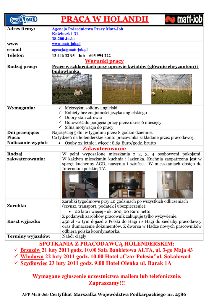 PRACA W HOLANDII Adres firmy: Agencja Pośrednictwa Pracy Matt-Job Kościuszki 31 38-200 Jasło www e-mail Telefon www.matt-job.pl [email protected] 13 446 32 95 lub 605 994 222 Warunki pracy Rodzaj pracy: Prace w szklarniach przy uprawie kwiatów (głównie chryzantem) i budowlanka. Wymagania: Mężczyźni solidny angielski Kobiety bez znajomości języka angielskiego Dobry stan zdrowia Gotowość do podjęcia pracy przez okres 6 miesięcy Silna motywacja do pracy Dni pracujące: Najczęściej 5 dni w tygodniu przez 8 godzin dziennie. Płaca: Co tydzień na holenderskie konto pracownika zakładane przez pracodawcę. Naliczanie wypłat: Osoby 22 letnie i więcej: 8,65 Euro/godz. brutto Zakwaterowanie Rodzaj zakwaterowania: Zarobki: Koszt wyjazdu: Terminy wyjazdów: W pełni wyposażone mieszkania z 2, 3, 4 osobowymi pokojami. W każdym mieszkaniu kuchnia i łazienka. Kuchnia zaopatrzona jest w sprzęt kuchenny AGD, naczynia i sztućce. W mieszkaniach dostęp do Internetu i polskiej TV. Zarobki tygodniowe przy 40 godzinach po wszystkich odliczeniach (czynsz, transport, podatek i ubezpieczenie): 22 lata i więcej - ok. 200, 00 Euro netto Z podanych zarobków pracownik zakupuje tylko wyżywienie. 450 zł -w tym dojazd z Polski do Hagi i z Hagi do siedziby pracodawcy oraz tłumaczenie dokumentów. Z dworca w Hadze nowych pracowników odbiera polska koordynatorka. Nabór ciągły SPOTKANIA Z PRACODAWCĄ HOLENDERSKIM: Brzozów 21 luty 2011 godz. 10.00 Sala Bankietowa ALTA, ul. 3-go Maja 43 Włodawa 22 luty 2011 godz. 10.00 Hotel „Czar Polesia”ul. Sokołowa4 Szydłowiec 23 luty 2011 godz. 9.00 Hotel Oleńka ul. Barak 1A Wymagane zgłoszenie uczestnictwa mailem lub telefonicznie. Zapraszamy!!! APP Matt-Job Certyfikat Marszałka Województwa Podkarpackiego nr. 2586