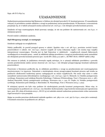 Sygn. akt II Cz 831/14 UZASADNIENIE Zaskarżonym postanowieniem Sąd Rejonowy w Kaliszu nie obciążył powoda R. H. kosztami procesu. W uzasadnieniu wskazał, że powództwo zostało oddalone z uwagi na podniesiony zarzut przedawnienia. W literaturze i orzecznictwie przyjmuje się, że w takich sytuacjach można zastosować art. 102 k.p.c. i nie obciążyć powoda kosztami procesu. Zażalenie od tego rozstrzygnięcia złożył pozwany uznając, że nie ma podstaw do zastosowania art. 102 k.p.c. w niniejszej sprawie. Powód wniósł o oddalenie zażalenia. Sąd Okręgowy zważył, co następuje: Zażalenie zasługuje na uwzględnienie. Należy podkreślić, że powód przegrał sprawę w całości. Zgodnie więc z art. 98 k.p.c. powinien zwrócić koszty przeciwnikowi w całości. Art. 102 k.p.c. stanowi wyjątek od wyżej wskazanej reguły i nie można tego wyjątku interpretować rozszerzająco. Prawdą jest że Sąd Najwyższy w niektórych - wyjątkowych stanach faktycznych wynikających ze stosunku pracy - uznał, że oddalenie takiego powództwa z uwagi na przedawnienie może uzasadniać nie obciążanie powoda kosztami procesu (por. wyrok SN z dnia 5.12.1967 r., III PRN 78/67, OSNCP 1968/1/185). Nie oznacza to jednak, że judykatura stworzyła regułę mówiąca, że w sytuacji oddalenie powództwa z powodu zarzutu przedawnienia należy zawsze stosować art. 102 k.p.c. i nie obciążać przegrywającego kosztami należnymi przeciwnikowi. Przeciwnie w literaturze podkreśla się, że oddalenie powództwa z uwagi na przedawnienie jest rozstrzygnięciem merytorycznym i to typowym. Natomiast o nieobciążaniu strony przegrywającej kosztami procesu sąd orzeka na podstawie okoliczności konkretnej sprawy zasługujących na miano wyjątkowych. Nie może więc samo w sobie uzasadniać zastosowania dobrodziejstwa wynikającego z art. 102 k.p.c. (por G. Misiurek /w/ Kodeks postępowania cywilnego. Komentarz pod redakcją Henryka Doleckiego i Tadeusza Wiśniewskiego, Tom I, Warszawa 2011, s. 387; Andrzej Daczyński, Koszty postępowania cywilnego, Warszawa 201, s. 241; H. Ciepła /w/ Kodeks postępowania cywilnego. Komentarz pod redakcją A. Marciniaka i K. Piaseckiego, Tom I, Warszawa 2014, s. 404). W niniejszej sprawie nie było więc podstaw do nieobciążania powoda kosztami postępowania. Mimo więc, że rozstrzygnięcie na podstawie art. 102 k.p.c. ma charakter dyskrecjonalny i jego kontrola instancyjna jest ograniczona (por. post. SN z dnia 18 kwietnia 2013 r., III CZ 75/12) należało zmienić zaskarżone postanowienie wobec naruszenia reguł zawartych w tym przepisie. Mając na uwadze powyższe okoliczności należało zgodnie z art. 385 w zw. z art. 397 § 2 k.p.c., orzec jak w sentencji. O kosztach orzeczono na podstawie art. 98 k.p.c.