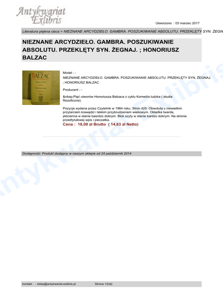 Utworzono : 03 marzec 2017 Literatura piękna obca > NIEZNANE ARCYDZIEŁO. GAMBRA. POSZUKIWANIE ABSOLUTU. PRZEKLĘTY SYN. ŻEGN NIEZNANE ARCYDZIEŁO. GAMBRA. POSZUKIWANIE ABSOLUTU. PRZEKLĘTY SYN. ŻEGNAJ. ; HONORIUSZ BALZAC s i r b Model : - NIEZNANE ARCYDZIEŁO. GAMBRA. POSZUKIWANIE ABSOLUTU. PRZEKLĘTY SYN. ŻEGNAJ. ; HONORIUSZ BALZAC Producent : - i l x Pięć utworów Honoriusza Balzaca z cyklu Komedia ludzka ( studia filozoficzne). E t Pozycja wydana przez Czytelnik w 1964 roku. Stron 425. Obwoluta z niewielkim przytarciem krawędzi i lekkim przybrudzeniem wiekowym. Okładka twarda, płócienna w stanie basrdzo dobrym. Blok szyty w stanie bardzo dobrym. Na stronie przedtytułowej wpis i pieczatka. a i r a w k y t n A Cena : 18,00 zł Brutto ( 14,63 zł Netto) Dostępność: Produkt dostępny w naszym sklepie od 24 październik 2014 kontakt : - [email protected] Strona 1/{nb}