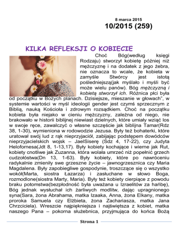 8 marca 2015 10/2015 (259) KILKA REFLEKSJI O KOBIECIE Choć Bóg(według księgi Rodzaju) stworzył kobietę później niż mężczyznę i na dodatek z jego żebra, nie oznacza to wcale, że kobieta w zamyśle Stwórcy jest istotą pośledniejszą(jak myślało i myśli być może wielu panów). Bóg mężczyzną i kobietą stworzył ich. Różnica płci była od początku w Bożych planach. Dzisiejsze„ mieszanie w głowach”, w systemie wartości w myśl ideologii gender jest czymś sprzecznym z Biblią, nauką Kościoła i zdrowym rozsądkiem. Choć na początku kobieta była niejako w cieniu mężczyzny, zależna od niego, nie brakowało w historii biblijnej niewiast dzielnych, które umiały wziąć los w swoje ręce, zawalczyć o własne szczęście jak biblijna Tamar(Rdz 38, 1-30), wymieniona w rodowodzie Jezusa. Były też bohaterki, które uratował swój lud z rąk nieprzyjaciół, zabijając podstępem dowódców nieprzyjacielskich wojsk – JaelSiserę (Sdz 4, 17-22), czy Judyta Helofornesa(Jdt 8, 1-13,17). Były kobiety kochające i wierne jak Rut, kobiety cnotliwe jak Zuzanna, która wolała umrzeć niż popełnić grzech cudzołóstwa(Dn 13, 1-63). Były kobiety, które po nawróceniu radykalnie zmieniły swe grzeszne życie – jawnogrzesznica czy Maria Magdalena. Były zapobiegliwe gospodynie, troszczące się o wszystko wokół(Marta, siostra Łazarza) i zasłuchane w słowo Boga, rozmodlone(siostra Marty, Maria). Były też kobiety cierpiące z powodu braku potomstwa(bezpłodność była uważana u Izraelitów za hańbę), Bóg jednak wysłuchał ich żarliwych modlitw, dając upragnionego syna(Sara, żona Abrahama, matka Izaaka, Anna, żona Elkany, matka proroka Samuela czy Elżbieta, żona Zachariasza, matka Jana Chrzciciela). Wreszcie najpiękniejsza i najświętsza z kobiet, matka naszego Pana – pokorna służebnica, przyjmująca do końca Bożą Strona 1 Tabor wolę. Ale były też kobiety zdradzieckie, niszczące – Dalila, zguba Samsona(Sdz 16, 4-21), czy Salome, pasierbica Heroda Antypasa, która za swój taniec zażądała głowy Jana Chrzciciela(Mt 14, 1-11). Każdą kobietę Bóg stawia przed możliwością wyboru. Możemy naśladować biblijne bohaterki w ich pokorze, męstwie, niezłomności, trosce o innych – możemy też wybrać inaczej. Kobieta winna dawać życie, stać na jego straży, a nie uśmiercać. Jej szczególnym charyzmatem jest miłość, wyrażająca się w trosce o innych, o dzieci, o mężczyzn, jakich Bóg stawia na jej drodze. Kobieta może i powinna łagodzić obyczaje(jak okropny jest obraz kobiety, dziewczyny przeklinającej jak przysłowiowy szewc czy paradującej po ulicy z papierosem w zębach). Być w pełni kobietą dziś jest niesłychanie trudno. Sytuacja ekonomiczna zmusza piękniejszą płeć do podjęcia pracy, na dodatek często panie muszą ponosić główny ciężar prowadzenia domu. Może dlatego też dziś tak wiele kobiet ucieka przed macierzyństwem bądź ogranicza się do posiadania tylko jednego dziecka. Trudno jest też zrealizować w pełni swoje powołanie, trudno je rozeznać w sytuacji, kiedy w dziedzinie moralności, tożsamości płci panuje totalny mętlik. Każda kobieta pragnie być piękna, podziwiana, kochana. Wiele pań ma problem z akceptacją swojego wyglądu, zwłaszcza, kiedy naoglądają się reklam przedstawiających nadzwyczaj szczupłe, piękne, zadbane modelki, celebrytki. Kochane panie, nie traćmy ducha i radości, nie dajmy się zwariować. Prawdziwe piękno jest w nas samych, w naszym wnętrzu. Trzeba tylko w to uwierzyć. Szczęśliwa kobieta w wieku 50+ w rozmiarze XL ~~*~~ KOMRNTARZ NA II NIEDZIELĘ WIELKIEGO POSTU Troska o świątynię ( J 2,13-25) Denerwują cię prymitywne dekoracje z papieru i styropianu. Marzysz o wypełnionym anielską muzyką przedsionku nieba. Oddzielasz od czci i wiary w Boga (Twoim zdaniem) pobożność na pokaz. Domagasz się na forach wystawienia z kościołów stolików z prasą i rezygnacji z niedzielnej kolekty. Dlatego, że pożera Cię gorliwość o dom Boży. Nie chcesz, by był targowiskiem tandety i obłudy, miejscem handlu świętością. Potem tkwisz godzinami przed epatującym kolejnymi zabójstwami ekranem. W niedzielne popołudnie Strona 2 8 marca 2015 relaksujesz się, wędrując z wózkiem po hipermarkecie. Nadstawiasz chciwie ucho na kolejny pikantny kawał. Każdego wieczoru Biblia przegrywa z lekturą znacznie ciekawszego tabloidu, a krzyż już dawno przestał być mocą, mądrością i punktem odniesienia. Nie przeraża cię, że twoje serce niepostrzeżenie zamienia się w targowisko. OGŁOSZENIA DUSZPASTERSKIE III NIEDZIELA WIELKIEGO POSTU (8 marca 2015) 1. Nabożeństwa w ciągu tygodnia: - w poniedziałek – Nowenna ku czci św. Rafała Kalinowskiego - we wtorek – (o 17.45) Koronka do Bożego Miłosierdzia. - w środę o 17.40 Nowenna do Matki Bożej Królowej Jezior. Po Mszy św. wieczornej katecheza dla dorosłych (temat: Dekalog – 3 przykazanie). - w piątek Droga Krzyżowa o godz. 17.20. W niedziele o godz. 17.30 nabożeństwo Gorzkich Żali z wystawieniem Najświętszego Sakramentu i kazaniem pasyjnym. 2. Rekolekcje wielkopostne rozpoczną się w naszej parafii 19 marca i będą trwały do V niedzieli W. Postu. Wygłosi je Ks. Krzysztof Świętoń, Salwatorianin z Węgorzewa. 3. Zapowiedzi przedślubne: Barbara Danuta Podgórska, wyz. rzym.-kat., zam. Wilkasy Arkadiusz Robert Gruchot, wyz. rzym.-kat., zam. Wilkasy (zap.1) Kto wiedziałby o przeszkodach zawarcia małżeństwa wyżej wymienionych osób zobowiązany jest w sumieniu powiadomić tutejszy urząd parafialny. 4. Prosimy osoby, które chciałyby przyjąć relikwie św. Jana Pawła II by zgłosiły się do zakrystii. 5. Tradycyjnie przed Niedzielą Palmową będziemy mogli nabyć palmy przed wejściem do kościoła. Ofiary z palm w tym roku będą przeznaczone na kaplicę w Gorazdowie (remont). Strona 3 Tabor INTENCJE MSZALNE (9 marca – 15 marca 2015 r.) Pon