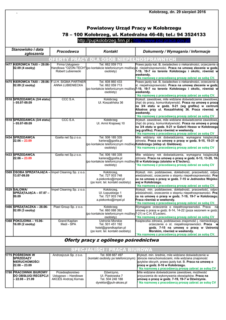 Kołobrzeg, dn. 29 sierpień 2016 Powiatowy Urząd Pracy w Kołobrzegu 78 – 100 Kołobrzeg, ul. Katedralna 46-48; tel.: 94 3524133 http://pupkolobrzeg.finn.pl ; http://www.psz.praca.gov.pl/ Stanowisko i data zgłoszenia Pracodawca Kontakt Dokumenty / Wymagania / Informacje OFERTY PRACY DLA OSÓB NIEPEŁNOSPRAWNYCH 1477 KIEROWCA TAXI – 29.06Firma UsługowoTel. 662 059 713 Prawo jazdy kat. B, świadectwo o niekaralności, orzeczenie o 02.09 (4 osoby) Handlowa "OZON-TECH" (po kontakcie telefonicznym możliwy st. niepełnosprawności. Praca na umowę zlecenie w godz. Robert Lubieniecki osobisty) 7-19, 19-7 na terenie Kołobrzegu i okolic, również w weekendy. * Na rozmowę z pracodawcą proszę zabrać ze sobą CV. 1475 KIEROWCA TAXI – 29.06- F.U.H. SIGMA PARTNER Tel. 608 860 433 Prawo jazdy kat. B, świadectwo o niekaralności, orzeczenie o 02.09 (2 osoby) ANNA LUBIENIECKA Tel. 662 059 713 st. niepełnosprawności. Praca na umowę zlecenie w godz. (po kontakcie telefonicznym możliwy 7-19, 19-7 na terenie Kołobrzegu i okolic, również w osobisty) weekendy. * Na rozmowę z pracodawcą proszę zabrać ze sobą CV. 1518 SPRZEDAWCA (3/4 etatu) CCC S.A. Kołobrzeg Wykszt. zawodowe, mile widziane doświadczenie zawodowe, – 05.07-09.09 Ul. Koszalińska 36 chęć do pracy, komunikatywność. Praca na umowę o pracę na 3/4 etatu w godz. 9-21 (wg grafiku) w centrum Albatros przy ul. Koszalińskiej 36. Praca również w weekendy. * Na rozmowę z pracodawcą proszę zabrać ze sobą CV 1518 SPRZEDAWCA (3/4 etatu) CCC S.A. Kołobrzeg Wykszt. zawodowe, mile widziane doświadczenie zawodowe, – 05.07-09.09 Ul. Armii Krajowej 10 chęć do pracy, komunikatywność. Praca na umowę o pracę na 3/4 etatu w godz. 9-21 w Galerii Hosso w Kołobrzegu (wg grafiku). Praca również w weekendy. * Na rozmowę z pracodawcą proszę zabrać ze sobą CV 1434 SPRZEDAWCA Gzella net Sp.z o.o. Tel. 506 185 335 Mile widziany rok doświadczenia, wymagana książeczka 22.06 – 23.09 [email protected] zdrowia. Praca na umowę o pracę w godz. 9-15, 15-21 w (po kontakcie telefonicznym możliwy Kołobrzegu (sklep ul. Giełdowa). osobisty) * Na rozmowę z pracodawcą proszę zabrać ze sobą CV 1433 SPRZEDAWCA 22.06 – 23.09 Gzella net Sp.z o.o. 1569 OSOBA SPRZATAJĄCA – Impel Cleaning Sp. z o.o. 13.07-09.09 Tel. 506 185 335 Mile widziany rok doświadczenia, wymagana książeczka [email protected] zdrowia. Praca na umowę o pracę w godz. 6-13, 13-20, 10(po kontakcie telefonicznym możliwy 18 w Kołobrzegu (stoisko w E’leclerc). osobisty) * Na rozmowę z pracodawcą proszę zabrać ze sobą CV Kołobrzeg, Tel. 727 003 748 [email protected] (po kont. tel. kontakt osobisty) Wykszt. min. podstawowe, dokładność, pracowitość, odpowiedzialność, orzeczenie o stopniu niepełnosprawności. Praca na umowę o pracę w godz. 7-15 w Jednostce Wojskowej w Kołobrzegu. * Na rozmowę z pracodawcą proszę zabrać ze sobą CV. 1529 SALOWA/ Impel Cleaning Sp. z o.o. Kołobrzeg, Wykszt. min. podstawowe, dokładność, pracowitość, odpoSPRZĄTAJĄCA – 07.07 – Ul. Łopuskiego 1 wiedzialność, orzeczenie o stopniu niepełnosprawności. Pra09.09 Tel. 727 003 748 ca na umowę o pracę w godz. 7-19, 19-7 w Kołobrzegu. [email protected] Praca również w weekendy. * Na rozmowę z pracodawcą proszę zabrać ze sobą CV. 1466 SPRZĄTACZKA – 28.06Piast Group Sp. z o.o. Kołobrzeg Wymagane orzeczenie o niepełnosprawności. Praca na 02.09 (3 osoby) Tel. 660 088 392 umowę o pracę w godz. 6-14, 14-22 (poza sezonem w godz. (po kontakcie telefonicznym możliwy 7-21) w C.H. E'Leclerc. osobisty) * Na rozmowę z pracodawcą proszę zabrać ze sobą CV 1368 POKOJOWA – 15.06Grand Kapitan Ustronie Morskie Książeczka zdrowia, podstawowa znajomość j. niemieckiego, 16.09 (2 osoby) Medi - SPA Tel. 501 451 192 orzeczenie o st. niepełnosprawności. Praca w [email protected] godz. 7-15 na umowę o pracę w Ustroniu (po kont. tel. kontakt osobisty) Morskim, również w weekendy. * Na rozmowę z pracodawcą proszę zabrać ze sobą CV. Oferty pracy z ogólnego pośrednictwa SPECJALIŚCI / PRACA BIUROWA 1775 POŚREDNIK W SPRZEDAZY NIERUCHOMOŚCI 22.08 – 23.09 Andrzejczuk Sp. z o.o. 1780 PRACOWNIK BIUROWY DO OBSŁUGI RECEPCJI – 22.08 – 21.09 Przedsiębiorstwo Usługowo – Handlowe AKCES Andrzej Kornas Tel. 608 667 497 Wykszt. min. średnie, mile widziane doświadczenie w (kontakt osobisty po telefonicznym) obrocie nieruchomościami, mile widziana znajomość języków obcych, prawo jazdy kat. B. Praca na umowę o pracę w godz. 8-16 w Kołobrzegu. * Na rozmowę z pracodawcą proszę zabrać ze sobą CV Dźwirzyno, Mile widziane doświadczenie zawodowe, możliwość Ul. Piastowska 7 przyuczenia do wykonywania obowiązków. Praca na Tel. 504 248 188 umowę o pracę w godz. 7-19, 19-7 w Dźwirzynie. [email protected] * Na rozmowę z pracodawcą proszę zabrać ze sobą CV 1750 INFORMATYK/ ADMINISTRATOR SIECI – 12.08 -11.09 Troton Sp.z o.o. 1680 ASYSTENT ZARZĄDU 02.08 – 23.09 Zdrojowa Hotels Sp. z o.o. 1826 SPECJALISTA DS. REZERWACJI I SPRZEDAŻY Zdrojowa Hotels Sp. z o.o. 1591 SPECJALISTA DS. KADR I PŁAC – 18.07-26.08 1830 KIEROWNIK OŚRODKA – 25.08 – 24.09 PUHP PILAWA Eugeniusz Pilawa WODNIK H i M Rudniccy Sp.J. 1576 ZASTĘPCA Stowarzyszenie KIEROWNIKA Wspierania i Rozwoju SCHRONISKA DLA Schroniska dla Zwierząt w ZWIERZĄT – 15.07-16.09 Kołobrzegu REKS 1581 MISTRZ DZIAŁU UTRZYMANIA RUCHU – 18.07-16.09 1542 INSPEKTOR WETERYNARYJNY 07.07-23.09 (2 osoby) 1467 PRACOWNIK DZIAŁU LOGISTYKI/SPEDYTOR – 29.06-02.09 1132 KOSZTORYSANT – 20.05-16.09 KORAL S.A. Inspekcja Weterynaryjna Powiatowy Inspektorat Weterynarii w Kołobrzegu MARLIN Anna i Piotr Topczewscy Sp. j. Kerd Sp. z o.o. 1538 SPECJALISTA DS. BG Production Sp. z oo. HACCP / IFS / BRC W BRANŻY PRZETWÓRSTWA RYBNEGO – 07.07-09.09 (2 osoby) 1051 SPECJALISTA DS. PU Holtur Sp. z o.o. TECHNICZNYCH – 13.0516.09 1105 PRACOWNIK SOCJALNY Dom Pomocy Społecznej 