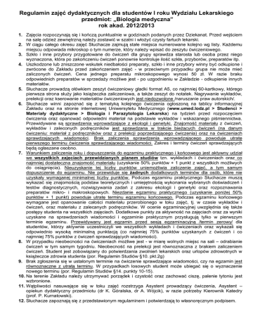 Regulamin zajęć dydaktycznych dla studentów I roku Wydziału Lekarskiego przedmiot: „Biologia medyczna” rok akad. 2012/2013 1. Zajęcia rozpoczynają się i kończą punktualnie w godzinach podanych przez Dziekanat. Przed wejściem na salę odzież zewnętrzną należy zostawić w szatni i włożyć czysty fartuch lekarski. 2. W ciągu całego okresu zajęć Słuchacze zajmują stałe miejsca numerowane kolejno wg listy. Każdemu miejscu odpowiada mikroskop o tym numerze, który należy wpisać do zeszytu ćwiczeniowego. 3. Szkło i inne przybory przygotowane do ćwiczeń dla grupy sprawdza starosta lub osoba przez niego wyznaczona, która po zakończeniu ćwiczeń ponownie kontroluje ilość szkła, przyborów, preparatów itp. 4. Uszkodzone lub zniszczone wskutek niedbałości preparaty, szkło i inne przybory winny być odkupione i zwrócone do Zakładu przed zakończeniem zajęć - w przeciwnym przypadku grupa nie może mieć zaliczonych ćwiczeń. Cena jednego preparatu mikroskopowego wynosi 50 zł. W razie braku odpowiednich preparatów w sprzedaży możliwe jest - po uzgodnieniu w Zakładzie - odkupienie innych materiałów. 5. Słuchacze prowadzą ołówkiem zeszyt ćwiczeniowy gładki format A5, co najmniej 60-kartkowy, którego pierwsza strona służy jako książeczka zaliczeniowa, a także zeszyt do notatek. Nagrywanie wykładów, prelekcji oraz kserowanie materiałów ćwiczeniowych jest niedozwolone /naruszanie praw autorskich/. 6. Słuchacze winni zapoznać się z tematyką kolejnego ćwiczenia ogłoszoną na tablicy informacyjnej Zakładu oraz na stronie internetowej Uniwersytetu Medycznego (www.umed.lodz.pl > Studenci > Materiały dydaktyczne > Biologia i Parazytologia Lekarska) na tydzień przed rozpoczęciem ćwiczenia oraz opanować odpowiedni materiał na podstawie wykładów i wskazanego piśmiennictwa. Przewidywane są sprawdzenia wprowadzające z ekologii i genetyki. Znajomość materiału z ćwiczeń, wykładów i zaleconych podręczników jest sprawdzana w trakcie bieżących ćwiczeń (na danym ćwiczeniu: materiał z podręczników oraz z prelekcji poprzedzającego ćwiczenia) oraz na ćwiczeniach sprawdzających wiadomości. Brak zaliczenia sprawdzenia wprowadzającego powoduje utratę pierwszego terminu ćwiczenia sprawdzającego wiadomości. Zakres i terminy ćwiczeń sprawdzających będą ogłaszane osobno. 7. Warunkiem zaliczenia roku i dopuszczenia do egzaminu praktycznego i końcowego jest aktywny udział we wszystkich zajęciach przewidzianych planem studiów tzn. wykładach i ćwiczeniach oraz co najmniej dostateczna znajomość materiału (uzyskanie 50% punktów + 1 punkt z wszystkich możliwych do osiągnięcia). Nieuzyskanie tej liczby punktów uniemożliwia zaliczenie zajęć, a tym samym dopuszczenie do egzaminu. Nie przewiduje się żadnych dodatkowych terminów dla osób, które nie uzyskały wymaganej minimalnej liczby punktów. Podczas egzaminu praktycznego Słuchacze muszą wykazać się znajomością podstaw teoretycznych i umiejętnością wykonania wybranych doświadczeń i testów diagnostycznych, rozwiązywania zadań z zakresu ekologii i genetyki oraz rozpoznawania preparatów mikro- i makroskopowych. Niezdanie egzaminu praktycznego (uzyskanie poniżej 50% punktów + 1 punkt) powoduje utratę terminu egzaminu końcowego. Podczas egzaminu końcowego wymagane jest opanowanie całości materiału przerobionego w toku zajęć, tj. w czasie wykładów i ćwiczeń, oraz materiału z zalecanych podręczników. W ocenie egzaminacyjnej uwzględnia się także postępy studenta na wszystkich zajęciach. Dodatkowe punkty za aktywność na zajęciach oraz za wyniki uzyskane na sprawdzeniach wiadomości i egzaminie praktycznym przysługują tylko w pierwszym terminie egzaminu. Przewidywany jest egzamin przed sesją egzaminacyjną /termin zerowy/ dla studentów, którzy aktywnie uczestniczyli we wszystkich wykładach i ćwiczeniach oraz wykazali się odpowiednio wysoką minimalną punktacją (co najmniej 75% punktów uzyskanych z ćwiczeń i co najmniej 75% punktów z ćwiczeń sprawdzających wiadomości). 8. W przypadku nieobecności na ćwiczeniach możliwe jest - w miarę wolnych miejsc na sali – odrabianie ćwiczeń w tym samym tygodniu. Nieobecność na prelekcji jest równoznaczna z brakiem zaliczeniem ćwiczeń. Student jest zobowiązany do potwierdzania zwolnień lekarskich oraz urlopów zdrowotnych w książeczce zdrowia studenta (por. Regulamin Studiów §10. pkt.2g) 9. Brak zgłoszenia się w ustalonym terminie na ćwiczenie sprawdzające wiadomości, czy na egzamin jest równoznaczne z utratą terminu. W przypadkach losowych student może ubiegać się o wyznaczenie nowego terminu (por. Regulamin Studiów §14. punkty 10-15). 10. Na terenie Zakładu należy utrzymywać porządek i czystość oraz zachować ciszę, palenie tytoniu jest wzbronione. 11. Wątpliwości nasuwające się w toku zajęć rozstrzyga Asystent prowadzący ćwiczenia, Asystent – opiekun dydaktyczny przedmiotu (dr K. Góralska, dr A. Wójcik), w razie potrzeby Kierownik Katedry (prof. P. Kurnatowski). 12. Słuchacze zapoznają się z przedstawionym regulaminem i potwierdzają to własnoręcznym podpisem.