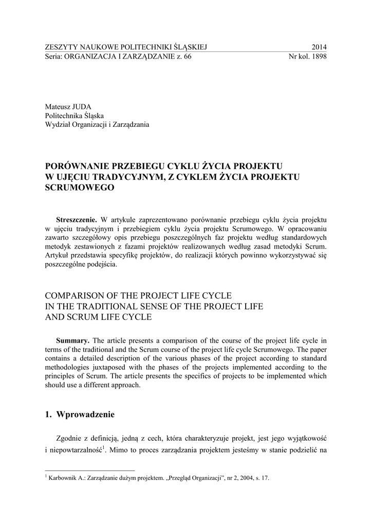 ZESZYTY NAUKOWE POLITECHNIKI ŚLĄSKIEJ Seria: ORGANIZACJA I ZARZĄDZANIE z. 66 2014 Nr kol. 1898 Mateusz JUDA Politechnika Śląska Wydział Organizacji i Zarządzania PORÓWNANIE PRZEBIEGU CYKLU ŻYCIA PROJEKTU W UJĘCIU TRADYCYJNYM, Z CYKLEM ŻYCIA PROJEKTU SCRUMOWEGO Streszczenie. W artykule zaprezentowano porównanie przebiegu cyklu życia projektu w ujęciu tradycyjnym i przebiegiem cyklu życia projektu Scrumowego. W opracowaniu zawarto szczegółowy opis przebiegu poszczególnych faz projektu według standardowych metodyk zestawionych z fazami projektów realizowanych według zasad metodyki Scrum. Artykuł przedstawia specyfikę projektów, do realizacji których powinno wykorzystywać się poszczególne podejścia. COMPARISON OF THE PROJECT LIFE CYCLE IN THE TRADITIONAL SENSE OF THE PROJECT LIFE AND SCRUM LIFE CYCLE Summary. The article presents a comparison of the course of the project life cycle in terms of the traditional and the Scrum course of the project life cycle Scrumowego. The paper contains a detailed description of the various phases of the project according to standard methodologies juxtaposed with the phases of the projects implemented according to the principles of Scrum. The article presents the specifics of projects to be implemented which should use a different approach. 1. Wprowadzenie Zgodnie z definicją, jedną z cech, która charakteryzuje projekt, jest jego wyjątkowość i niepowtarzalność1. Mimo to proces zarządzania projektem jesteśmy w stanie podzielić na 1 Karbownik A.: Zarządzanie dużym projektem. „Przegląd Organizacji”, nr 2, 2004, s. 17. 12 M. Juda poszczególne fazy. Z uwagi na niepowtarzalność każdego przedsięwzięcia, a także jego wyjątkowy charakter, działania podejmowane w poszczególnych fazach będą zgodne ze specyfiką danego projektu. W zależności od rodzaju projektu, jego wielkości, ilości zaangażowanych zasobów i czasu trwania, także długość każdego z etapów cyklu życia projektu będzie różna i powinna być adekwatna do parametrów projektu. PMBOK – pozycja wydawana przez Project Management Institute definiuje cykl życia projektu jako kolejne etapy łączące początek i koniec przedsięwzięcia2. Podział projektu na mniejsze części służy usprawnieniu zarządzania całym przedsięwzięciem, a także ułatwieniu procesu kontroli jego przebiegu. Zakończenie danego etapu wiąże się zazwyczaj z wytworzeniem produktu cząstkowego, bądź też innego konkretnego efektu, który transferowany jest do następnej fazy projektu, gdzie natomiast stanowi podstawę do rozpoczęcia dalszych prac. Cykl życia projektu realizowanego przy pomocy metodologii SCRUM znacząco różni się od podejścia tradycyjnego. Tak zwane zwinne zarządzanie projektem wykorzystywane jest głównie w projektach budowy i rozwoju oprogramowania komputerowego i jest, ściśle dopasowane do specyfiki projektów informatycznych. Z uwagi na dużą zmienność wymagań, metodologia SCRUM bazuje na maksymalnie elastycznych działaniach, także w modelu cyklu życia projektu. W porównaniu do modelu tradycyjnego zarządzania projektami, poszczególne fazy cyklu projektu są krótsze i każda z iteracji musi wytworzyć działający fragment produktu końcowego projektu. Poszczególne fazy następują po sobie podczas każdej iteracji, zespół projektowy planuje więc swoją pracę tylko na najbliższy okres czasu. 2. Tradycyjny model cyklu zarządzania projektem. Każdy projekt charakteryzuje się podejmowaniem specyficznych działań w poszczególnych jego etapach. Możemy wyróżnić podstawowy podział projektu na etapy3: Ustanowienie projektu, Planowanie (przygotowanie projektu), Realizacja projektu, Zamknięcie projektu. Poszczególne etapy cyklu życia projektu charakteryzują się różnorodnym zapotrzebowaniem na wszystkie rodzaje zasobów. Specyfika projektu kształtuje także zapotrzebowanie 2 3 Kompendium wiedzy o zarządzaniu projektami PMBOK Guide. MT & DC, Warszawa 2006, s. 21. Karbownik A., Gumiński A., Tchórzewski S.: Ustalenie wymogów w procesie zarządzania projektem. Zeszyty Naukowe, s. Organizacja i Zarządzanie, z. 36. Politechnika Śląska, Gliwice 2006, s. 58. Porównanie przebiegu cyklu życia… 13 na środki finansowe, które w zależności od projektu mogą być wydatkowane w sposób systematyczny, bądź też chaotyczny. Każdy z etapów wiąże się też z różnorodnym czasem trwania, charakterystyką prac i podejmowanych działań, a także poziomem ryzyka. Szczegółowy model cyklu życia projektu obejmuje następujące fazy: Wybór projektu, Planowanie projektu, Realizację projektu, Kontrolę projektu, Ocenę, Zakończenie. Rys. 1. Cykl życia projektu4 Fig. 1. Project life cycle Decyzja o przystąpieniu do realizacji projektu powinna być każdorazowo odpowiedzią na istniejącą potrzebę, która ma zostać zaspokojona poprzez realizację przedsięwzięcia. Jeżeli potrzeba dotyczy innego podmiotu np. zleceniodawcy przesyłającego zapytanie ofertowe, bądź zaproszenie do przetargu, firma realizująca pracę będzie je wykonywała dla klienta zewnętrznego. W przypadku zaistnienia potrzeby wewnątrz organizacji, projekt realizowany będzie na zlecenie klienta wewnętrznego. Wybierając projekty do realizacji, każda organizacja ograniczona jest teorią ekonomii, która mówi o tym, że nieograniczone potrzeby musimy zaspokajać przy użyciu ograniczo4 Frame J.D.: Zarządzanie projektami w organizacjach. WIG-Press, Warszawa 2001, s. 9. 14 M. Juda nych zasobów. W wyniku tego kierownictwo zmuszone jest do wyboru projektów realizowanych w najbliższej przyszłości, odłożenia realizacji projektu, bądź zupełnej rezygnacji z jego realizacji w przyszłości. Konstruowanie portfeli projektów, bądź programów może przebiegać według różnych kryteriów. Najczęściej wybieramy do realizacji projekty, które cechują się najwyższą stopą zwrotu, bądź też innymi finansowymi miernikami. I
