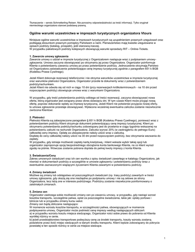 Tłumaczenie – serwis Schmetterling Reisen. Nie ponosimy odpowiedzialności za treść informacji. Tylko oryginał niemieckiego organizatora stanowi podstawę prawną. Ogólne warunki uczestnictwa w imprezach turystycznych organizatora Vtours Niniejsze ogólne warunki uczestnictwa w imprezach turystycznych są uzupełnieniem prawnych uregulowań oraz podlegają stosunkom prawnym pomiędzy Państwem a nami. Pierwszeństwo mają kwestie uregulowane w opisach podróży (katalog, prospekt), jeśli stanowią inaczej. W przypadku pakietowych podróży kolejowych obowiązują warunki sprzedaży RIT – Online-Tickets. 1. Zawarcie umowy zgłoszenia Zawarcie umowy o udział w imprezie turystycznej z Organizatorem następuje wraz z podpisaniem umowyzgłoszenia. Umowa zaczyna obowiązywać po otrzymaniu jej przez Organizatora. Organizator poinformuje Klienta o potwierdzeniu zawarciu umowy po przez potwierdzenie podróży. Jednocześnie otrzymają Państwo od Organizatora zaświadczenie potwierdzające cenę imprezy turystycznej zgodnie z paragrafem 651 k BGB (Kodeksu Prawa Cywilnego). Jeżeli Klient dokonuje rezerwacji telefonicznie i nie otrzyma warunków uczestnictwa w imprezie turystycznej oraz warunków płatności Organizatora, Organizator prześle te dokumenty wraz z potwierdzeniem podróży/rachunkiem. Jeżeli Klient nie odwoła się od nich w ciągu 10 dni (przy rezerwacjach krótkoterminowych - na 10 dni przed rozpoczęciem podróży) obowiązuje umowa wraz z warunkami Organizatora. W przypadku, gdy treść potwierdzenia podróży odbiega od treści rezerwacji, zaczyna obowiązywać nowa oferta, którą organizator jest związany przez okres dziesięciu dni. W tym czasie Klient może przyjąć nową ofertę, poprzez dokonanie wpłaty za imprezę turystyczną. Jeżeli Klient nie potwierdzi przyjęcia nowej oferty, to umowa zgłoszenie przestaje obowiązywać. Wpłacona wcześniej ewentualna zaliczka zostanie niezwłocznie zwrócona Klientowi. 2. Płatności Płatności Klienta są zabezpieczone paragrafem § 651 k BGB (Kodeksu Prawa Cywilnego), ponieważ wraz z potwierdzeniem podróży Klient otrzymuje dokument potwierdzający cenę imprezy turystycznej. Klient po otrzymaniu potwierdzenia podróży/rachunku zobowiązany jest do przelania w ciągu tygodnia wskazanej na potwierdzeniu zaliczki na rachunek Organizatora. Zaliczka wynosi 20% (w zaokrągleniu do pełnego Euro) całkowitej ceny imprezy. Opłatę za ubezpieczenie należy uiścić wraz z zaliczką. Dopłatę do ceny całkowitej należy uiścić na 30 dni przed rozpoczęciem podróży, bez otrzymania wezwania do zapłaty. W przypadku, gdy istnieje możliwość zapłaty kartą kredytową, i klient wskaże wybór takiej opcji lub organizator zaproponuje opcję bezpośredniego obciążenia konta bankowego Klienta, na co klient wyrazi zgodę na piśmie. Wówczas zostanie pobrana dopłata do pełnej kwoty imprezy z konta Klienta. 3. Świadczenia/Ceny Zakres umownych świadczeń oraz ich cen wynika z opisu świadczeń zawartego w katalogu Organizatora, jak również w dokumentach podróży a szczególnie w umowie-zgłoszeniu i potwierdzeniu podróży wraz z ewentualnie zaznaczonymi wiążącymi życzeniami Klienta zawartymi w potwierdzeniu podróży. 4. Zmiany świadczeń Możliwe są zmiany lub odstępstwa od poszczególnych świadczeń (np. trasy podróży) zawartych w treści umowy zgłoszenia, gdy okażą się one niezbędne po podpisaniu umowy i nie są celowe ze strony Organizatora, lecz leżą one w interesie podróżnego. Podróżny zostanie niezwłocznie poinformowany o zaistniałych zmianach. 5. Zmiana cen Organizator zastrzega sobie możliwość zmiany cen po zawarciu umowy, w przypadku, gdy nastąpi wzrost kosztów transportu, szczególnie paliwa, opłat za poszczególne świadczenia, takie jak: opłaty portowe i lotnicze lub w przypadku zmiany kursu walut. Zmiany cen będą obliczane następująco: W momencie wzrostu kosztów transportu, w szczególności paliwa, obowiązujących w momencie podpisywania umowy, Organizator może podnieść cenę imprezy według następujących obliczeń: a) w przypadku wzrostu kosztu miejsca siedzącego, Organizator rości sobie prawo do pobrania od Klienta wynikłej różnicy w cenie. b) jeżeli przedsiębiorstwo transportowe podwyższy cenę za środek transportu, koszty wzrostu zostaną podzielone przez ilość miejsc siedzących w danym środku transportu. Klient będzie zobowiązany do pokrycia powstałej w ten sposób różnicy w cenie za miejsce siedzące. 1 W przypadku, gdy zostaną podwyższone opłaty portowe lub lotnicze obowiązujące w momencie podpisywania umowy zgłoszenia, cena imprezy turystycznej może wzrosnąć o wynikłą różnicę. Jeżeli nastąpi zmiana kursu walut obowiązująca w momencie podpisywania umowy, w wyniku, której wzrosną koszty imprezy turystycznej, Organizator jest upoważniony wymagać od Klienta różnicy powstałej w kosztach przypadających na imprezę turystyczną. Podwyżka ceny jest możliwa, tylko w przypadku, gdy czas zawarcia umowy i jej termin realizacji dzielą więcej niż 4 miesiące. W przypadku, gdy nastąpi zmiana ceny, Klient zostanie niezwłocznie poinformowany o szczegółach dotyczących obliczania nowej ceny. W każdym przypadku zmiana ceny jest możliwa tylko do 21. dnia od daty rozpoczęcia podróży, zmiany ceny po tym terminie nie są możliwe. Przy wzroście ceny większym niż 5 % ceny imprezy turystycznej, Klient ma prawo odstąpić od umowy, nie ponosząc żadnych dodatkowych kosztów lub domagać się udziału w równowartościowej imprezie turystycznej z programu Organizatora, jeżeli istnieje taka możliwość. Klient ma prawo wymagać od Organizatora spełnienia tych warunków niezwłocznie po otrzymaniu informacji dotyczącej wzrostu ceny. 6. Rezygnacja ze strony podróżnego Klient ma prawo zrezygnować z podróży w każdym momencie przed rozpoczęciem imprezy turystycznej. W celu uniknięcia nieporozumień rezygnac