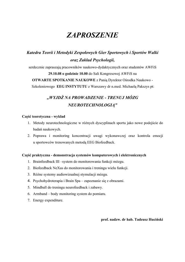ZAPROSZENIE Katedra Teorii i Metodyki Zespołowych Gier Sportowych i Sportów Walki oraz Zakład Psychologii, serdecznie zapraszają pracowników naukowo-dydaktycznych oraz studentów AWFiS 29.10.08 o godzinie 10.00 do Sali Kongresowej AWFiS na OTWARTE SPOTKANIE NAUKOWE z Panią Dyrektor Ośrodka Naukowo Szkoleniowego EEG INSTYTUTU z Warszawy dr n.med. Michaelą Pakszys pt: „WYJDŹ NA PROWADZENIE - TRENUJ MÓZG NEUROTECHNOLOGIĄ” Część teoretyczna - wykład 1. Metody neurotechnologiczne w różnych dyscyplinach sportu jako nowe podejście do badań naukowych. 2. Poprawa i monitoring koncentracji uwagi wykonawczej oraz kontrola emocji u sportowców trenowanych metodą EEG Biofeedback. Część praktyczna - demonstracja systemów komputerowych i elektronicznych 1. Brainfeedback III –system do monitorowania funkcji mózgu. 2. Biofeedback NeXus do monitorowania i treningu wielu funkcji. 3. Róźne systemy audiowizualnej stymulacji mózgu. 4. Psychohydroterapia i Brain Spa – zapoznanie się z obrazami. 5. Mindball do treningu neurofeedback i zabawy. 6. Armband – body monitoring system do pomiaru. 7. Energy expenditure. prof. nadzw. dr hab. Tadeusz Huciński PROGRAM SPOTKANIA „WYJDŹ NA PROWADZENIE. TRENUJ MÓZG NEUROTECHNOLOGIĄ” Przedstawienie EEG Instytutu: centrum medyczne, naukowo-szkoleniowe, centrum terapii stresu, centrum leczenia zaburzeń uczenia się i zachowania, centrum rozwoju VIP, Brain Spa, dział handlowy. PRZEDSTAWIENIE REFERUJĄCEGO: Dyrektor dr n.med.Michaela PAKSZYS, studia Uniwersytet im.Karola IV w Pradze Czeskiej na Wydziale Pediatrii, Kierownik Zakładu Neurofizjologii i Badań Snu w Instytucie Matki i Dziecka, wieloletni wykładowca neurofizjologii w CMKP w Warszawie, nauczyciel wielu pokoleń neurofizjologów, autor 153 prac naukowych, współautor 1 monografii, autor 45 skryptów z zakresu neurofizjologii, EEG, EEGBiofeedback, biofeedback, AVS, psychohydroterapii, twórca polskiej szkoły neurofizjologii wieku rozwojowego, autor pierwszej Polskiej Unifikacji w Neurofizjologii, autor pierwszej Polskiej Standaryzacji w EEG Biofeedback, realizator Projektu MEN i Europejskiego Funduszu Społecznego EEGBiofeedback w 230 polskich szkołach i ośrodkach szkolnowychowawczych” w roku 2006, Prezes Polskiego Towarzystwa Biofeedback i Psychofizjologii Stosowanej – Polish Chapter of AAPB. Prezes Sekcji Rozwojowej Polskiego Towarzystwa Neurofizjologii Klinicznej, Członek wielu Komisji i międzynarodowych towarzystw naukowych AAPB, ISNR oraz SAN, SABN. WPROWADZENIE: EEG Instytut oferuje współpracę na polu nauki, na polu szkoleniowym, również w odniesieniu do wybrania najlepszego sprzętu neurotechnologicznego dla laboratoriów AWFiS i do treningu (niektóre rodzaje systemów monitorują funkcje i trenują w oddaleniu od zawodnika do 100m). Oferujemy szkolenia zorganizowane (kursy), warsztaty, szkolenia indywidualne jak i superwizyjne spotkania z mentorami. CEL SPOTKANIA: 1. Zapoznanie Władz AWFIS, pracowników naukowo-dydaktycznych oraz studentów z neurotechnologią – metodami stosowanymi w medycynie sportowej, psychologii sportowej oraz psychofizjologii stosowanej do: • uzyskania maksymalnych wyników sportowych w różnych dyscyplinach sportu przy zachowaniu radości z działań i głębokiej odnowy sił zawodnika, po treningu czy zawodach, • zastosowanie aparatury pomiarowej i trenującej dla oceny i śledzenia parametrów funkcji biologicznych u dzieci, młodzieży , osób dorosłych i dojrzałych, • śledzenia parametrów zdrowia i dojrzałości ośrodkowego układu nerwowego w medycynie sportowej i w rehabilitacji po urazach różnego typu w różnych kategoriach wiekowych, • opracowania własnych protokołów treningowych w poszczególnych dyscyplinach sportu, • zastosowania w odnowie biologicznej (brain spa), • śledzenia zużycia energetycznego w przebiegu poszczególnych dyscyplin sportu i dostosowania odpowiedniej diety sportowca w różnym wieku i przy różnym obciążeniu, • treningów uczniów o szczególnych potrzebach edukacyjnych, • włączenia metod do programu szkolenia medycyny sportowej, psychologii sportu, fizjoterapii sportowej oraz programu promocji zdrowia (metoda jest cenioną metodą rehabilitacji funkcji), • do wykorzystania techniki i metodyki badań oraz treningów na systemach komputerowych i elektronicznych na zgrupowaniach anty-stresowych i budujących zdrowy styl życia (wellness). PROGRAM SPOTKANIA: Część teoretyczna – wykład 1. Metody neurotechnologiczne w różnych dyscyplinach sportu jako nowe podejście do badań naukowych. Poprawa i monitoring koncentracji uwagi wykonawczej oraz kontrola emocji u sportowców trenowanych metodą EEG Biofeetback. 2. Część praktyczna - demonstracja systemów komputerowych i elektronicznych • • Brainfeedback III –system do monitorowania funkcji mózgu. Biofeedback NeXus do monitorowania i treningu wielu funkcji . • Róźne systemy audiowizualnej stymulacji mózgu. • Psychohydroterapia i Brain Spa – zapoznanie się z obrazami. • Mindball do treningu neurofeedback i zabawy. • Armband – body monitoring system do pomiaru . • Energy expenditure. CZĘŚĆ DOTYCZĄCA MOŻLIWOŚCI WSPÓŁPRACY • Program ochrona zdrowia psychicznego. • Program zdrowie fizyczne. • Program rehabilitacja po wypadkach, powrót do zdrowia. • Program olimpijski. • Program dla specjalnych uczniów. • Program paraolimpijski.