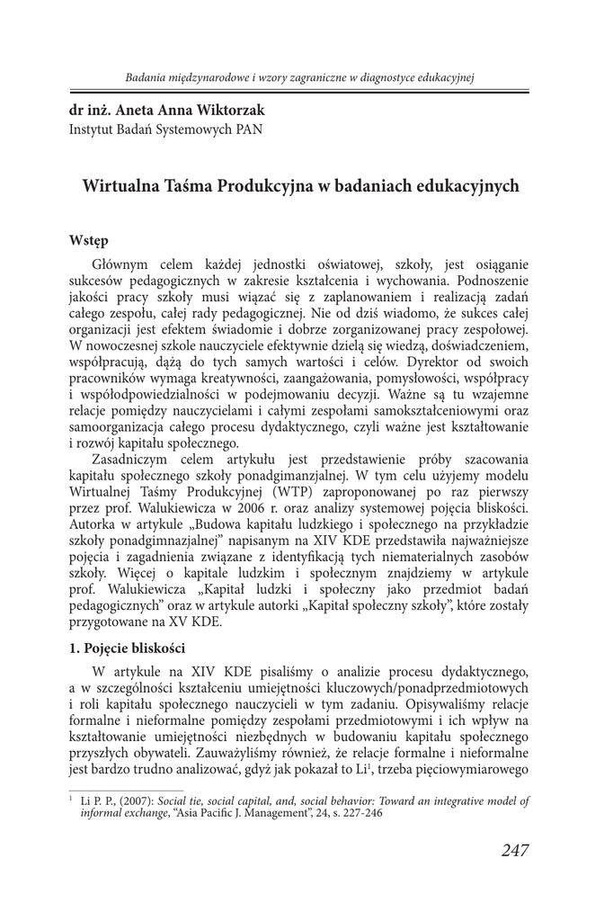 Badania międzynarodowe i wzory zagraniczne w diagnostyce edukacyjnej dr inż. Aneta Anna Wiktorzak Instytut Badań Systemowych PAN Wirtualna Taśma Produkcyjna w badaniach edukacyjnych Wstęp Głównym celem każdej jednostki oświatowej, szkoły, jest osiąganie sukcesów pedagogicznych w zakresie kształcenia i wychowania. Podnoszenie jakości pracy szkoły musi wiązać się z zaplanowaniem i realizacją zadań całego zespołu, całej rady pedagogicznej. Nie od dziś wiadomo, że sukces całej organizacji jest efektem świadomie i dobrze zorganizowanej pracy zespołowej. W nowoczesnej szkole nauczyciele efektywnie dzielą się wiedzą, doświadczeniem, współpracują, dążą do tych samych wartości i celów. Dyrektor od swoich pracowników wymaga kreatywności, zaangażowania, pomysłowości, współpracy i współodpowiedzialności w podejmowaniu decyzji. Ważne są tu wzajemne relacje pomiędzy nauczycielami i całymi zespołami samokształceniowymi oraz samoorganizacja całego procesu dydaktycznego, czyli ważne jest kształtowanie i rozwój kapitału społecznego. Zasadniczym celem artykułu jest przedstawienie próby szacowania kapitału społecznego szkoły ponadgimanzjalnej. W tym celu użyjemy modelu Wirtualnej Taśmy Produkcyjnej (WTP) zaproponowanej po raz pierwszy przez prof. Walukiewicza w 2006 r. oraz analizy systemowej pojęcia bliskości. Autorka w artykule „Budowa kapitału ludzkiego i społecznego na przykładzie szkoły ponadgimnazjalnej” napisanym na XIV KDE przedstawiła najważniejsze pojęcia i zagadnienia związane z identyfikacją tych niematerialnych zasobów szkoły. Więcej o kapitale ludzkim i społecznym znajdziemy w artykule prof. Walukiewicza „Kapitał ludzki i społeczny jako przedmiot badań pedagogicznych” oraz w artykule autorki „Kapitał społeczny szkoły”, które zostały przygotowane na XV KDE. 1. Pojęcie bliskości W artykule na XIV KDE pisaliśmy o analizie procesu dydaktycznego, a w szczególności kształceniu umiejętności kluczowych/ponadprzedmiotowych i roli kapitału społecznego nauczycieli w tym zadaniu. Opisywaliśmy relacje formalne i nieformalne pomiędzy zespołami przedmiotowymi i ich wpływ na kształtowanie umiejętności niezbędnych w budowaniu kapitału społecznego przyszłych obywateli. Zauważyliśmy również, że relacje formalne i nieformalne jest bardzo trudno analizować, gdyż jak pokazał to Li1, trzeba pięciowymiarowego Li P. P., (2007): Social tie, social capital, and, social behavior: Toward an integrative model of informal exchange, “Asia Pacific J. Management”, 24, s. 227-246 1 247 XV Konferencja Diagnostyki Edukacyjnej, Kielce 2009 kryterium, aby odróżnić relacje formalne od nieformalnych. Oznacza to, że relacje te nie są rozłączne/ortogonalne (patrz Walukiewicz, 2008), a więc ich wartości, jeżeli kiedykolwiek będziemy potrafili je oszacować, nie możemy dodawać. Dlatego zamiast relacji formalnych lub nieformalnych wprowadzamy pojęcie bliskości (ang. proximity) między nauczycielami pracującymi na danej Wirtualnej Taśmie Produkcyjnej (WTP) np. realizującej proces P1 – nauczanie klasycznych przedmiotów lub P2 – kształcenie umiejętności kluczowych/ ponadprzedmiotowych. Tak więc zamiast rozważać relacje miedzy nauczycielami w danej szkole, my koncentrujemy uwagę na bliskości między nimi, ale tylko w trakcie realizacji procesu dydaktycznego P1 lub P2 na danej WTP. W potocznym rozumieniu bliskość to prawie to samo, co podobieństwo lub sąsiedztwo. Tak więc sąsiednie domy, kraje itp. są bliskie sobie (geograficznie), specjaliści/eksperci o podobnych zainteresowaniach, wiedzy, doświadczeniu itp. są bliscy sobie twórczo, dwie osoby o podobnym sposobie reagowania na daną rzeczywistość są bliskie sobie emocjonalnie. Mówimy, że dwie firmy mają bliskie (podobne) struktury organizacyjne itd. Pojęcie bliskości po raz pierwszy zostało wprowadzone w tzw. szkole francuskiej: Torre i Gilly (2000), Torre i Rallet (2005), Rallet i Torre (1999) oraz współcześnie przez Menzela (2006). Bliskość, podobnie jak kapitał, jest pojęciem wielowymiarowym. Menzel w 2006 roku wprowadził 4 formy bliskości: a. bliskość twórcza/technologiczna, b. bliskość emocjonalna, c. bliskość przestrzenna, d. bliskość organizacyjna. Walukiewicz w 2008 roku udowodnił, że te cztery formy bliskości są rozłączne, a więc ich wartości (użyteczności) możemy dodawać. Te cztery formy bliskości omówimy na przykładzie szkoły ponadgimnazjalnej. Bliskość twórcza (BT) - pomiędzy nauczycielami Ni oraz Nj oznacza, że mają oni podobne doświadczenie, wiedzę, korzystają z tych samych terminów, oznaczeń itd. w procesie dydaktycznym na danej WTP w danym roku szkolnym. Ta współpraca może obejmować realizowanie programu dydaktycznego w danym roku t lub planowanie procesu dydaktycznego dla roku t+1. Oczywiście możliwa jest współpraca między nauczycielami Ni oraz Nj w roku t , ale nie musi ona być w roku t+1. Bliskość emocjonalna (BE) – między nauczycielami Ni oraz Nj jest związana z relacjami emocjonalnymi, jakie zachodzą między nimi jako dwoma istotami ludzkimi (zgoda, szacunek, konflikty personalne, donosicielstwo itp.). Bliskość emocjonalna między nauczycielami jest zawsze niezależna od programu, procesu dydaktycznego czy zadań realizowanych w szkole. Może ona ułatwiać lub utrudniać współpracę tych nauczycieli na danej WTP. 248 Badania międzynarodowe i wzory zagraniczne w diagnostyce edukacyjnej Bliskość przestrzenna (BP) – pomiędzy nauczycielami Ni oraz Nj oznacza możliwość istnienia bezpośredniego kontaktu, tzw. face–to–face. W analizowanej szkole ta bliskość istnieje zawsze i w związku z tym nie będziemy jej tu szerzej omawiać. Ale można sobie wyobrazić, że jeden z nauczycieli odsiaduje w więzieniu wyrok i wtedy nie ma bliskości przestrzennej między nim a pozostałymi nauczycielami na danej WTP. Bliskoś