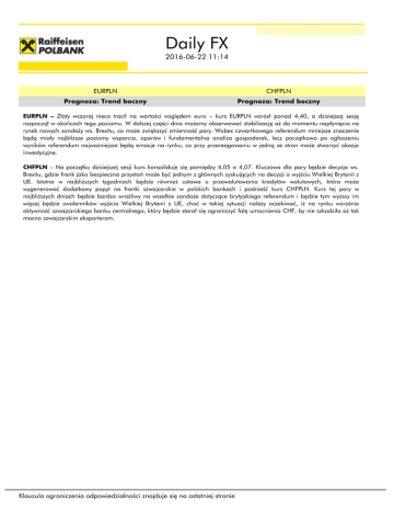 Daily FX 2016-06-22 11:14 EURPLN CHFPLN Prognoza: Trend boczny Prognoza: Trend boczny EURPLN – Złoty wczoraj nieco tracił na wartości względem euro – kurs EURPLN wzrósł ponad 4,40, a dzisiejszą sesję rozpoczął w okolicach tego poziomu. W dalszej części dnia możemy obserwować stabilizację aż do momentu napłynięcia na rynek nowych sondaży ws. Brexitu, co może zwiększyć zmienność pary. Wobec czwartkowego referendum mniejsze znaczenie będą miały najbliższe poziomy wsparcia, oporów i fundamentalna analiza gospodarek, lecz początkowo po ogłoszeniu wyników referendum najważniejsze będą emocje na rynku, co przy przereagowaniu w jedną ze stron może stworzyć okazje inwestycyjne. CHFPLN – Na początku dzisiejszej sesji kurs konsoliduje się pomiędzy 4,05 a 4,07. Kluczowa dla pary będzie decyzja ws. Brexitu, gdzie frank jako bezpieczna przystań może być jednym z głównych zyskujących na decyzji o wyjściu Wielkiej Brytanii z UE. Istotna w najbliższych tygodniach będzie również ustawa o przewalutowania kredytów walutowych, która może wygenerować dodatkowy popyt na franki szwajcarskie w polskich bankach i podnieść kurs CHFPLN. Kurs tej pary w najbliższych dniach będzie bardzo wrażliwy na wszelkie sondaże dotyczące brytyjskiego referendum i będzie tym wyższy im więcej będzie zwolenników wyjścia Wielkiej Brytanii z UE, choć w takiej sytuacji należy oczekiwać, iż na rynku wzrośnie Źródło: Reuters; Bloomberg; prognozy Raiffeisen Bank Polska i Raiffeisen Research aktywność szwajcarskiego banku centralnego, który będzie starał się ograniczyć falę umocnienia CHF, by nie szkodziła aż tak mocno szwajcarskim eksporterom. Klauzula ograniczenia odpowiedzialności znajduje się na ostatniej stronie Kalendarium Godz. Kraj Wskaźnik Ostateczna dana Prognoza Średnia Poprzedni Raiffeisen oczekiwań PIĄTEK 17 CZERWCA 14:00 PL Produkcja przemysłowa (maj, %, r/r) 3,50 3,80 6,00 14:00 PL Sprzedaż detaliczna (maj, %, m/m) 2,20 1,20 0,30 14:30 US Pozwolenia na budowę domów (maj, tys.) 1 150,00 1 200,00 1 142,00 1 130,00 14:30 US Rozpoczęte budowy domów (maj, tys.) 1 150,00 1 150,00 1 169,00 1 172,00 17:00 EZ Wystąpienie publiczne szefa ECB (Mario Draghi) PONIEDZIAŁEK 20 CZERWCA 08:00 DE Inflacja producencka (maj, %, m/m) 18:15 US Wystąpienie szefa Fed z Minneapolis (Neel Kashkari) 0,40 0,30 0,10 6,00 5,00 6,40 WTOREK 21 CZERWCA 11:00 DE Indeks instytutu ZEW (Czerwiec, pkt.) 16:00 US Prezes Fed przedstawi półroczny raport nt. polityki monetarnej przed Komisją Bankową Senatu USA 16:00 US Sprzedaż domów na rynku wtórnym (Maj, mln szt.) 5,48 5,50 5,45 16:00 EZ Koniunktura konsumencka (dane wstępne, czerwiec, pkt) -8,00 -7,10 -7,00 09:00 FR Indeks PMI dla przemysłu, wst. (Czerwiec, pkt.) 49,00 19,20 ŚRODA 22 CZERWCA CZWARTEK 23 CZERWCA 48,40 09:00 FR Indeks PMI dla usług, wst. (Czerwiec, pkt.) 52,50 09:30 DE Indeks PMI dla przemysłu, wst. (Czerwiec, pkt.) 52,00 52,00 52,10 09:30 DE Indeks PMI dla usług, wst. (Czerwiec, pkt.) 54,50 55,00 55,20 10:00 EZ Indeks PMI dla przemysłu, wst. (Czerwiec, pkt.) 51,30 51,40 51,50 10:00 EZ Indeks PMI dla usług, wst. (Czerwiec, pkt.) 53,00 53,10 53,30 10:00 PL Stopa bezrobocia 9,20 9,10 9,50 270,00 277,00 107,50 107,70 51,60 14:00 PL Protokół z posiedzenia RPP 14:30 US Wnioski o zasiłek dla bezrobotnych (tydzień, tys.) 10:00 DE Indeks instytutu Ifo (Czerwiec, pkt.) 14:30 US Zamówienia na dobra bez środków trans., wst. (czerwiec, %, m/m) 0,00 0,00 0,50 14:30 US Zamówienia na dobra trwałe, wst. (czerwiec, %, m/m) 0,50 -0,80 3,40 16:00 US Indeks Uniwersytetu Michigan, fin. (Czerwiec, pkt.) 94,00 94,30 PIĄTEK 24 CZERWCA EURPLN CHFPLN Prognoza: Trend boczny Prognoza: Trend boczny Źródło: Reuters, stan na 2016-06-22 10:41 Opór Kurs Wsparcie 4,4720 4,4580 4,4000 4,3900 4,3820 4,3520 4,3210 Po porannej próbie wejścia ponad 4,40, kurs EURPLN obniżył się w okolice 50-sesyjnej średniej. Wyłamanie się z wąskiego kanału 4,3820-4,4000 może zainicjować dominującą tendencje na najbliższe godziny. Dopiero trwałe przełamanie 4,3820 umożliwiłoby zejście w okolicę 4,3520. Najbliższy opór znajduje się przy 4,40. Kolejna bariera dla wzrostów umiejscowiona jest przy 4,4580 i jest to szczyt intraday z 24 maja. Najbliższe wsparcia to 4,3820 oraz 4,3520, gdzie przebiegają odpowiednio 50-sesyjna średnia, a także 100sesyjna średnia ruchoma. EURPLN CHFPLN Prognoza: Trend boczny Prognoza: Trend boczny Źródło: Reuters, stan na 2016-06-22 10:41 Opór Kurs Wsparcie 4,33130 4,1920 4,1240 4,0620 4,0180 3,9870 3,9670 Na początku dzisiejszej sesji kurs konsoliduje się pomiędzy 4,05 a 4,07. Najbliższe wsparcia to dołek intraday z 20 czerwca br. (4,0180) oraz poziomy, gdzie przebiegają 50-sesyjna średnia (3,9840) oraz 100-sesyjna średnia ruchoma (3,9660). Najbliższe opory dla pary to szczyt notowań intraday z 21 stycznia br. (4,1240) oraz 38,2% zniesienia Fibonacciego (4,1920) spadków odnotowanych w okresie styczeń-kwiecień 2015 r. Klauzula ograniczenia odpowiedzialności znajduje się na ostatniej stronie Raport sporządził: Mateusz Namysł Analityk Rynków Finansowych Raiffeisen Polbank ul. Grzybowska 78, 00-844 Warszawa www.raiffeisenpolbank.com Departament Sprzedaży Rynków Finansowych Telefon: + 48 22 585 37 86 Faks: + 48 22 585 33 68 W razie pytań lub uwag dotyczących powyższej publikacji proszę o kontakt: [email protected] Dealing: Bydgoszcz tel.: (22) 585 37 73 Poznań tel.: (61) 655 47 51 Gdańsk tel.: (22) 585 37 71 Rzeszów tel.: (22) 585 37 75 Katowice tel.: (22) 585 37 69 Szczecin tel.: (22) 585 37 71 Kielce tel.: (22) 585 37 70 Toruń tel.: (22) 585 37 72 Kraków tel.: (22) 585 37 70 Warszawa tel.: (22) 585 37 79 Lublin tel.: (22) 585 37 75 Wrocław tel.: (22) 585 37 74 Łódź tel.: (22) 585 37 75 Zielona Góra tel.: (22) 585 37 73 Klauzula Ograniczenia Odpowiedzialności: Niniejsza wiadomość została przesłana zgodnie z Pani/Pana zlece