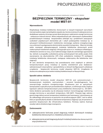 Rozwiązanie chronione prawem własności intelektualnej zastrzeżenie nr P. 401014 BEZPIECZNIK TERMICZNY - ekspulser model MST-01 Wprowadzenie Eksploatacja instalacji kolektorów słonecznych w naszych krajowych warunkach nierozerwalnie wiąże się lub będzie wiązała się z koniecznością ich zabezpieczenia w dodatkowe systemy chroniące przed destrukcyjnym nadmiarem energii termicznej - zwłaszcza w okresie letnim. Wielu indywidualnych jak i zbiorowych użytkowników przedmiotowych instalacji bezpośrednio zetknęło się z problemem awaryjnych uszkodzeń pojedynczych elementów jak i całych podzespołów instalacji np. w sytuacjach krótkookresowych niedoborów sieciowego zasilania energetycznego czy w okresach występowania ekstremalnie wysokich temperatur. Obecnie istnieje wiele rozwiązań zabezpieczających instalacje kolektorów słonecznych przed niekorzystnym działaniem stagnacji. W tej grupie są to m.in. instalacje schładzające, chłodzenie zwrotne w nocy, zrzut nadmiarowego ciepła do centralnego ogrzewania itp. Jednak w przypadku uszkodzenia pomp cyrkulacyjnych lub zaniku prądu i/lub wyczerpania się akumulatorów UPS i/lub uszkodzenia instalacji PV zasilającej instalację kolektorów słonecznych, następuje niekorzystny dla kolektorów stan stagnacji. W celu obniżenia temperatury bez powodowania strat cieplnych w zakresie temperaturowym pracy instalacji w wyniku wieloletnich prac badawczowdrożeniowych stworzyliśmy i sprawdziliśmy w różnych konfiguracjach unikatowe urządzenie - bezpiecznik termiczny model ekspulser MST-01. Urządzenie to skutecznie zabezpiecza już wiele instalacji kolektorowych w Naszym Kraju. Sposób i zakres działania Bezpiecznik termiczny model ekspulser MST-01 jest autonomicznym i bezawaryjnym modułem, wytrzymałym i zarazem bezobsługowym, bez zewnętrznego zasilania energetycznego. Zbudowany jest ze specjalnych kompozytów o specyficznym przewodnictwie cieplnym, co eliminuje straty ciepła w typowym zakresie temperaturowym pracy kolektorów słonecznych tj.: 20-100oC. Istota działania sprowadza się do aktywacji medium transmitującego nadmierną energię termiczną w warunkach temperatury 140-160oC. Powyżej tego zakresu granicznego dalszy wzrost temperatury kolektora jest hamowany i stymulowany aż do całkowitego zatrzymania na poziomie nie przekraczającym 200oC. Jest to układ, który w sposób płynny działa na obniżenie temperatury stagnacji i jej utrzymanie na poziomie bezpiecznym dla infrastruktury kolektora. Poniższy wykres ilustruje zasadę i zakres działania tego rozwiązania. Zastosowanie zabezpieczenie końcowe przed stagnacją małych domowych instalacji kolektorów słonecznych (1-2 kolektory słoneczne) zabezpieczenie przed stagnacją dużych instalacji kolektorów słonecznych (3 i więcej kolektorów) Wszystkie specyfikacje i opisy zawarte w tym opracowaniu mogą być zmienione bez wcześniejszego powiadomienia. Rysunki mają charakter poglądowy i mogą różnić się od oryginału. Przykładowy schemat podłączenia bezpiecznika termicznego Bezpiecznik termiczny Izolacja Odpowietrznik + zawór*** Kolektor Kolektor *** Zawór pod odpowietrznikiem zamknięty Zależność mocy w funkcji temperatury stagnacji dla różnych opcji konfiguracyjnych ilości kolektorów przypadających na jeden bezpiecznik termiczny model ekspulser MST-01 Moc Q % BEZPIECZNIK TERMICZNY KOLEKTORY 100% 1 x PE20-58 + 1 x PE20-58 1 x PE20-58 + 1 x PE15-58 1 x PE20-58 0 100 C 140 C 200 C 230 C Temperatura kolektora T Projprzem-Eko Sp z .o.o. Zamość ul. Osiedlowa 1 89-200 Szubin www.projprzemeko.pl C Tel.: 0048 52 3840025 Fax.: 0048 52 3840026 [email protected]