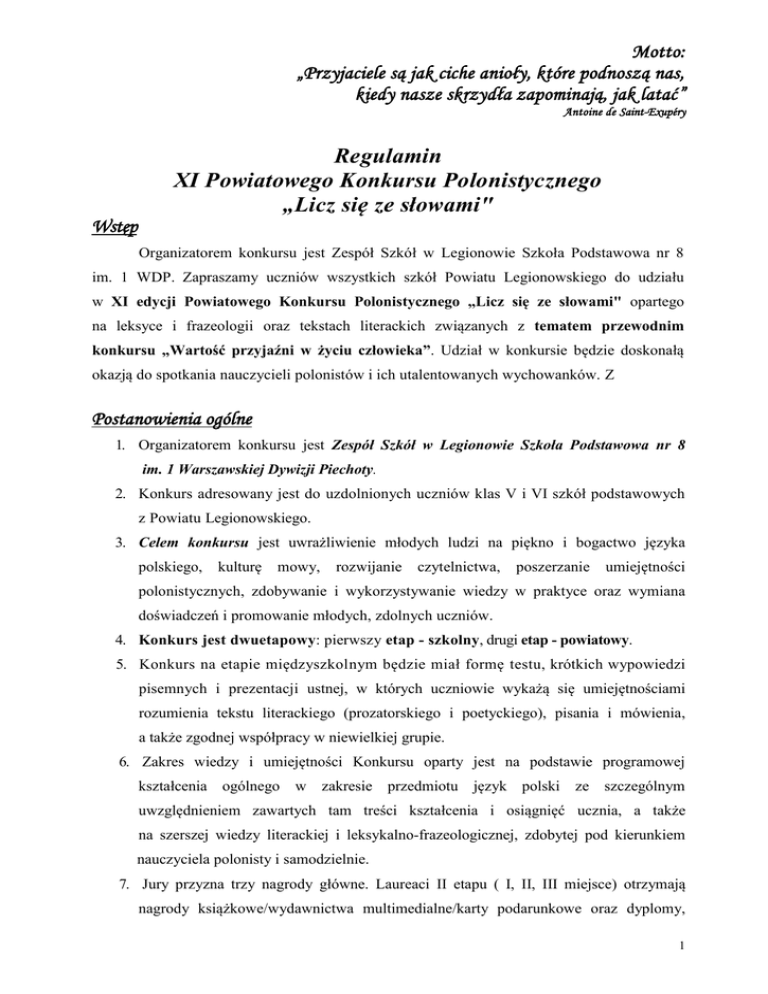 Motto: „Przyjaciele są jak ciche anioły, które podnoszą nas, kiedy nasze skrzydła zapominają, jak latać” Antoine de Saint-Exupéry Regulamin XI Powiatowego Konkursu Polonistycznego „Licz się ze słowami" Wstęp Organizatorem konkursu jest Zespół Szkół w Legionowie Szkoła Podstawowa nr 8 im. 1 WDP. Zapraszamy uczniów wszystkich szkół Powiatu Legionowskiego do udziału w XI edycji Powiatowego Konkursu Polonistycznego „Licz się ze słowami" opartego na leksyce i frazeologii oraz tekstach literackich związanych z tematem przewodnim konkursu „Wartość przyjaźni w życiu człowieka”. Udział w konkursie będzie doskonałą okazją do spotkania nauczycieli polonistów i ich utalentowanych wychowanków. Z Postanowienia ogólne 1. Organizatorem konkursu jest Zespół Szkół w Legionowie Szkoła Podstawowa nr 8 im. 1 Warszawskiej Dywizji Piechoty. 2. Konkurs adresowany jest do uzdolnionych uczniów klas V i VI szkół podstawowych z Powiatu Legionowskiego. 3. Celem konkursu jest uwrażliwienie młodych ludzi na piękno i bogactwo języka polskiego, kulturę mowy, rozwijanie czytelnictwa, poszerzanie umiejętności polonistycznych, zdobywanie i wykorzystywanie wiedzy w praktyce oraz wymiana doświadczeń i promowanie młodych, zdolnych uczniów. 4. Konkurs jest dwuetapowy: pierwszy etap - szkolny, drugi etap - powiatowy. 5. Konkurs na etapie międzyszkolnym będzie miał formę testu, krótkich wypowiedzi pisemnych i prezentacji ustnej, w których uczniowie wykażą się umiejętnościami rozumienia tekstu literackiego (prozatorskiego i poetyckiego), pisania i mówienia, a także zgodnej współpracy w niewielkiej grupie. 6. Zakres wiedzy i umiejętności Konkursu oparty jest na podstawie programowej kształcenia ogólnego w zakresie przedmiotu język polski ze szczególnym uwzględnieniem zawartych tam treści kształcenia i osiągnięć ucznia, a także na szerszej wiedzy literackiej i leksykalno-frazeologicznej, zdobytej pod kierunkiem nauczyciela polonisty i samodzielnie. 7. Jury przyzna trzy nagrody główne. Laureaci II etapu ( I, II, III miejsce) otrzymają nagrody książkowe/wydawnictwa multimedialne/karty podarunkowe oraz dyplomy, 1 pozostali uczestnicy podziękowania za uczestnictwo w postaci dyplomów. 8. W przypadku uzyskania przez dwie drużyny takiej samej liczby punktów przeprowadzona zostanie dogrywka. 9. Ogłoszenie wyników i rozdanie nagród odbędzie się w siedzibie Szkoły Podstawowej nr 8 w Legionowie, w maju 2017 r. podczas uroczystości podsumowania osiągnięć uczniów. O dokładnym terminie zostaną Państwo poinformowani. 10. Koszty przygotowania i dojazdu pokrywają uczestnicy. 11. Uczestnicy zobowiązani są do przedstawienia zgody rodziców/prawnych opiekunów do udziału w konkursie i publikację wizerunku na stronie internetowej Szkoły Podstawowej nr 8. I etap szkolny 1. Przygotowuje i przeprowadza Komisja Szkolna powołana przez Dyrektora Szkoły. 2. Celem tego etapu jest wyłonienie trzech najlepszych uczniów, którzy będą reprezentować szkołę w II etapie konkursu. 3. Prace uczniów sprawdza i ocenia Komisja Szkolna wg ustalonych przez siebie kryteriów. 4. Komisja Szkolna kwalifikuje do II etapu konkursu trzech uczniów, którzy otrzymają największą liczbę punktów; ewentualnie osobę rezerwową. 5. Eliminacje I etapu konkursu należy przeprowadzić do dnia 20 stycznia 2017 r. 6. Z przeprowadzonych eliminacji należy sporządzić protokół. 7. Szkoły zgłaszają reprezentantów do organizatora konkursu powiatowego do dnia 20 stycznia 2017 r., telefonicznie lub faksem ( 22) 774-59-50. II etap międzyszkolny (powiatowy) 1. Etap powiatowy przygotowuje i przeprowadza Komisja powołana przez Dyrektora Szkoły Podstawowej nr 8 w Zespole Szkół w Legionowie przy ulicy Zegrzyńskiej 3. 2. W skład Komisji Konkursowej wchodzą nauczyciele języka polskiego ze szkół biorących udział w konkursie (liczba członków komisji uzależniona jest od liczby zgłoszonych zespołów) oraz Dyrektor Zespołu Szkół. Przewodniczącym komisji jest wicedyrektor ze Szkoły Podstawowej nr 8 w Legionowie. 3. Zadania przygotowuje organizator konkursu po konsultacjach z nauczycielami języka polskiego zainteresowanych szkół. 4. Eliminacje II etapu konkursu odbędą się 15 marca 2017 r., o godzinie 900 w Szkole Podstawowej nr 8 w Zespole Szkół w Legionowie przy ulicy Zegrzyńskiej 3. 5. Czas trwania II etapu wynosi 120 minut. 6. Prace uczniów sprawdza i ocenia Komisja wg kryteriów ustalonych przez organizatora konkursu. 7. W przypadku wątpliwości decydujący głos należy do Przewodniczącego Komisji. 8. Z przeprowadzonego konkursu będzie sporządzony protokół zbiorczy. 9. Weryfikacja prac wyłącznie w dniu konkursu. Uczestnicy II etapu powinni zabrać ze sobą legitymację szkolną, przybory do pisania oraz obuwie na zmianę. Prosimy również o wypełnienie druku załączonej zgody rodziców/prawnych opiekunów na publikację danych osobowych i wizerunku ucznia. 2 Zakres wiedzy i umiejętności wymaganych w XI edycji konkursu: Przygotowania do konkursu powinny być oparte o utwory literackie i dzieła malarskie związane z wartością przyjaźni w życiu człowieka, a także zasób frazeologiczny (paremiologiczny) związany z hasłem przewodnim konkursu. Uczestnik konkursu: 1. Potrafi wykazać się wiedzą i umiejętnościami, które obejmuje „Podstawa programowa kształcenia ogólnego” w zakresie przedmiotu język polski oraz szerszą wiedzą pozaszkolną. 2. Umie zredagować wypowiedź pisemną zgodną ze wskazanym tematem oraz przygotować spójną prezentację ustną o właściwej kompozycji. 3. Posługuje się bogatym językiem literackim, zna i stosuje przysłowia oraz frazeologizmy zgodnie z ich znaczeniem, ma bogaty zasób synonimiczny związany z tematem, tworzy prawidłowo formy pokrewne, prezentuje wiedzę zdobytą samodzielnie. Rozpoznaje i samodzielnie tworzy środki stylistyczne. 4. Jest twórczy, kojarzy fa