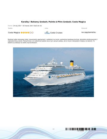 Karaiby i Bahamy – Pointe-à-Pitre – Costa Magica Termin: 24 luty 2017 - 03 marzec 2017 (ilość dni: 8) Statek: Costa Magica Linia: Cena od: Costa Cruises na zapytanie/os. Wyobraź sobie luksusowy hotel, niesamowity apartament z widokiem na morze, wykwintną światową kuchnię, atmosferę ekskluzywności i najznakomitszy serwis. Pomyśl teraz, że codziennie budzisz się w tym samym pokoju, ale w innym niezwykłym miejscu na świecie. To właśnie są wakacje na statku wycieczkowym. 1/3 EV:42056 TRASA REJSU Data Port Wpłynięcie Wypłynięcie piątek 24.02.2017 Pointe-a-Pitre 23:00 23:00 dzień 2 sobota 25.02.2017 Dzień na morzu --:-- --:-- dzień 3 niedziela 26.02.2017 Santo Domingo 07:00 23:59 Republika Dominikańska poniedziałek 27.02.2017 07:00 16:00 Republika Dominikańska 12:00 21:00 07:00 20:00 08:00 18:00 08:00 08:00 dzień 1 dzień 4 dzień 5 dzień 6 dzień 7 dzień 8 wtorek 28.02.2017 środa 01.03.2017 Legenda Gwadelupa Catalina Island Sint Maarten Sint Maarten Antigua, Antigua Antigua i Barbuda czwartek 02.03.2017 Fort-de-France piątek 03.03.2017 Pointe-a-Pitre Martynika Gwadelupa CENNIK Cena katalogowa Premium €879.00 Suite with Ocean View<br>Balcony €1 499.00 Mini Suite with Ocean View Balcony €1 349.00 Classic €1 049.00 Premium €1 149.00 Grand Suite with Ocean View Balcony €1 899.00 Opłaty portowe Cena promocyjna €140.00 Uwaga! Ceny za osobę w kabinie dwuosobowej. 2/3 EV:42056 Cena zawiera: zakwaterowanie w kabinie wybranej kategorii; wyżywienie - 3 główne posiłki, przekąski między posiłkami; napoje serwowane do śniadania i w bufetach samoobsługowych; serwis bagażowy podczas wejścia i zejścia ze statku; serwis kabinowy; korzystanie ze wszystkich urządzeń sportowo - rekreacyjnych znajdujących się na pokładzie statku (basen, jacuzzi, sala fitness, itp.); udział we wszystkich imprezach organizowanych na statku (przedstawienia w teatrze, koncerty, programy animacyjne itp.). Cena nie zawiera: kosztów dojazdu do portu; opłat portowych; ewentualnych noclegów w hotelu przed/po rejsie i transferów; wycieczek fakultatywnych w trakcie rejsu; korzystania z barów, mini baru w kabinie oraz napojów zamawianych w restauracji; korzystania z punktów usługowych (fryzjer, pralnia, fotograf, salon piękności i odnowy biologicznej, internet) i wydatków osobistych; napiwków dla obsługi na statku (kwota uzależniona od długości rejsu); ubezpieczenia KL, NNW i bagaż, kosztów wiz (tam gdzie wymagane). Uwagi: Od 01.12.2015 na wszystkich rejsach Costa Cruises (z min. 5 noclegów) można zarezerwować następujące pakiety all inclusive: dla dzieci 4-17 lat Giovani od 15.99€/os./dzień, dla dorosłych: Brindiamo od 24.99€/os./dzień, Piu Gusto od 27.99€/os./dzień, Intenditore od 45.99€/os./dzień (pakiet musi być wykupiony przez każdą osobę zakwaterowaną w kabinie - można zakupić w biurze przed rejsem). Na Państwa życzenie zarezerwujemy przelot, transfery do/z portu, parking, dodatkowe noclegi oraz zadbamy o odpowiednie ubezpieczenie podróżne. 3/3 EV:42056