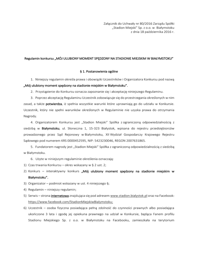 Załącznik do Uchwały nr 80/2016 Zarządu Spółki „Stadion Miejski” Sp. z o.o. w Białymstoku z dnia 18 października 2016 r. Regulamin konkursu „MÓJ ULUBIONY MOMENT SPĘDZONY NA STADIONIE MIEJSKIM W BIAŁYMSTOKU” § 1. Postanowienia ogólne 1. Niniejszy regulamin określa prawa i obowiązki Uczestników i Organizatora Konkursu pod nazwą „Mój ulubiony moment spędzony na stadionie miejskim w Białymstoku”. 2. Przystąpienie do Konkursu oznacza zapoznanie się i akceptację niniejszego Regulaminu. 3. Poprzez akceptację Regulaminu Uczestnik zobowiązuje się do przestrzegania określonych w nim zasad, a także potwierdza, iż spełnia wszystkie warunki które uprawniają go do udziału w Konkursie. Uczestnik, który nie spełni warunków określonych w Regulaminie nie uzyska prawa do otrzymania Nagrody. 4. Organizatorem Konkursu jest „Stadion Miejski” Spółka z ograniczoną odpowiedzialnością z siedzibą w Białymstoku, ul. Słoneczna 1, 15-323 Białystok, wpisana do rejestru przedsiębiorców prowadzonego przez Sąd Rejonowy w Białymstoku, XII Wydział Gospodarczy Krajowego Rejestru Sądowego pod numerem KRS 0000452595, NIP: 5423230046, REGON 2007631865. 5. Fundatorem nagrody jest „Stadion Miejski” Spółka z ograniczoną odpowiedzialnością z siedzibą w Białymstoku. 6. Użyte w niniejszym regulaminie określenia oznaczają: 1) Czas trwania Konkursu – okres wskazany w § 2 ust. 2; 2) Konkurs – interaktywny konkurs „Mój ulubiony moment spędzony na stadionie miejskim w Białymstoku”. 3) Organizator – podmiot wskazany w ust. 4 niniejszego §; 4) Regulamin – niniejszy regulamin; 5) Serwis – strona internetowa znajdująca się pod adresem www.stadion.bialystok.pl oraz na Facebook: https://www.facebook.com/StadionMiejskiwBialymstoku; 6) Uczestnik – osoba fizyczna posiadająca pełną zdolność do czynności prawnych albo posiadająca ukończone 3 lata i zgodę jej opiekuna prawnego na udział w Konkursie, będąca Fanem profilu Stadionu Miejskiego Sp. z o.o. w Białymstoku na Facebooku, zamieszkała na terytorium Rzeczypospolitej Polskiej, która nie jest pracownikiem ani współpracownikiem Organizatora albo członkiem rodziny pracownika lub współpracownika Organizatora; 7) Fan – osoba, która kliknęła „Lubię to” na profilu firmy Stadion Miejski sp. z o.o. w Białymstoku i tym samym zyskała status Fana; 8) Konkursowy Materiał – materiały promocyjno-reklamowe- zamieszczone w chwili rozpoczęcia Konkursu w Serwisie mają jedynie charakter informacyjny. § 2. Miejsce i czas trwania Konkursu 1. Konkurs jest przeprowadzany w Serwisie internetowym Organizatora oraz na portalu Facebook. 2. Konkurs będzie trwał od dnia 19 października 2016 r. od godziny 9:00 do 24 października 2016 r. do godz. 11:00. 3. W dniu 27 października 2016 r. do godzinie 11:00 na portalu Facebook zostaną opublikowane najciekawsze zdjęcia lub prace i poddane ocenie fanów profilu firmy Stadion Miejski sp. z o. o. w Białymstoku. 4. Ogłoszenie wyników Konkursu nastąpi na stronie internetowej Stadionu oraz na portalu Facebook w dniu 31 października 2016 r. o godzinie 11:00. 5. Organizator zastrzega sobie prawo do wcześniejszego zakończenia Konkursu bez podania przyczyn. § 3. Zasady przeprowadzenia Konkursu 1. Aby wziąć udział w Konkursie Uczestnik powinien przesłać zdjęcie lub pracę plastyczną wykonaną dowolną techniką prezentującą „Mój ulubiony moment spędzony na stadionie miejskim w Białymstoku”. Zdjęcie lub pracę należy przesłać na adres mailowy [email protected] lub pocztą na adres: Stadion Miejski Sp. z o.o., ul Słoneczna 1, 15-323 Białystok bądź dostarczyć osobiście do sekretariatu Stadionu z dopiskiem w tytule e-maila lub na kopercie: „Mój ulubiony moment spędzony na Stadionie Miejskim w Białymstoku” wraz z niniejszym oświadczeniem „Oświadczam, że wyrażam zgodę na przetwarzanie moich danych osobowych zgodnie z Ustawą z dnia 29 sierpnia 1997 r. o ochronie danych osobowych (t.j. Dz. U. 2016, poz. 922 z późn. zm.) dla celów związanych z przeprowadzeniem niniejszego Konkursu”. Każdy Uczestnik może przesłać jeden egzemplarz zdjęcia lub wykonanej pracy plastycznej 2. Zdjęcia lub prace przesłane bez wyrażenia zgody na przetwarzanie danych osobowych nie zostaną zakwalifikowane do wzięcia udziału w konkursie. 3. Przesyłając zgłoszenie w sposób, o którym mowa w ust. 1 Uczestnik oświadcza, że: 1) zapoznał się z Regulaminem i akceptuje go; 2) spełnia warunki określone w Regulaminie; 3) wyraża zgodę na opublikowanie przesłanego zdjęcia bądź pracy oraz swojego imienia i nazwiska na stronie www.stadion.bialystok.pl oraz na portalu www.facebook.com/StadionMiejskiwBialymstoku; 4) wyraża zgodę na przetwarzanie danych osobowych niezbędnych w celu prawidłowego przeprowadzenia Konkursu oraz wydania nagród. 4. Organizator zastrzega sobie prawo do wykluczenia z Konkursu Uczestnika w każdym czasie, jeżeli Uczestnik naruszy warunki udziału w Konkursie określone w Regulaminie. 5. Celem zapewnienia prawidłowej organizacji Konkursu oraz wyłonienia Zwycięzców, Organizator powołuje komisję konkursową. Wszelkie wątpliwości dotyczące zasad Konkursu, interpretacji i postanowień tego Regulaminu rozstrzyga Organizator. § 4. Zwycięzcy Konkursu i nagrody 1. Spośród nadesłanych prac Komisja wybierze najciekawsze zdjęcia lub prace. Liczy się kreatywność i pomysłowość wykonanego zdjęcia lub pracy. 2. Najciekawsze zdjęcia lub prace zostaną opublikowane na portalu Facebook. Zwycięzcami konkursu będą osoby, których zdjęcia lub prace zdobędą największą liczbę polubień, czyli kliknięć „Lubię to”. 3. Nagrodami dla Zwycięzców są: 1 x płyta z autografem Beaty Kozidrak, 2 x piłka , 3 x kubek wraz z gadżetami firmowymi Stadionu (torba, długopis, puzzle, malowanka, kredki) przyznane 6 osobom w następującej kolejności: 1) I miejsce: 1 x płyta z autog