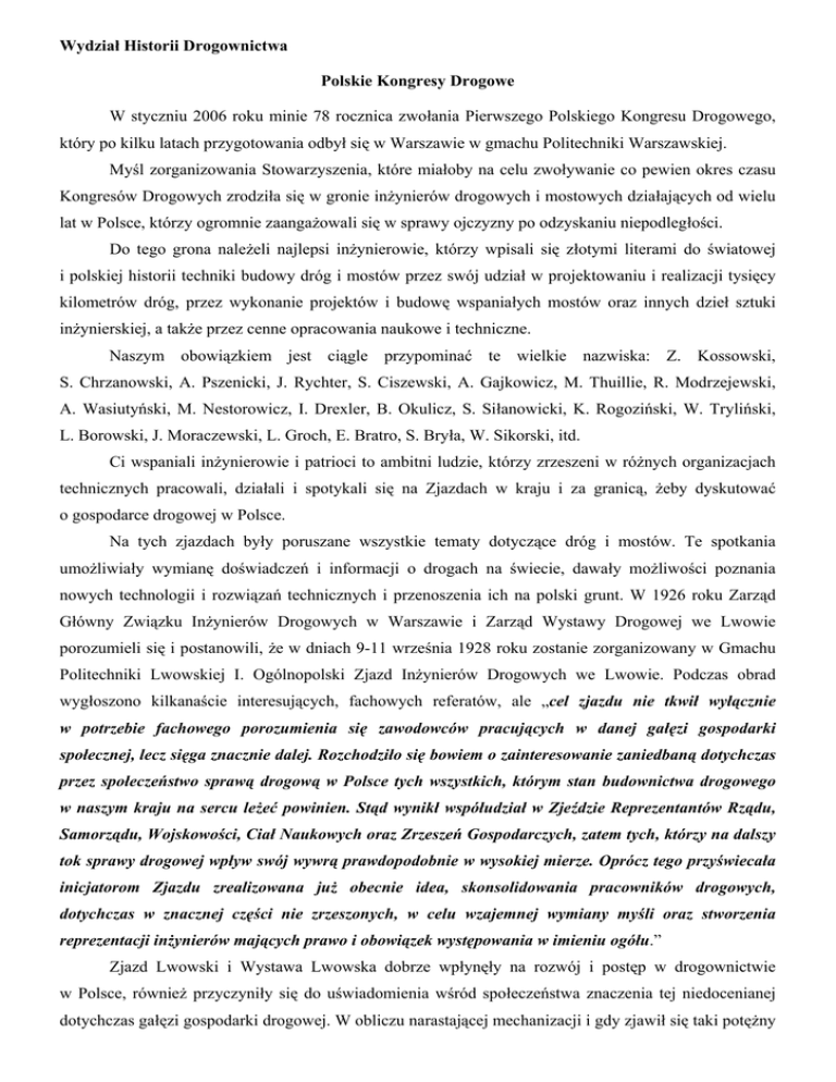 Wydział Historii Drogownictwa Polskie Kongresy Drogowe W styczniu 2006 roku minie 78 rocznica zwołania Pierwszego Polskiego Kongresu Drogowego, który po kilku latach przygotowania odbył się w Warszawie w gmachu Politechniki Warszawskiej. Myśl zorganizowania Stowarzyszenia, które miałoby na celu zwoływanie co pewien okres czasu Kongresów Drogowych zrodziła się w gronie inżynierów drogowych i mostowych działających od wielu lat w Polsce, którzy ogromnie zaangażowali się w sprawy ojczyzny po odzyskaniu niepodległości. Do tego grona należeli najlepsi inżynierowie, którzy wpisali się złotymi literami do światowej i polskiej historii techniki budowy dróg i mostów przez swój udział w projektowaniu i realizacji tysięcy kilometrów dróg, przez wykonanie projektów i budowę wspaniałych mostów oraz innych dzieł sztuki inżynierskiej, a także przez cenne opracowania naukowe i techniczne. Naszym obowiązkiem jest ciągle przypominać te wielkie nazwiska: Z. Kossowski, S. Chrzanowski, A. Pszenicki, J. Rychter, S. Ciszewski, A. Gajkowicz, M. Thuillie, R. Modrzejewski, A. Wasiutyński, M. Nestorowicz, I. Drexler, B. Okulicz, S. Siłanowicki, K. Rogoziński, W. Tryliński, L. Borowski, J. Moraczewski, L. Groch, E. Bratro, S. Bryła, W. Sikorski, itd. Ci wspaniali inżynierowie i patrioci to ambitni ludzie, którzy zrzeszeni w różnych organizacjach technicznych pracowali, działali i spotykali się na Zjazdach w kraju i za granicą, żeby dyskutować o gospodarce drogowej w Polsce. Na tych zjazdach były poruszane wszystkie tematy dotyczące dróg i mostów. Te spotkania umożliwiały wymianę doświadczeń i informacji o drogach na świecie, dawały możliwości poznania nowych technologii i rozwiązań technicznych i przenoszenia ich na polski grunt. W 1926 roku Zarząd Główny Związku Inżynierów Drogowych w Warszawie i Zarząd Wystawy Drogowej we Lwowie porozumieli się i postanowili, że w dniach 9-11 września 1928 roku zostanie zorganizowany w Gmachu Politechniki Lwowskiej I. Ogólnopolski Zjazd Inżynierów Drogowych we Lwowie. Podczas obrad wygłoszono kilkanaście interesujących, fachowych referatów, ale „cel zjazdu nie tkwił wyłącznie w potrzebie fachowego porozumienia się zawodowców pracujących w danej gałęzi gospodarki społecznej, lecz sięga znacznie dalej. Rozchodziło się bowiem o zainteresowanie zaniedbaną dotychczas przez społeczeństwo sprawą drogową w Polsce tych wszystkich, którym stan budownictwa drogowego w naszym kraju na sercu leżeć powinien. Stąd wynikł współudział w Zjeździe Reprezentantów Rządu, Samorządu, Wojskowości, Ciał Naukowych oraz Zrzeszeń Gospodarczych, zatem tych, którzy na dalszy tok sprawy drogowej wpływ swój wywrą prawdopodobnie w wysokiej mierze. Oprócz tego przyświecała inicjatorom Zjazdu zrealizowana już obecnie idea, skonsolidowania pracowników drogowych, dotychczas w znacznej części nie zrzeszonych, w celu wzajemnej wymiany myśli oraz stworzenia reprezentacji inżynierów mających prawo i obowiązek występowania w imieniu ogółu.” Zjazd Lwowski i Wystawa Lwowska dobrze wpłynęły na rozwój i postęp w drogownictwie w Polsce, również przyczyniły się do uświadomienia wśród społeczeństwa znaczenia tej niedocenianej dotychczas gałęzi gospodarki drogowej. W obliczu narastającej mechanizacji i gdy zjawił się taki potężny czynnik ruchu na drogach, jakim jest współczesny samochód, to nie kto inny jak drogowcy najlepiej rozumieli przyszłe potrzeby i wymogi, które będą musiały spełniać nowobudowane drogi i konieczność przystosowania istniejącej sieci drogowej dla potrzeb przyszłych użytkowników. Na kilka lat przed zorganizowaniem Zjazdu i Wystawy we Lwowie z inicjatywy organizacji zrzeszających inżynierów drogowych został powołany Tymczasowy Komitet Organizacyjny Stowarzyszenia Członków Polskich Kongresów Drogowych i Komitet Wykonawczy. Na czele tego Komitetu stanął inżynier Melchior Władysław Nestorowicz pełniący funkcję dyrektora departamentu drogowego Ministerstwa Robót Publicznych. Na VIII Zjeździe Inżynierów Drogowych w Warszawie, który odbył się w czerwcu 1925 roku zapadła uchwała o zainicjowaniu Polskiego Kongresu Drogowego. Komitet opracował statut organizacji i złożył go do rejestracji. Komitet organizacyjny wziął na siebie obowiązek rozpropagowania idei zwołania Polskiego Kongresu Drogowego podczas trwania obrad i pracy I. Ogólnopolskiego Zjazdu we Lwowie oraz do złożenia próśb i wniosków do prezydium Zjazdu o poparcie przez Zjazd zamierzeń tego Komitetu. Należy przypomnieć, że w tym czasie kiedy trwał Zjazd we Lwowie równolegle w Mediolanie we Włoszech odbywał się V Międzynarodowy Kongres Drogowy, w którym brało udział 2000 uczestników. Przesłali oni serdeczne pozdrowienia i życzenia pomyślności w pracy dla uczestników Zjazdu we Lwowie. W imieniu wszystkich uczestników V Międzynarodowego Kongresu Drogowego depesze podpisał Naczelny Sekretarz Kongresu Lori. Należy zwrócić uwagę na fakt, ze w okresie przez zwołaniem I Polskiego Kongresu Drogowego w Warszawie, w społeczeństwie, a w szczególności w środowisku technicznym, członkowie Związku Inżynierów Drogowych Rzeczypospolitej Polskiej zrobili ogromną, nieocenioną, potrzebną i pożyteczną pracę. Owocem tej pracy stało się zorganizowanie w Polsce, w pięknym mieście i szczególnym miejscu, w gmachu Politechniki Lwowskiej, uczelni technicznej o światowej renomie I Ogólnopolskiego Zjazdu Inżynierów Drogowych i piękną I Ogólnopolską Wystawę Drogową oraz w ostatnim dniu Zjazdu przeprowadzić w dniu 11 września 1926 roku, wspólnie z gośćmi Zjazdu – IX Walne Zebranie Członków Związku Inżynierów Drogowych. Ta rzetelnie wykonana praca pozwoliła i przyczyniła się do zjednoczenia wszystkich ludzi, którym leżała na sercu sprawa dróg, mostów i drogownictwa w ojczyźnie. Organizatorzy tych i