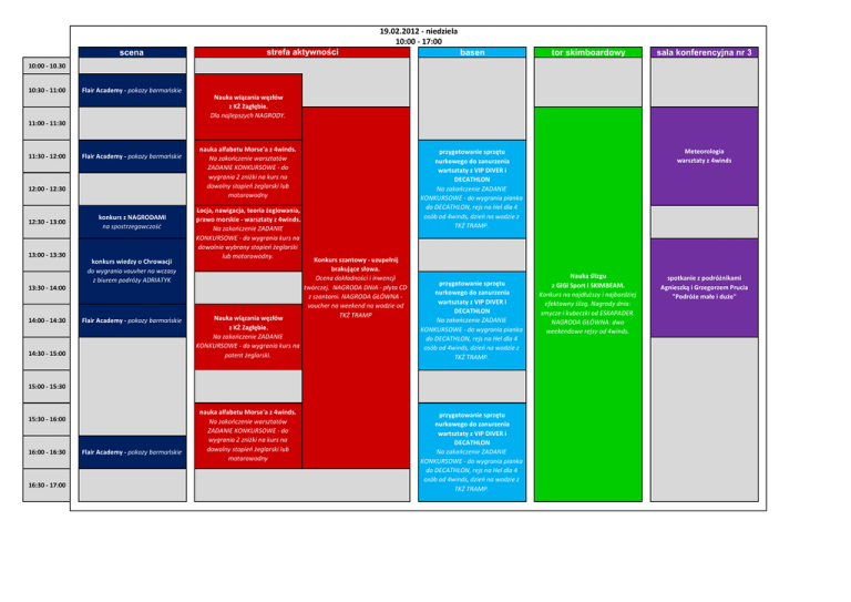 19.02.2012 - niedziela 10:00 - 17:00 scena strefa aktywności basen tor skimboardowy sala konferencyjna nr 3 10:00 - 10.30 10:30 - 11:00 Flair Academy - pokazy barmaoskie Nauka wiązania węzłów z KŻ Zagłębie. Dla najlepszych NAGRODY. 11:00 - 11:30 11:30 - 12:00 Flair Academy - pokazy barmaoskie 12:00 - 12:30 12:30 - 13:00 13:00 - 13:30 konkurs z NAGRODAMI na spostrzegawczośd konkurs wiedzy o Chrowacji do wygrania vouvher na wczasy z biurem podróży ADRIATYK nauka alfabetu Morse'a z 4winds. Na zakooczenie warsztatów ZADANIE KONKURSOWE - do wygrania 2 zniżki na kurs na dowolny stopieo żeglarski lub motorowodny Locja, nawigacja, teoria żeglowania, prawo morskie - warsztaty z 4winds. Na zakooczenie ZADANIE KONKURSOWE - do wygrania kurs na dowolnie wybrany stopieo żeglarski lub motorowodny. 13:30 - 14:00 14:00 - 14:30 Flair Academy - pokazy barmaoskie 14:30 - 15:00 Nauka wiązania węzłów z KŻ Zagłębie. Na zakooczenie ZADANIE KONKURSOWE - do wygrania kurs na patent żeglarski. Konkurs szantowy - uzupełnij brakujące słowa. Ocena dokładności i inwencji twórczej. NAGRODA DNIA - płyta CD z szantami. NAGRODA GŁÓWNA voucher na weekend na wodzie od TKŻ TRAMP przygotowanie sprzętu nurkowego do zanurzenia wartsztaty z VIP DIVER i DECATHLON Na zakooczenie ZADANIE KONKURSOWE - do wygrania pianka do DECATHLON, rejs na Hel dla 4 osób od 4winds, dzieo na wodzie z TKŻ TRAMP. 15:00 - 15:30 15:30 - 16:00 16:00 - 16:30 16:30 - 17:00 Flair Academy - pokazy barmaoskie nauka alfabetu Morse'a z 4winds. Na zakooczenie warsztatów ZADANIE KONKURSOWE - do wygrania 2 zniżki na kurs na dowolny stopieo żeglarski lub motorowodny Meteorologia warsztaty z 4winds przygotowanie sprzętu nurkowego do zanurzenia wartsztaty z VIP DIVER i DECATHLON Na zakooczenie ZADANIE KONKURSOWE - do wygrania pianka do DECATHLON, rejs na Hel dla 4 osób od 4winds, dzieo na wodzie z TKŻ TRAMP. przygotowanie sprzętu nurkowego do zanurzenia wartsztaty z VIP DIVER i DECATHLON Na zakooczenie ZADANIE KONKURSOWE - do wygrania pianka do DECATHLON, rejs na Hel dla 4 osób od 4winds, dzieo na wodzie z TKŻ TRAMP. Nauka ślizgu z GiGi Sport i SKIMBEAM. Konkurs na najdłuższy i najbardziej efektowny ślizg. Nagrody dnia: smycze i kubeczki od ESKAPADER. NAGRODA GŁÓWNA: dwa weekendowe rejsy od 4winds. spotkanie z podróżnikami Agnieszką i Grzegorzem Prucia "Podróże małe i duże"