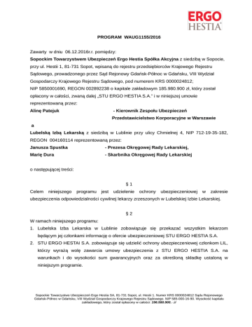 PROGRAM WAUG1155/2016 Zawarty w dniu 06.12.2016r.r. pomiędzy: Sopockim Towarzystwem Ubezpieczeń Ergo Hestia Spółka Akcyjna z siedzibą w Sopocie, przy ul. Hestii 1, 81-731 Sopot, wpisaną do rejestru przedsiębiorców Krajowego Rejestru Sądowego, prowadzonego przez Sąd Rejonowy Gdańsk-Północ w Gdańsku, VIII Wydział Gospodarczy Krajowego Rejestru Sądowego, pod numerem KRS 0000024812; NIP 5850001690, REGON 002892238 o kapitale zakładowym 185.980.900 zł, który został opłacony w całości, zwaną dalej „STU ERGO HESTIA S.A.” i w niniejszej umowie reprezentowaną przez: Alinę Patejuk - Kierownik Zespołu Ubezpieczeń Przedstawicielstwo Korporacyjne w Warszawie a Lubelską Izbą Lekarską z siedzibą w Lublinie przy ulicy Chmielnej 4, NIP 712-19-35-182, REGON 004160114 reprezentowaną przez: Janusza Spustka - Prezesa Okręgowej Rady Lekarskiej, Marię Dura - Skarbnika Okręgowej Rady Lekarskiej o następującej treści: §1 Celem niniejszego programu jest udzielenie ochrony ubezpieczeniowej w zakresie ubezpieczenia odpowiedzialności cywilnej lekarzy zrzeszonych w Lubelskiej Izbie Lekarskiej. §2 W ramach niniejszego programu: 1. Lubelska Izba Lekarska w Lublinie zobowiązuje się przekazać wszystkim lekarzom będącym jej członkami informację o ofercie ubezpieczeniowej STU ERGO HESTIA S.A. 2. STU ERGO HESTAI S.A. zobowiązuje się udzielić ochrony ubezpieczeniowej członkom LIL, którzy wyrażą wolę zawarcia umowy ubezpieczenia z STU ERGO HESTIA S.A. na warunkach i do wysokości sum gwarancyjnych oraz za określoną składkę ustaloną w niniejszym programie. Sopockie Towarzystwo Ubezpieczeń Ergo Hestia SA, 81-731 Sopot, ul. Hestii 1. Numer KRS 0000024812 Sądu Rejonowego Gdańsk-Północ w Gdańsku, VIII Wydział Gospodarczy Krajowego Rejestru Sądowego. NIP 585-000-16-90. Wysokość kapitału zakładowego, który został opłacony w całości: 196.580.900,- zł §3 W przypadku obowiązkowego ubezpieczenia odpowiedzialności cywilnej podmiotu wykonującego działalność leczniczą STU ERGO HESTIA S.A.. oferuje następujące warunki: 1. Zakres ubezpieczenia zgodny z rozporządzeniem ministra finansów z dnia 22.12.2011 r. w sprawie obowiązkowego ubezpieczenia odpowiedzialności cywilnej podmiotu wykonującego działalność leczniczą 2. Minimalna suma gwarancyjna ubezpieczenia OC w okresie ubezpieczenia nie dłuższym niż 12 miesięcy, wynosi równowartość w złotych 75 000 EUR w odniesieniu do jednego zdarzenia oraz 350 000 EUR w odniesieniu do wszystkich zdarzeń 3. Rozróżnia się trzy grupy ryzyka, według których zaszeregowane są osoby wykonujące zawód medyczny w ramach indywidualnej praktyki lekarskiej: a. lekarze III grupy - specjalizacja: ortopedia, chirurgia stomatologiczna, chirurgia naczyniowa, anestezjologia i intensywna terapia, chirurgia klatki piersiowej, chirurgia ogólna, chirurgia szczękowo-twarzowa, ginekologia onkologiczna kardiochirurgia, neurochirurgia i traumatologia narządu ruchu, położnictwo i ginekologia, chirurgia dziecięca, urologia, chirurgia onkologiczna, chirurgia plastyczna, urologia dziecięca, medycyna ratunkowa, neonatologia; b. lekarze II grupy - specjalizacja: ortodoncja, periodontologia, protetyka stomatologiczna, radioterapia onkologiczna, stomatologia zachowawcza, medycyna sportowa, stomatologia dziecięca c. lekarze I grupy - specjalizacja: lekarze pozostałych specjalności nie wymienionych w pkt a. lub pkt b. 4. W przypadku lekarzy zaszeregowanych do I grupy ryzyka, gdy lekarz specjalista wykonuje zabiegi chirurgiczne, endoskopowe lub z zakresu radiologii interwencyjnej nalicza się składkę przewidzianą dla grupy II. 5. W przypadku posiadania dwóch lub większej liczby specjalizacji, o zaszeregowaniu do odpowiedniej grupy decyduje ta specjalizacja, która jest faktycznie wykonywana. Jeżeli lekarz ma dwie lub więcej specjalizacji i wszystkie wykonuje, to o przynależności do grupy decyduje ta specjalizacja, która jest w grupie o najwyższej składce. 6. W przypadku braku specjalizacji, składkę ustala się według I grupy ryzyka z zastrzeżeniem ust. 4. 7. W przypadku posiadania specjalizacji, a wykonywania w praktyce innej specjalizacji (w trakcie specjalizowania się), o przynależności do odpowiedniej grupy decyduje specjalizacja faktycznie wykonywana. Sopockie Towarzystwo Ubezpieczeń Ergo Hestia SA, 81-731 Sopot, ul. Hestii 1. Numer KRS 0000024812 Sądu Rejonowego Gdańsk-Północ w Gdańsku, VIII Wydział Gospodarczy Krajowego Rejestru Sądowego. NIP 585-000-16-90. Wysokość kapitału zakładowego, który został opłacony w całości: 196.580.900,- zł 8. Składka roczna: a/ lekarze III grupy ryzyka – 400,00 PLN b/ lekarze II grupy ryzyka – 190,00 PLN c/ lekarze I grupy ryzyka – 80,00 PLN §4 W przypadku dobrowolnego ubezpieczenia odpowiedzialności cywilnej osób wykonujących zawód lekarza, STU ERGO HESTIA S.A.. oferuje następujące warunki: Podstawę zawarcia umowy stanowią Ogólne Warunki Ubezpieczenia Odpowiedzialności Cywilnej lekarzy, farmaceutów i innych osób świadczących usługi o charakterze medycznym z dnia 01.01.2016 ( OC/OW033/1601). W powyższych OWU zmienia się definicję wypadku zawartą w par.4 punkt 11 na czynność zawodową, co powoduje zmianę czasowego zakresu ochrony w OWU określonego w par. 5 ust.2 z triggera loss occurrance na trigger act committed. Wyjaśnienie: Oznacza to, że Ergo Hestia obejmuje ochroną szkody w mieniu i na osobie będące następstwem uchybień przy wykonywaniu zawodu w służbie zdrowia przez Ubezpieczonego do których doszło w okresie ubezpieczenia, niezależnie od tego kiedy powstała szkoda i kiedy zostało zgłoszone roszczenie z tego tytułu (z zastrzeżeniem ustawowych terminów przedawnienia roszczeń). 1. W zakresie niniejszego programu ochrona ubezpieczeniowa obejmuje rażące niedbalstwo. 2. Zakres jest rozszerzony o szkody na osobie wynikłe z przeniesienia chorób zakaźnych (w tym HIV i WZW) sublimit maksymalny 
