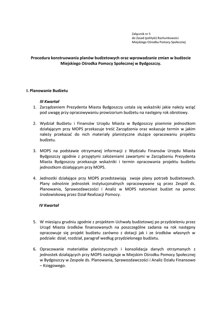 Załącznik nr 5 do Zasad (polityki) Rachunkowości Miejskiego Ośrodka Pomocy Społecznej Procedura konstruowania planów budżetowych oraz wprowadzanie zmian w budżecie Miejskiego Ośrodka Pomocy Społecznej w Bydgoszczy. I. Planowanie Budżetu III Kwartał 1. Zarządzeniem Prezydenta Miasta Bydgoszczy ustala się wskaźniki jakie należy wziąć pod uwagę przy opracowywaniu prowizorium budżetu na następny rok obrotowy. 2. Wydział Budżetu i Finansów Urzędu Miasta w Bydgoszczy pisemnie jednostkom działającym przy MOPS przekazuje treść Zarządzenia oraz wskazuje termin w jakim należy przekazać do nich materiały planistyczne służące opracowaniu projektu budżetu. 3. MOPS na podstawie otrzymanej informacji z Wydziału Finansów Urzędu Miasta Bydgoszczy zgodnie z przyjętymi założeniami zawartymi w Zarządzeniu Prezydenta Miasta Bydgoszczy przekazuje wskaźniki i termin opracowania projektu budżetu jednostkom działającym przy MOPS. 4. Jednostki działające przy MOPS przedstawiają swoje plany potrzeb budżetowych. Plany odnośnie jednostek instytucjonalnych opracowywane są przez Zespół ds. Planowania, Sprawozdawczości i Analiz w MOPS natomiast budżet na pomoc środowiskową przez Dział Realizacji Pomocy. IV Kwartał 5. W miesiącu grudniu zgodnie z projektem Uchwały budżetowej po przydzieleniu przez Urząd Miasta środków finansowanych na poszczególne zadania na rok następny opracowuje się projekt budżetu zarówno z dotacji jak i ze środków własnych w podziale: dział, rozdział, paragraf według przydzielonego budżetu. 6. Opracowanie materiałów planistycznych i konsolidacja danych otrzymanych z jednostek działających przy MOPS następuje w Miejskim Ośrodku Pomocy Społecznej w Bydgoszczy w Zespole ds. Planowania, Sprawozdawczości i Analiz Działu Finansowo – Księgowego. 7. Do Urzędu Miasta Bydgoszczy MOPS przekazuje w dwóch wersjach prowizorium budżetu na następny rok obrotowy: ściśle według wskaźników, według rzeczywistych potrzeb. 8. Urząd Miasta Bydgoszczy konsoliduje dane ze wszystkich swoich jednostek podległych, przekazuje do Rady Miasta Bydgoszczy. 9. Rada Miasta Bydgoszczy w formie Uchwały zatwierdza Prowizorium Budżetowe na następny rok obrotowy. 10. Zatwierdzone Prowizorium Wydział Budżetu Finansów Urzędu Miasta Bydgoszczy przekazuje do jednostek podległych w tym do Miejskiego Ośrodka Pomocy Społecznej. 11. Na podstawie otrzymanego prowizorium Zespół ds. Planowania, Sprawozdawczości i Analiz sporządza prowizoria dla jednostek działających przy MOPS i w formie pisemnej przekazuje bezpośrednio jednostce w formie planu do realizacji. 12. Budżet Miasta wprowadza się Uchwałą Rady Miasta Bydgoszczy najpóźniej do miesiąca marca . 13. Na podstawie pisma z Wydziału Budżetu i Finansów Urzędu Miasta, Miejski Ośrodek Pomocy Społecznej w Bydgoszczy przekazuje jednostkom pomocy społecznej treść Uchwał. 14. Na podstawie Uchwały Budżetowej Miejski Ośrodek Pomocy Społecznej w Bydgoszczy oraz jednostki pomocy społecznej sporządzają plan budżetu w podziale na działy, rozdziały i paragrafy dochodów i wydatków. II. Wykonanie Budżetu 1. MOPS w trakcie roku budżetowego składa do Wydziału Budżetów i Finansów sprawozdania z wykonania budżetu według aktualnie obowiązującego planu finansowego. 2. Na podstawie danych zawartych w sprawozdaniach z jednostek pomocy społecznej oraz danych księgowych prowadzonych przez MOPS sporządza się sprawozdania zbiorcze z podziałem: dział, rozdział, paragraf i przekazuje do Urzędu Miasta do dnia 10 każdego miesiąca. 3. Jednostki działające przy MOPS składają sprawozdania z wykonania budżetu do MOPS do dnia 05 każdego miesiąca. III. Zasady obowiązujące w toku planowania i wykonania budżetu 1. Do chwili wprowadzania Uchwałą Rady Miasta Budżetu na dany rok kalendarzowy nie wprowadza się żadnych zmian za wyjątkiem skutków finansowych wynikających ze zmian przepisów prawnych bądź zatwierdzonych zmian organizacyjnych. 2. Wszelkie zmiany w ciągu roku wynikające z braku środków finansowych bądź przesunięć środków pomiędzy rodzajami wydatków dokonuje się w formie pisemnej na podstawie pisemnej woli jednostki bądź na podstawie dokonanych analiz działając dla zachowania płynności finansowej. 3. MOPS jest uprawniony do dokonywania przesunięć środków finansowych w tym samym rozdziale i paragrafie pomiędzy jednostkami pomocy społecznej. 4. Wszelkie zmiany planu budżetowego dokonywane pomiędzy rozdziałami i paragrafami realizowane są Uchwałą Rady Miasta Bydgoszczy bądź Zarządzeniem Prezydenta Miasta Bydgoszczy – o czym decyduje Wdział Budżetu i Finansów. 5. Ogólny nadzór nad realizacją określonych Uchwałą budżetową dochodów i wydatków MOPS oraz jednostek pomocy społecznej sprawuje Miejski Ośrodek Pomocy Społecznej.