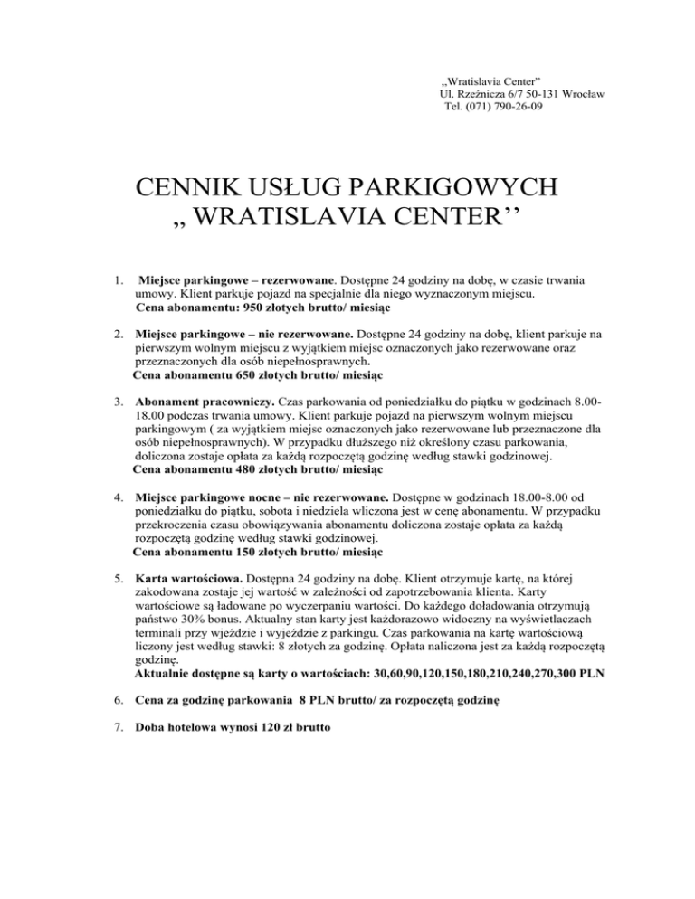 ,,Wratislavia Center” Ul. Rzeźnicza 6/7 50-131 Wrocław Tel. (071) 790-26-09 CENNIK USŁUG PARKIGOWYCH „ WRATISLAVIA CENTER’’ 1. Miejsce parkingowe – rezerwowane. Dostępne 24 godziny na dobę, w czasie trwania umowy. Klient parkuje pojazd na specjalnie dla niego wyznaczonym miejscu. Cena abonamentu: 950 złotych brutto/ miesiąc 2. Miejsce parkingowe – nie rezerwowane. Dostępne 24 godziny na dobę, klient parkuje na pierwszym wolnym miejscu z wyjątkiem miejsc oznaczonych jako rezerwowane oraz przeznaczonych dla osób niepełnosprawnych. Cena abonamentu 650 złotych brutto/ miesiąc 3. Abonament pracowniczy. Czas parkowania od poniedziałku do piątku w godzinach 8.0018.00 podczas trwania umowy. Klient parkuje pojazd na pierwszym wolnym miejscu parkingowym ( za wyjątkiem miejsc oznaczonych jako rezerwowane lub przeznaczone dla osób niepełnosprawnych). W przypadku dłuższego niż określony czasu parkowania, doliczona zostaje opłata za każdą rozpoczętą godzinę według stawki godzinowej. Cena abonamentu 480 złotych brutto/ miesiąc 4. Miejsce parkingowe nocne – nie rezerwowane. Dostępne w godzinach 18.00-8.00 od poniedziałku do piątku, sobota i niedziela wliczona jest w cenę abonamentu. W przypadku przekroczenia czasu obowiązywania abonamentu doliczona zostaje oplata za każdą rozpoczętą godzinę według stawki godzinowej. Cena abonamentu 150 złotych brutto/ miesiąc 5. Karta wartościowa. Dostępna 24 godziny na dobę. Klient otrzymuje kartę, na której zakodowana zostaje jej wartość w zależności od zapotrzebowania klienta. Karty wartościowe są ładowane po wyczerpaniu wartości. Do każdego doładowania otrzymują państwo 30% bonus. Aktualny stan karty jest każdorazowo widoczny na wyświetlaczach terminali przy wjeździe i wyjeździe z parkingu. Czas parkowania na kartę wartościową liczony jest według stawki: 8 złotych za godzinę. Opłata naliczona jest za każdą rozpoczętą godzinę. Aktualnie dostępne są karty o wartościach: 30,60,90,120,150,180,210,240,270,300 PLN 6. Cena za godzinę parkowania 8 PLN brutto/ za rozpoczętą godzinę 7. Doba hotelowa wynosi 120 zł brutto