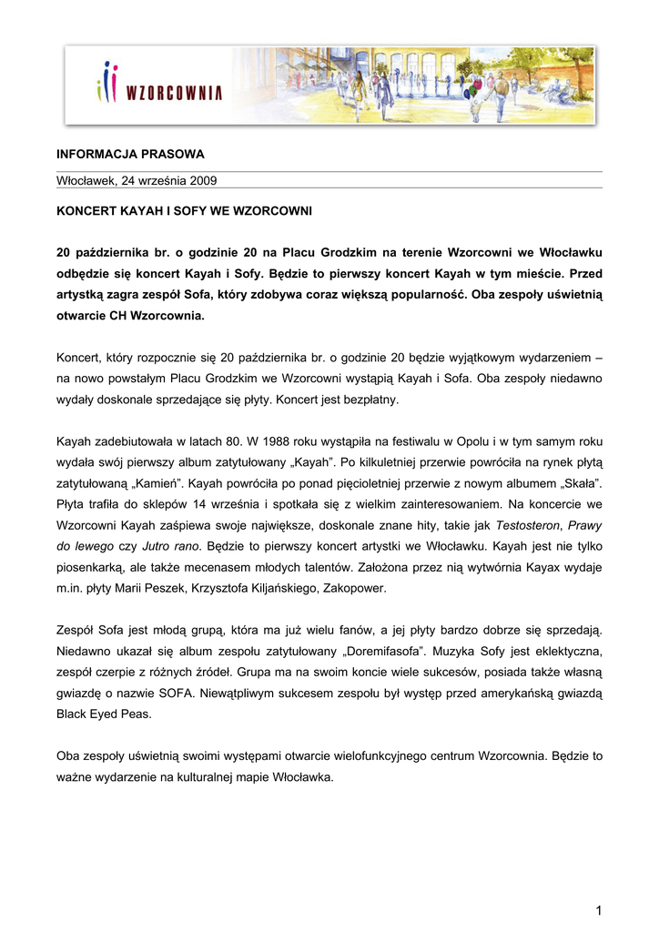 INFORMACJA PRASOWA Włocławek, 24 września 2009 KONCERT KAYAH I SOFY WE WZORCOWNI 20 października br. o godzinie 20 na Placu Grodzkim na terenie Wzorcowni we Włocławku odbędzie się koncert Kayah i Sofy. Będzie to pierwszy koncert Kayah w tym mieście. Przed artystką zagra zespół Sofa, który zdobywa coraz większą popularność. Oba zespoły uświetnią otwarcie CH Wzorcownia. Koncert, który rozpocznie się 20 października br. o godzinie 20 będzie wyjątkowym wydarzeniem – na nowo powstałym Placu Grodzkim we Wzorcowni wystąpią Kayah i Sofa. Oba zespoły niedawno wydały doskonale sprzedające się płyty. Koncert jest bezpłatny. Kayah zadebiutowała w latach 80. W 1988 roku wystąpiła na festiwalu w Opolu i w tym samym roku wydała swój pierwszy album zatytułowany „Kayah”. Po kilkuletniej przerwie powróciła na rynek płytą zatytułowaną „Kamień”. Kayah powróciła po ponad pięcioletniej przerwie z nowym albumem „Skała”. Płyta trafiła do sklepów 14 września i spotkała się z wielkim zainteresowaniem. Na koncercie we Wzorcowni Kayah zaśpiewa swoje największe, doskonale znane hity, takie jak Testosteron, Prawy do lewego czy Jutro rano. Będzie to pierwszy koncert artystki we Włocławku. Kayah jest nie tylko piosenkarką, ale także mecenasem młodych talentów. Założona przez nią wytwórnia Kayax wydaje m.in. płyty Marii Peszek, Krzysztofa Kiljańskiego, Zakopower. Zespół Sofa jest młodą grupą, która ma już wielu fanów, a jej płyty bardzo dobrze się sprzedają. Niedawno ukazał się album zespołu zatytułowany „Doremifasofa”. Muzyka Sofy jest eklektyczna, zespół czerpie z różnych źródeł. Grupa ma na swoim koncie wiele sukcesów, posiada także własną gwiazdę o nazwie SOFA. Niewątpliwym sukcesem zespołu był występ przed amerykańską gwiazdą Black Eyed Peas. Oba zespoły uświetnią swoimi występami otwarcie wielofunkcyjnego centrum Wzorcownia. Będzie to ważne wydarzenie na kulturalnej mapie Włocławka. 1