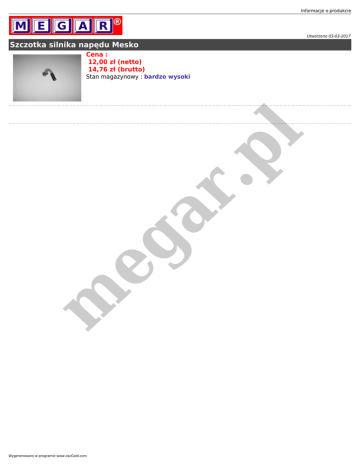Informacje o produkcie Utworzono 03-03-2017 Szczotka silnika napędu Mesko Cena : 12,00 zł (netto) 14,76 zł (brutto) m eg ar .p l Stan magazynowy : bardzo wysoki Wygenerowano w programie www.oscGold.com