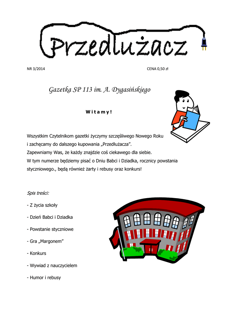 NR 3/2014 CENA 0,50 zł Gazetka SP 113 im. A. Dygasińskiego Witamy! Wszystkim Czytelnikom gazetki życzymy szczęśliwego Nowego Roku i zachęcamy do dalszego kupowania „Przedłużacza”. Zapewniamy Was, że każdy znajdzie coś ciekawego dla siebie. W tym numerze będziemy pisać o Dniu Babci i Dziadka, rocznicy powstania styczniowego., będą również żarty i rebusy oraz konkurs! Spis treści: - Z życia szkoły - Dzień Babci i Dziadka - Powstanie styczniowe - Gra „Margonem” - Konkurs - Wywiad z nauczycielem - Humor i rebusy Z życia szkoły Jasełka 19 XII w naszej szkole odbyła się uroczystość świąteczna. Co ciekawe przedstawienie tym razem przygotowali nie uczniowie pod kierunkiem nauczyciela, ale sami nauczyciele. Uczniom bardzo podobał się występ pedagogów szkolnych. Wigilia W dniach 19 i 20 XII w naszej szkole odbywały się wigilie. Niektóre klasy na uroczystość wigilijną poszły do Centrum Kultury Młodych, gdzie w pięknie przystrojonej sali prezenty rozdawał Mikołaj. !!!Uwaga!!! !!!Konkurs!!! Masz ołówek, kartkę, pomysł/wyobraźnię? - weź udział w tym konkursie! Nagroda jest w miarę tajemnicza, ale wygrana osoba nie powinna żałować udziału w tym konkursie. Jako iż ja uznaję tylko 1 miejsce tak będzie i tym razem, więc postaraj się! Trzeba narysować krajobraz zimowy/pokój ustrojony do świąt/ stół czekający na pierwszą gwiazdkę. Zasady: Można używać tylko ołówka. Prace zgłaszać do Krzysztofa Tesławskiego, ucznia klasy 6B. Odgadnij rebusy! Z kart historii … Powstanie styczniowe – 22 stycznia 1863 r. Powstanie styczniowe było kolejnym zrywem narodowym Polaków wymierzonym przeciwko naszym zaborcom, a przede wszystkim przeciwko Imperium Rosyjskiemu. Rozpoczęło się 22 stycznia 1863 r. i trwało do jesieni 1864r. Było największym polskim powstaniem narodowym. Miało charakter wojny partyzanckiej, w której stoczono ok. 1200 bitew i potyczek. Mimo początkowych sukcesów zakończyło się klęską powstańców, z których kilkadziesiąt tysięcy zostało zabitych w walkach, blisko 1 tysiąc straconych, około 38 tys. skazanych na katorgę lub zesłanych na Sybir. Po powstaniu zaborcy natychmiast rozpoczęli represje przeciwko Polakom. Władze rosyjskie przystąpiły też do wzmożonej rusyfikacji społeczeństwa polskiego. Polacy musieli jeszcze czekać wiele lat aby odzyskać niepodległość. Ta wymarzona chwila przyszła wraz z zakończeniem I wojny światowej 11 listopada 1918 r. Ciekawe gry internetowe. "Margonem" "Margonem" jest to gra przeglądarkowa typu MMORPG, która teoretycznie nie ma fabuły. Jaki jest w niej cel? Wielu ludzi wymyśla swój, niektórzy chcę zdobyć jak najwyższy poziom postaci; rozbudować gildie czy nawet stać się moderatorem. W grze występuje 6 różnych profesji: Mag:Jak sama nazwa wskazuje jest to postać używjąca różdżek i orbów. Tancerz Ostrzy:Do walki używa dwóch mieczy, co czyni go najbardziej ofensywną postacią, którą w walce powinno się bronić. Łowca:Typowy łucznik raczej nie garnie się by walczyć za pomącą zaklętych broni. Tropiciel: Do walki używa zaklętych kusz i łuków Wojownik: Postać normalna, średni atak oraz obrona. Paladyn: Postać, która powinna bronić inne, czemu? Ponieważ jego tarcze mają największą obrone. Gra również dzieli się na 6 rodzajów potworów: Potwór zwykły<Elita I<Elita II<Heros<Tytan<Elita III. A oto parę przykładów: Potwór zwykły: Królik, Jeleń, Harpia złota. Elita I:Gobliny, Astratus, Cerber. Elita II: Władca rzek. Heros: mietek żul, mroczny patryk, karmazynowy mściciel. Tytan: Dziewicza orlica, regat Paulus. Elita III:Intropodar. 5 Jedenaście pytań do … Pani Agnieszki. - Czego uczy pani w naszej szkole? - Jestem wychowawczynią kl. „O”. - Czy lubi pani swoją pracę? - Lubię i to bardzo. - Kim chciała pani zostać w dzieciństwie? - W dzieciństwie chciałam zostań nauczycielką. - Czy jest pani przesądna? - Zależy w jakiej sytuacji. - Jakie są pani zainteresowania? - Lubię czytać książki, oglądać filmy, interesuję się przyrodą. - Jakie jest pani największe marzenie? - Moim największym marzeniem jest wycieczka do Kenii. - Czy jest pani optymistką? - Tak, jestem. - Jakie książki lubi pani czytać? - Lubię czytać książki przygodowe. - Jakie filmy pani ogląda? - Nie mam czasu oglądać telewizji, ale staram się raz w miesiącu chodzić do kina. - Jakiej muzyki pani słucha? - Słucham różnych typów muzyki. - Pani ulubiona piosenka to … - Ostatnio słucham piosenki „Bałkanica” zespołu Piersi. Dziękujemy 6 Uśmiechnij się! Jak nazywa się żona Mikołaja? - Renifer Lopez. Kto ma najlepszą pracę na świecie? - Oczywiście św. Mikołaj, bo pracuje tylko raz w roku. Nauczycielka pyta Jasia: - Która rzeka jest dłuższa: Ren czy Missisipi? - Missisipi. - Dobrze Jasiu, a o ile jest dłuższa? - O sześć liter. Życzenia z okazji Dnia Babci i Dziadka Los ręką do darów szczodrą Niech szczęścia da Ci kwiat. Za Twoje trudy i dobroć, którą rozjaśniasz świat. Dziś dzień Dziadka nie psocimy, tylko dobrze Ci życzymy. Ty wybronisz nas od draki bośmy małe rozrabiaki. Całujemy Cię serdecznie, żyj nam Dziadku długo wiecznie.* Wesołe słońce wesoło patrzy i ciepły uśmiech przesyła Babci. I ja też Babciu mam dla Ciebie uśmiech jak słonko jasne na niebie. ______________________________________________________________________________________________________________________________________________________________________ Stopka redakcyjna: D. Galach, I. Morawski, Z. Dąbrowska, K. Wosiński, K. Tesławski S. Ziembińska Opiekun: p. J. Grawińska 7