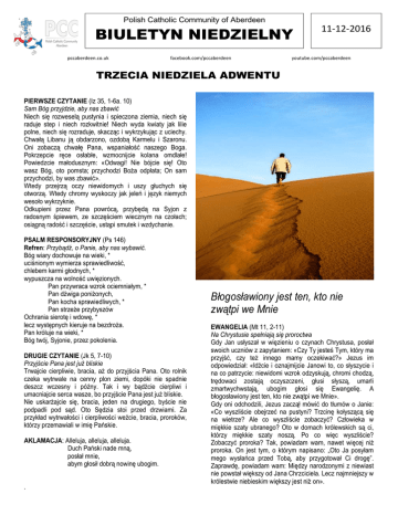 Polish Catholic Community of Aberdeen BIULETYN NIEDZIELNY pccaberdeen.co.uk facebook.com/pccaberdeen 11-12-2016 youtube.com/pccaberdeen TRZECIA NIEDZIELA ADWENTU PIERWSZE CZYTANIE (Iz 35, 1-6a. 10) Sam Bóg przyjdzie, aby nas zbawić Niech się rozweselą pustynia i spieczona ziemia, niech się raduje step i niech rozkwitnie! Niech wyda kwiaty jak lilie polne, niech się rozraduje, skacząc i wykrzykując z uciechy. Chwałą Libanu ją obdarzono, ozdobą Karmelu i Szaronu. Oni zobaczą chwałę Pana, wspaniałość naszego Boga. Pokrzepcie ręce osłabłe, wzmocnijcie kolana omdlałe! Powiedzcie małodusznym: «Odwagi! Nie bójcie się! Oto wasz Bóg, oto pomsta; przychodzi Boża odpłata; On sam przychodzi, by was zbawić». Wtedy przejrzą oczy niewidomych i uszy głuchych się otworzą. Wtedy chromy wyskoczy jak jeleń i język niemych wesoło wykrzyknie. Odkupieni przez Pana powrócą, przybędą na Syjon z radosnym śpiewem, ze szczęściem wiecznym na czołach; osiągną radość i szczęście, ustąpi smutek i wzdychanie. PSALM RESPONSORYJNY (Ps 146) Refren: Przybądź, o Panie, aby nas wybawić. Bóg wiary dochowuje na wieki, * uciśnionym wymierza sprawiedliwość, chlebem karmi głodnych, * wypuszcza na wolność uwięzionych. Pan przywraca wzrok ociemniałym, * Pan dźwiga poniżonych, Pan kocha sprawiedliwych, * Pan strzeże przybyszów Ochrania sierotę i wdowę, * lecz występnych kieruje na bezdroża. Pan króluje na wieki, * Bóg twój, Syjonie, przez pokolenia. DRUGIE CZYTANIE (Jk 5, 7-10) Przyjście Pana jest już bliskie Trwajcie cierpliwie, bracia, aż do przyjścia Pana. Oto rolnik czeka wytrwale na cenny plon ziemi, dopóki nie spadnie deszcz wczesny i późny. Tak i wy bądźcie cierpliwi i umacniajcie serca wasze, bo przyjście Pana jest już bliskie. Nie uskarżajcie się, bracia, jeden na drugiego, byście nie podpadli pod sąd. Oto Sędzia stoi przed drzwiami. Za przykład wytrwałości i cierpliwości weźcie, bracia, proroków, którzy przemawiali w imię Pańskie. AKLAMACJA: Alleluja, alleluja, alleluja. Duch Pański nade mną, posłał mnie, abym głosił dobrą nowinę ubogim. . Błogosławiony jest ten, kto nie zwątpi we Mnie EWANGELIA (Mt 11, 2-11) Na Chrystusie spełniają się proroctwa Gdy Jan usłyszał w więzieniu o czynach Chrystusa, posłał swoich uczniów z zapytaniem: «Czy Ty jesteś Tym, który ma przyjść, czy też innego mamy oczekiwać?» Jezus im odpowiedział: «Idźcie i oznajmijcie Janowi to, co słyszycie i na co patrzycie: niewidomi wzrok odzyskują, chromi chodzą, trędowaci zostają oczyszczeni, głusi słyszą, umarli zmartwychwstają, ubogim głosi się Ewangelię. A błogosławiony jest ten, kto nie zwątpi we Mnie». Gdy oni odchodzili, Jezus zaczął mówić do tłumów o Janie: «Co wyszliście obejrzeć na pustyni? Trzcinę kołyszącą się na wietrze? Ale co wyszliście zobaczyć? Człowieka w miękkie szaty ubranego? Oto w domach królewskich są ci, którzy miękkie szaty noszą. Po co więc wyszliście? Zobaczyć proroka? Tak, powiadam wam, nawet więcej niż proroka. On jest tym, o którym napisano: „Oto Ja posyłam mego wysłańca przed Tobą, aby przygotował Ci drogę”. Zaprawdę, powiadam wam: Między narodzonymi z niewiast nie powstał większy od Jana Chrzciciela. Lecz najmniejszy w królestwie niebieskim większy jest niż on». CYKL ADWENTOWY PIEŚŃ TĘSKNOTY (cz. 3) Po samobójczym ciosie we własne serce, którym było wyznanie grzechu, przychodzi przełamanie. To z serca przeszytego bólem szczerości i prawdy wydobył się w ruinach i nocy głos: Spójrz Panie na cierpienie, udrękę twojego ludu I poślij tego, którego masz posłać Ześlij Baranka, Władcę ziemi, ze skały pustyni do góry Córy Syjonu By on sam zdjął z nas jarzmo niewoli Wszystko zaczyna się od zwrócenia ku Panu i zawołaniu: Spójrz Panie. W tym momencie dokonuje się całkowita zmiana logiki i serca ludzkiego. Prorok w sobie odnalazł tylko grzech, który doprowadził do ruiny życia i wszystkiego co miało w nim wartość. Teraz już wie, że nie może szukać w sobie nadziei, że nie może liczyć na siebie. Ta prawda doprowadziła go do tego, że zwrócił swój wzrok i głos do Pana. W ten sposób wyszedł poza siebie, przekroczył granicę pogrzebanej samowystarczalności. Prorok prosi Pana żeby spojrzał nie na piękno, nie na zasługi, nie ja wspaniałości, bo tego nie ma! Są tylko gruzy i dlatego woła, aby Pan spojrzał na udrękę, na cierpienie swojego ludu. To jest to co człowiek może przedstawić Bogu: grzech, udręka, cierpienie. Jesteśmy prochem, z prochu powstaliśmy i teraz, na gruzach Jerozolimy, prorok doświadcza najgłębszej prawdy o sobie i o człowieczeństwie. Dlatego woła Boga aby spojrzał nie na iluzje, ale na prawdę jego życia. Słowo proroka idzie jednak jeszcze dalej w ufności. Już nie tylko spojrzyj ale także poślij. To kolejny znaczący krok bo prorok prosi Boga aby nie tylko spojrzał, ale by to spojrzenie Go wzruszyło, by przełożyło się na konkretny czyn, na ratunek, którym jest posłanie tego, którego Bóg przewidział posłać. Nazywa Go Barankiem i Władcą ziemi, który przyjdzie do Jerozolimy. On jest Barankiem, który zgładzi grzech i Władcą który odbuduje Jerozolimę. Prorok prosi by to On zdjął jarzmo niewoli, skutek ludzkiego grzechu. Cała ta zwrotka jest więc jednym wpatrywaniem się w kierunku Boga od którego przebija jedyny promyk nadziei. I utaj dochodzimy do symbolu świec i lampionów adwentowych w czasie Rorat. To światło nadziei i wołania o Zbawcę. To światło które staje się jedynym ratunkiem w mroku i ruinach ludzkiego życia. Tekst łaciński trzeciej zwrotki tutaj: Vide Domine afflictionem populi tui Et mitte quem missurus es Emitte Agnum dominatorem terrae de Petra deserti ad montem filiae Sion Ut auferat ipse jugum captivitatis nostrae Zeskanuj kod i posłuchaj FINAŁ AKCJI Polak Polakowi Sercem! Rezultat świątecznej akcji cha