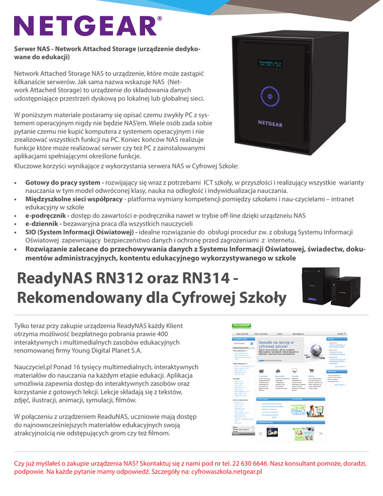 Serwer NAS - Network Attached Storage (urządzenie dedykowane do edukacji) Network Attached Storage NAS to urządzenie, które może zastąpić kilkanaście serwerów. Jak sama nazwa wskazuje NAS (Network Attached Storage) to urządzenie do składowania danych udostępniające przestrzeń dyskową po lokalnej lub globalnej sieci. W poniższym materiale postaramy się opisać czemu zwykły PC z systemem operacyjnym nigdy nie będzie NAS’em. Wiele osób zada sobie pytanie czemu nie kupić komputera z systemem operacyjnym i nie zrealizować wszystkich funkcji na PC. Koniec końców NAS realizuje funkcje które może realizować serwer czy też PC z zainstalowanymi aplikacjami spełniającymi określone funkcje. Kluczowe korzyści wynikające z wykorzystania serwera NAS w Cyfrowej Szkole: • • • • • Gotowy do pracy system - rozwijający się wraz z potrzebami ICT szkoły, w przyszłości i realizujący wszystkie warianty nauczania w tym model odwróconej klasy, nauka na odległość i indywidualizacja nauczania. Międzyszkolne sieci współpracy - platforma wymiany kompetencji pomiędzy szkołami i nau-czycielami – intranet edukacyjny w szkole e-podręcznik - dostęp do zawartości e-podręcznika nawet w trybie off-line dzięki urządzneiu NAS e-dziennik - bezawaryjna praca dla wszystkich nauczycieli SIO (System Informacji Oświatowej) - idealne rozwiązanie do obsługi procedur zw. z obsługą Systemu Informacji Oświatowej zapewniający bezpieczeństwo danych i ochronę przed zagrożeniami z internetu. • Rozwiązanie zalecane do przechowywania danych z Systemu Informacji Oświatowej, świadectw, dokumentów administracyjnych, kontentu edukacyjnego wykorzystywanego w szkole ReadyNAS RN312 oraz RN314 Rekomendowany dla Cyfrowej Szkoły Tylko teraz przy zakupie urządzenia ReadyNAS każdy Klient otrzyma możliwość bezpłatnego pobrania prawie 400 interaktywnych i multimedialnych zasobów edukacyjnych renomowanej firmy Young Digital Planet S.A. Nauczyciel.pl Ponad 16 tysięcy multimedialnych, interaktywnych materiałów do nauczania na każdym etapie edukacji. Aplikacja umożliwia zapewnia dostęp do interaktywnych zasobów oraz korzystanie z gotowych lekcji. Lekcje składają się z tekstów, zdjęć, ilustracji, animacji, symulacji, filmów. W połączeniu z urządzeniem ReaduNAS, uczniowie mają dostęp do najnowocześniejszych materiałów edukacyjnych swoją atrakcyjnością nie odstępujących grom czy też filmom. Czy już myślałeś o zakupie urządzenia NAS? Skontaktuj się z nami pod nr tel. 22 630 6646. Nasz konsultant pomoże, doradzi, podpowie. Na każde pytanie mamy odpowiedź. Szczegóły na: cyfrowaszkola.netgear.pl Najważniejsze funkcje Serwer FTP Udostępnianie plików Windows, Mac OS X, Linux Zarządzanie przez www Systemów plików EXT3, EXT4, NTFS, FAT32, HFS+ Serwer FTP Serwer WWW obsługa iSCSI Stacja pobierania Jednoczesna obsługa protokołów CIFS, AFP, NFS Wsparcie dla VMware, Citrix, Windows Hyper-V Wake on LAN Stacja multimedialna Zarządzanie dostępem do multimediów Wsparcie dla Cooliris Aplikacja do tworzenia kopii zapasowych Zdalna replikacja Rsync Szyfrowana zdalna replikacja Kopia z USB na dowolną lokalizację Kopia na dysk zewnętrzny Obsługa Apple Time Machine Kopia danych do chmury Stacja pobierania BitTorrent Wsparcie dla RapidShare Oprogramowanie QNAP QGet Serwer iTunes Współdzielenie Audio oraz Video Stacja monitoringu Wsparcie dla kamer IP Zarządzanie systemem plików Kontrola poprzez ACL Ukrywanie wolumenu Windows AD Logowanie do domeny Wsparcie dla autentykacji NTLMv2 Tworzenie użytkowników za pomocą plików Import listy użytkowników Przesyłanie alertów poprzez E-mail, SMS Automatyczne włączenie po zaniku napięcia Blokowanie adresów IP Wsparcie dla network UPS Harmonogram włączania wyłączania Monitoring systemu w czasie rzeczywistym • • • Kosz sieciowy Lista użytkowników w czasie rzeczywistym Czy jesteśmy w stanie zapewnić te same funkcje użytkownikom naszej sieci w krótkim czasie w sposób stabilny oraz darmowy? Czy zbiór darmowych aplikacji ściągniętych z internetu który zreplikuje funkcjonalność naszego NAS’a będzie wzbudzał zaufanie? I najważniejsze pytanie, kto odpowiada za problemy wynikające z niepoprawnego działania danej funkcji na naszym systemie operacyjnym czy też aplikacji? Śmiało można powiedzieć że na każde powyższe pytanie odpowiedź jest negatywna. Jeśli nie będzie to komputer firmowy będziemy mieli również problem z serwisowaniem samego sprzętu a nie tylko oprogramowania. Jeśli już uda nam się dobrać odpowiednio tani sprzęt opakowany w równie kompaktową obudowę co urządzenia NAS to czeka nas jeszcze przeprawa przez gąszcz aplikacji które pozwolą nam spełniać określone funkcje. W przypadku urządzeń NAS odpowiedzialność za działanie urządzenia odpowiada producent. Odpowiedzialność za oprogramowanie i jego jakość ponosi producent. Na naszych barkach nie spoczywa pilnowanie czy pojawiły się aktualizacje jednej z trzydziestu zainstalowanych aplikacji. W przypadku NAS’a dostajemy oprogramowanie gotowe do użycia. Kolejną zaletą w przypadku urządzeń NAS jest powtarzalność pojawiających się problemów. W przypadku PC czy też rozwiązań serwerowych bardzo ciężko jest zdiagnozować problem u danego klienta z uwagi na unikalność rozwiązania. W przypadku NAS’ów oprogramowanie jest to samo dla wszystkich wariantów i wersji urządzeń. Czy jest to 2-dyskowy czy 12-dyskowy NAS oprogramowanie będzie to samo. Można sobie wyobrazić jak proste jest diagnozowanie i rozwiązywanie problemów. Czy już myślałeś o zakupie urządzenia NAS? Skontaktuj się z nami pod nr tel. 22 630 6646. Nasz konsultant pomoże, doradzi, podpowie. Na każde pytanie mamy odpowiedź. Szczegóły na: cyfrowaszkola.netgear.pl