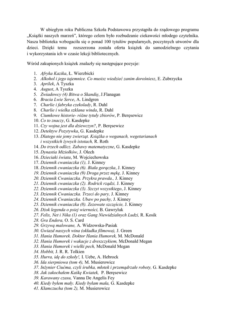 W ubiegłym roku Publiczna Szkoła Podstawowa przystąpiła do rządowego programu „Książki naszych marzeń”, którego celem było rozbudzanie ciekawości młodego czytelnika. Nasza biblioteka wzbogaciła się o ponad 100 tytułów popularnych, poczytnych utworów dla dzieci. Dzięki temu rozszerzona została oferta książek do samodzielnego czytania i wykorzystania ich w czasie lekcji bibliotecznych. Wśród zakupionych książek znalazły się następujące pozycje: 1. Afryka Kazika, Ł. Wierzbicki 2. Alkohol i jego tajemnice. Co musisz wiedzieć zanim dorośniesz, E. Zubrzycka 3. Aprilek, A Tyszka 4. August, A Tyszka 5. Zwiadowcy (4) Bitwa o Skandię, J.Flanagan 6. Bracia Lwie Serce, A. Lindgren 7. Charlie i fabryka czekolady, R. Dahl 8. Charlie i wielka szklana winda, R. Dahl 9. Ciumkowe historie- różne tytuły zbiorów, P. Beręsewicz 10. Co to znaczy, G. Kasdepke 11. Czy wojna jest dla dziewczyn?, P. Beręsewicz 12. Detektyw Pozytywka, G. Kasdepke 13. Dlatego nie jemy zwierząt. Książka o weganach, wegetarianach i wszystkich żywych istotach, R. Roth 14. Do trzech odlicz. Zabawy matematyczne, G. Kasdepke 15. Dynastia Miziołków, J. Olech 16. Dzieciaki świata, M. Wojciechowska 17. Dziennik cwaniaczka (1), J. Kinney 18. Dziennik cwaniaczka (6). Biała gorączka, J. Kinney 19. Dziennik cwaniaczka (9) Droga przez mękę, J. Kinney 20. Dziennik Cwaniaczka. Przykra prawda., J. Kinney 21. Dziennik cwaniaczka (2). Rodrick rządzi, J. Kinney 22. Dziennik cwaniaczka (3). Szczyt wszystkiego, J. Kinney 23. Dziennik Cwaniaczka. Trzeci do pary, J. Kinney 24. Dziennik Cwaniaczka. Ubaw po pachy, J. Kinney 25. Dziennik cwaniaczka (8). Zezowate szczęście, J. Kinney 26. Dżok legenda o psiej wierności, B. Gawryluk 27. Felix, Net i Nika (1) oraz Gang Niewidzialnych Ludzi, R. Kosik 28. Gra Endera, O. S. Card 29. Grzywą malowane, A. Widzowska-Pasiak 30. Gwiazd naszych wina (okładka filmowa), J. Green 31. Hania Humorek. Doktor Hania Humorek, M. McDonald 32. Hania Humorek i wakacje z dreszczykiem, McDonald Megan 33. Hania Humorek i wielki pech, McDonald Megan 34. Hobbit, J. R. R. Tolkien 35. Hurra, idę do szkoły!, I. Uebe, A. Hebrock 36. Ida sierpniowa (tom 4), M. Musierowicz 37. Inżynier Ciućma, czyli śrubka, młotek i przemądrzałe roboty, G. Kasdepke 38. Jak zakochałem Kaśkę Kwiatek, P. Beręsewicz 39. Karawany czasu, Vanna De Angelis Fey 40. Kiedy byłem mały. Kiedy byłam mała, G. Kasdepke 41. Kłamczucha (tom 2), M. Musierowicz 42. Koszmarny Karolek. Megabombowe wyczyny sportowe, F. Simon 43. Koszmarny Karolek. Straszne czaszki i niemiłe mumie, F. Simon 44. Koszmarny Karolek i świąteczny świr, F. Simon 45. Kroniki Archeo (1) Tajemnica klejnotu Nefertiti, A. Stelmaszczyk 46. Kroniki Saltamontes. Tajemnicze Bractwo (część 2), M. Marin 47. Kroniki Saltamontes. Ucieczka z mroku (część 1), M. Marin 48. Kwiat kalafiora (tom 3), M. Musierowicz 49. M jak dżeM, A Tyszka 50. Magiczne drzewo- Cień smoka (6), A. Maleszka 51. Magiczne drzewo- Czerwone krzesło (1), A. Maleszka 52. Magiczne drzewo- Gra (5), A. Maleszka 53. Magiczne drzewo- Pojedynek (4), A. Maleszka 54. Magiczne Drzewo. Świat Ogromnych (7), A. Maleszka 55. Magiczne drzewo- Tajemnica Mostu (2), A. Maleszka 56. Mała księżniczka, F. H. Burnett 57. Mam prawo i nie zawaham się go użyć, J. Olech 58. Mamo tato dlaczego nie jemy zwierząt? 59. Marcysia, A Tyszka 60. Mikołajek (1), R. Goscinny 61. Moje szczęśliwe życie, R. Lagercrantz 62. Momo, M. Ende 63. Most do Terabithii, K. Paterson 64. Muminki. Księga pierwsza, T. Jansson 65. Nela i tajemnice świata 66. Nela na 3 kontynentach 67. Nela na tropie przygód 68. Noskawery, P. Beręsewicz 69. Nowe kłopoty detektywa Pozytywki, G. Kasdepke 70. Opium w rosole (tom 5), M. Musierowicz 71. Oskar i pani Róża, E. E. Schmitt 72. Paddington, M. Bond 73. Pakiet. Władca Pierścieni (w komplecie 3 książki), J. R. R. Tolkien 74. Pamiątki detektywa Pozytywki, G. Kasdepke 75. Pan Kuleczka, W. Widłak 76. Piaskowy Wilk, A. Lind 77. Pięciopsiaczki, W. Chotomska 78. Pippi na Południowym Pacyfiku, A. Lindgren 79. Pippi Pończoszanka, A. Lindgren 80. Pippi wchodzi na pokład, A Lindgren 81. Zwiadowcy (2) Płonący most, J. Flanagan 82. Pompon wszystko na raz, J. Olech 83. Potworak i inne ko(s)miczne opowieści, G. Kasdepke 84. Przygody Tomka Sawyera, M. Twain 85. Róże w garażu, A. Tyszka 86. Zwiadowcy (1) Ruiny Gorlanu, J. Flanagan 87. Skrzynia Władcy Piorunów. Detektywi na kółkach, M. Kozioł 88. Słodki rok Kuby i Buby, G. Kasdepke 89. Słup soli, E. Zubrzycka 90. Szósta klepka (tom 1), M. Musierowicz 91. Tajemnica cyrku, K. M. Widmark, H. Willis 92. Tajemnice człowieka z blizną, P. Beręsewicz 93. Tajemnica kawiarni, K. M. Widmark, H. Willis 94. Tajemnica kina, K. M. Widmark, H. Willis 95. Tajemnica szpitala, K. M. Widmark, H. Willis 96. Tajemnica złota, K. M. Widmark, H. Willis 97. Tarantula, Klops i Herkules, J. Olech 98. Tomek w Gran Chaco, A. Szklarski 99. Tomek w grobowcach faraonów, A. Szklarski 100. Tomek w krainie kangurów, A. Szklarski 101. Tomek w tarapatach, A. Szklarski 102. Trudne słówka. Niepoważny słowniczek rodziny Miziołków, J. Olech 103. Tylko bez całowania!, czyli jak sobie radzić z niektórymi emocjami, G. Kasdepke 104. Wakacje detektywa Pozytywki, G. Kasdepke 105. Zapiski luzaka. Pogromca nudy, L. Peirce 106. Zapiski luzaka. Natan świruje, L. Peirce 107. Zapiski luzaka. Trefna strefa, L. Peirce 108. Zaskórniaki i inne dziwadła z krainy portfela, G. Kasdepke 109. Zawodowcy, P. Beręsewicz 110. Zwiadowcy (3) Ziemia skuta lodem, J. Flanagan 111. Złodziej pioruna, R. Riordan 112. Zosia z ulicy Kociej. Na tropie, A. Tyszka 113. Zosia z ulicy Kociej. Na zimę, A. Tyszka 114. Zosia z ulicy Kociej, A. Tyszka 115. Zosia z ulicy Kociej. Na wakacjach, A. Tyszka 116. Zosia z ulicy Kociej. Na wiosnę, A. Tyszka 117. Zosia z ulicy Kociej. Na wycieczce, A. Tyszka 118. Zosia z ulicy Kociej. Wielkie zmiany, A. Tyszka Zapraszamy do s