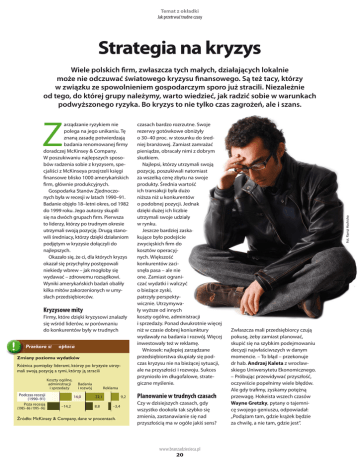 Temat z okładki +BLQS[FUSXBǎUSVEOFD[BTZ Strategia na kryzys Z arządzanie ryzykiem nie polega na jego unikaniu. Tę znaną zasadę potwierdzają badania renomowanej firmy doradczej McKinsey & Company. W poszukiwaniu najlepszych sposobów radzenia sobie z kryzysem, specjaliści z McKinseya przejrzeli księgi finansowe blisko 1000 amerykańskich firm, głównie produkcyjnych. Gospodarka Stanów Zjednoczonych była w recesji w latach 1990–91. Badanie objęło 18–letni okres, od 1982 do 1999 roku. Jego autorzy skupili się na dwóch grupach firm. Pierwsza to liderzy, którzy po trudnym okresie utrzymali swoją pozycję. Drugą stanowili średniacy, którzy dzięki działaniom podjętym w kryzysie dołączyli do najlepszych. Okazało się, że ci, dla których kryzys okazał się przychylny postępowali niekiedy wbrew – jak mogłoby się wydawać – zdrowemu rozsądkowi. Wyniki amerykańskich badań obaliły kilka mitów zakorzenionych w umysłach przedsiębiorców. Kryzysowe mity Firmy, które dzięki kryzysowi znalazły się wśród liderów, w porównaniu do konkurentów były w trudnych ! Przekora się opłaca Zmiany poziomu wydatków Różnica pomiędzy liderami, którzy po kryzysie utrzymali swoją pozycję a tymi, którzy ją stracili Koszty ogólne, administracji i sprzedaży Podczas recesji (1990–91) Poza recesją (1985–86 i 1995–96) Badania i rozwój 14,0 –14,2 tne. Swoje czasach bardzo rozrzutne. bniżyły rezerwy gotówkowe obniżyły nku do średo 30–40 proc. w stosunku st zamrażać niej branżowej. Zamiast mi z dobrym pieniądze, obracały nimi skutkiem. ymali swoją Najlepsi, którzy utrzymali atomiast pozycję, poszukiwali natomiast za wszelką cenę zbytu na swoje tość produkty. Średnia wartość o ich transakcji była dużo ów niższa niż u konkurentów dnak o podobnej pozycji. Jednak dzięki dużej ich liczbie utrzymali swoje udziałyy w rynku. kaJeszcze bardziej zaskakujące było podejście zwycięskich firm do kosztów operacyjnych. Większość konkurentów zacisnęła pasa – ale nie one. Zamiast ograniczać wydatki i walczyć o bieżące zyski, patrzyły perspektywicznie. Utrzymywały wyższe od innych koszty ogólne, administracji stracji i sprzedaży. Ponad dwukrotnie więcej niż w czasie dobrej koniunktury wydawały na badania i rozwój. Więcej inwestowały też w reklamę. Wniosek: najlepiej zarządzane przedsiębiorstwa skupiały się podczas kryzysu nie na bieżącej sytuacji, ale na przyszłości i rozwoju. Sukces przyniosło im długofalowe, strategiczne myślenie. Reklama 22,1 8,8 9,2 –3,4 Źródło: McKinsey & Company, dane w procentach. Planowanie w trudnych czasach Czy w dzisiejszych czasach, gdy wszystko dookoła tak szybko się zmienia, zastanawianie się nad przyszłością ma w ogóle jakiś sens? www.branzadziecieca.pl 20 Fot. Ramzi Hashisho Wiele polskich firm, zwłaszcza tych małych, działających lokalnie może nie odczuwać światowego kryzysu finansowego. Są też tacy, którzy w związku ze spowolnieniem gospodarczym sporo już stracili. Niezależnie od tego, do której grupy należymy, warto wiedzieć, jak radzić sobie w warunkach podwyższonego ryzyka. Bo kryzys to nie tylko czas zagrożeń, ale i szans. Zwłaszcza mali przedsiębiorcy czują pokusę, żeby zamiast planować, skupić się na szybkim podejmowaniu decyzji najwłaściwszych w danym momencie. – To błąd – przekonuje dr hab. Andrzej Kaleta z wrocławskiego Uniwersytetu Ekonomicznego. – Próbując przewidywać przyszłość, oczywiście popełnimy wiele błędów. Ale gdy trafimy, zyskamy potężną przewagę. Hokeista wszech czasów Wayne Gretzky, pytany o tajemnicę swojego geniuszu, odpowiadał: „Podążam tam, gdzie krążek będzie za chwilę, a nie tam, gdzie jest”. Temat z okładki +BLQS[FUSXBǎUSVEOFD[BTZ Na naśladowanie najlepszych i nadrabianie dystansu po ich śladach można sobie pozwolić, gdy sytuacja jest stabilna. Ale gdy otoczenie dynamicznie się zmienia i nie wiadomo, co się zdarzy, trzeba patrzyć przed siebie, a nie na innych. Nie ma sensu czekać na poprawę koniunktury, dotacje państwowe czy programy osłonowe. Pasywne podejście nie bez powodu nazywane jest przez niektórych „postawą zdechłego psa płynącego z prądem rzeki”. Nie da się wygrać w ten sposób. Fot. Charles Thompson Kiedy zastanawiamy się, co będzie z naszą firmą za pół roku, widzimy zwykle różne problemy. Patrząc długofalowo (co w przypadku małej firmy oznacza dwu-, trzyletnią perspektywę) dostrzegamy szanse. W takim okresie nie ma rzeczy niemożliwych. Trzeba tylko wybrać, w którym kierunku chcemy pójść i zacząć stawiać kolejne kroki. Ci, którzy w trudnych czasach przejmują inicjatywę, osiągają sukcesy. Tak właśnie zrobił Dariusz Miłek, twórca firmy obuwniczej CCC (obecnie NG2). W 2001 roku, gdy polska gospodarka gwałtownie wyhamowała, większość firm cięła koszty i zamrażała inwestycje. On zdecydował się wtedy na budowę własnej sieci sprzedaży. Dziś jest jednym z najbogatszych Polaków, a w 2007 roku został wybrany Przedsiębiorcą Roku. Dariusz Miłek jest byłym kolarzem, a jego firma wygrała dzięki strategii stosowanej na szosie: „Rozstrzygające ucieczki dokonują się na trudnych etapach”. Fot. Jimmy Lemon Kryzys to szansa Kolarze doskonale wiedzą, że najlepszym sposobem na wygranie wyścigu jest oderwanie się od peletonu na trudnym etapie. Ta sama taktyka sprawdza się w biznesie. Ten sam sposób myślenia skłonił sanocką firmę Tega do przeprowadzenia w tym roku, po raz pierwszy w 18-letniej historii firmy, kampanii reklamowej w prasie dla rodziców. Promowane będą w ten sposób akcesoria higieniczne dla niemowląt marki OKbaby, której Tega jest wyłącznym polskim dystrybutorem. – Dla nas to oczywiste. Kiedy sytuacja w gospodarce jest trudna, trzeba się bronić – wyjaśnia Artur Moskal z Tegi. – W kryzysie nie da się utrzymać sprzedaży chowając głowę w pias