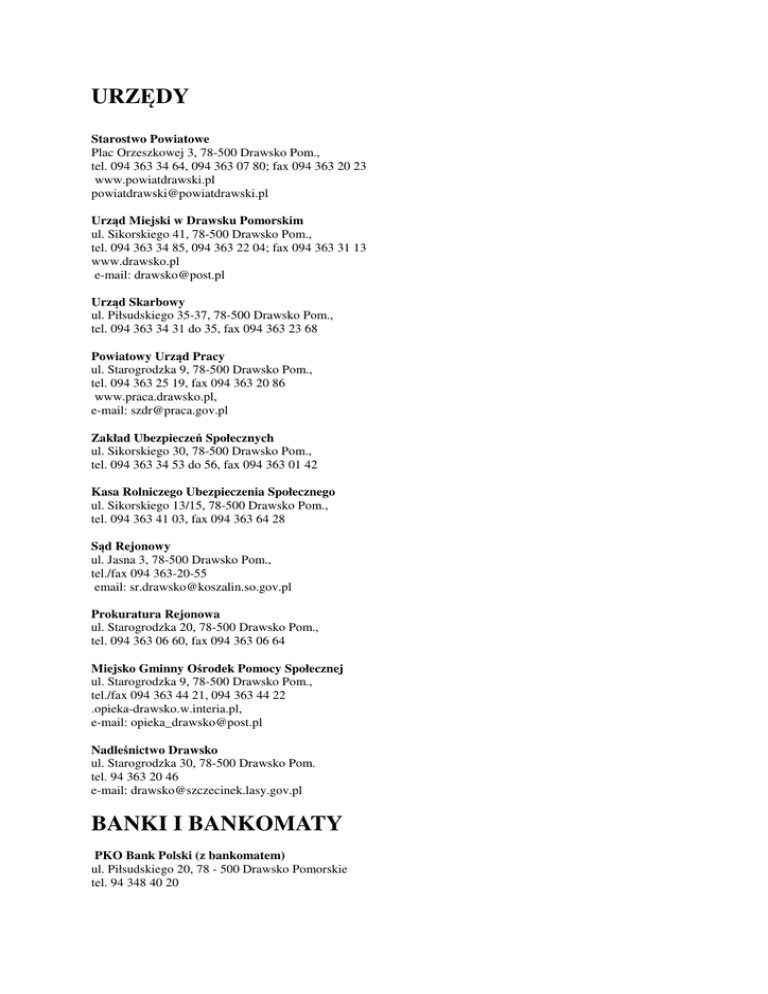 URZĘDY Starostwo Powiatowe Plac Orzeszkowej 3, 78-500 Drawsko Pom., tel. 094 363 34 64, 094 363 07 80; fax 094 363 20 23 www.powiatdrawski.pl [email protected] Urząd Miejski w Drawsku Pomorskim ul. Sikorskiego 41, 78-500 Drawsko Pom., tel. 094 363 34 85, 094 363 22 04; fax 094 363 31 13 www.drawsko.pl e-mail: [email protected] Urząd Skarbowy ul. Piłsudskiego 35-37, 78-500 Drawsko Pom., tel. 094 363 34 31 do 35, fax 094 363 23 68 Powiatowy Urząd Pracy ul. Starogrodzka 9, 78-500 Drawsko Pom., tel. 094 363 25 19, fax 094 363 20 86 www.praca.drawsko.pl, e-mail: [email protected] Zakład Ubezpieczeń Społecznych ul. Sikorskiego 30, 78-500 Drawsko Pom., tel. 094 363 34 53 do 56, fax 094 363 01 42 Kasa Rolniczego Ubezpieczenia Społecznego ul. Sikorskiego 13/15, 78-500 Drawsko Pom., tel. 094 363 41 03, fax 094 363 64 28 Sąd Rejonowy ul. Jasna 3, 78-500 Drawsko Pom., tel./fax 094 363-20-55 email: [email protected] Prokuratura Rejonowa ul. Starogrodzka 20, 78-500 Drawsko Pom., tel. 094 363 06 60, fax 094 363 06 64 Miejsko Gminny Ośrodek Pomocy Społecznej ul. Starogrodzka 9, 78-500 Drawsko Pom., tel./fax 094 363 44 21, 094 363 44 22 .opieka-drawsko.w.interia.pl, e-mail: [email protected] Nadleśnictwo Drawsko ul. Starogrodzka 30, 78-500 Drawsko Pom. tel. 94 363 20 46 e-mail: [email protected] BANKI I BANKOMATY PKO Bank Polski (z bankomatem) ul. Piłsudskiego 20, 78 - 500 Drawsko Pomorskie tel. 94 348 40 20 Bank Pekao SA (z bankomatem) pl. Konstytucji 12, 78-500 Drawsko Pomorskie tel. 94 363 49 82 Santander Consumer Bank Drawsko Pomorskie Oddział Partnerski, ul. Piłsudskiego 41 78-500 Drawsko Pomorskie Bank Spółdzielczy w Połczynie Zdroju, Oddział w Drawsku Pomorskim ul. Chrobrego 1A, 78 - 500 Drawsko Pomorskie tel. 94 36 326 16, 94 34 452 03 Bank Spółdzielczy w Połczynie Zdroju, Filia w Drawsku Pomorskim ul. Sybiraków 4, 78 - 500 Drawsko Pomorskie tel. 94 342 29 08 Bank Spółdzielczy w Połczynie Zdroju, punkt kasowy w Drawsku Pomorskim (z bankomatem) ul. Mickiewicza 1, 78 - 500 Drawsko Pomorskie tel. 94 36 350 04 BANK BGŻ (z bankomatem) pl. Konstytucji 14, 78 - 500 Drawsko Pomorskie, tel. 94 311 55 20 Alior Bank, Placówka Partnerska ul. Piłsudskiego 7D, 78-500 Drawsko Pomorskie tel. 94 343 40 80 Bankomat PKO Bank Polski ul. Piłsudskiego 21 (na zewnątrz budynku Centrum Handlowego DRAWA) Bankomat PKO Bank Polski ul. Prusa 7, 78 - 500 Drawsko Pomorskie w hipermarkecie Biedronka POCZTA Urząd Pocztowy Ul. Pocztowa 11, 78—500 Drawsko Pomorskie, tel: 94 363 25 60 APTEKI Apteka "Pod Orłem" ul. Plac Konstytucji, 78-500 Drawsko Pomorskie tel. 94 363 38 32 Apteka "Centrum zdrowia" ul. Obrońców Westerplatte 7, 78-500 Drawsko Pomorskie Tel. 94 363 00 49 Apteka "Drawska II" ul. Obrońców Westerplatte 1, 78-500 Drawsko Pomorskie tel. 94 363 26 10 Apteka "Cefarm" ul. Bednarska 4, 78 - 500 Drawsko Pomorskie tel. 94 363 22 95 Apteka Śródmiejska ul. Piłsudskiego 39, 78 - 500 Drawsko Pomorskie tel. 94 363 60 00 STACJE BENZYNOWE PKN "Orlen" S.A. ul. Starogrodzka 32, 78-500 Drawsko Pom., tel./fax 094 363 06 30 Stacja paliw ul. Gdyńska 9a, 78-500 Drawsko Pom.. tel. 094 363 41 80 Stacja paliw ul. Starogrodzka 33, 78-500 Drawsko Pom., tel. 094 363 26 06 "BLISKA" Zarańsko 49, 78 - 500 Drawsko Pom KOMUNIKACJA Dworzec PKP, Dworzec PKS ul. Kolejowa 1, 78-500 Drawsko Pom., Taxi ul. Piłsudskiego, 78-500 Drawsko Pom., tel. 094 363 20 18 Radio Taxi tel.094 363 41 41 KULTURA Ośrodek Kultury w Drawsku Pomorskim ul. Piłsudskiego 12 78-500 Drawsko Pomorskie Tel. 94 363 22 30 www.kulturadrawsko.pl Centrum Kultury im. Eugeniusza Poniatowskiego, Kino Drawa ul. Dworcowa 2 78-500 Drawsko Pomorskie Tel. 94 341 38 96 www.kinodrawa.pl Biblioteka Publiczna Miejska i Powiatowa ul. Piłsudskiego 12 tel. 94 363 22 57 TURYSTYKA I REKREACJA Centrum Informacji Turystycznej ul. Kolejowa 1, 78-500 Drawsko Pomorskie tel. 094 363 25 03, email: [email protected]; [email protected] Polskie Towarzystwo Turystyczno – Krajoznawcze Oddział w Drawsku Pomorskim Plac Konstytucji 7, 78-500 Drawsko Pomorskie tel. 094 363 26 47; email:[email protected] LOT „Ziemia Drawska” Ul. Kolejowa 1, 78—500 Drawsko Pomorskie, tel. 669 170 756 e - mail: [email protected] [email protected] Biuro Turystyczne "Delfin" ul. Piłsudskiego 21, 78-500 Drawsko Pom., tel. 094 363 48 67; 606 890 936 e-mail: [email protected] Komenda Powiatowa Policji w Drawsku Pomorskim ul. Obr. Westerplatte 3, 78-500 Drawsko Pom., tel. 094 363 05 11, fax 094 363 05 13 Straż miejska w Drawsku Pomorskim ul. Kolejowa, budynek Dworca PKP Tel. 94 36 325 03 (siedziba) lub 603 390 120, Komenda Powiatowa Straży Pożarnej w Drawsku Pomorskim Plac M. Konopnickiej 1, 78-500 Drawsko Pom., tel./fax 094 363 20 61 do 62, www.strazdrawsko.pl, e-mail: [email protected] Niepubliczny Zakład Opieki Zdrowotnej "ZDROWIE" Sp. z o.o. ul. Obrońców Westerplatte 1A, 78-500 Drawsko Pomorskie, tel. 94 36 322 92 Drawskie Centrum Specjalistyczne ul. Chrobrego 4, 78 - 500 Drawsko Pomorskie, tel. 94 363 03 41 Centrum sercowo-naczyniowe NAFIS ul. Chrobrego 4 tel. 94 711 01 26 Niepubliczny Zakład Opieki Zdrowotnej "Ova-med" ul. Polna 1, 78-500 Drawsko Pomorskie 94 363 59 26