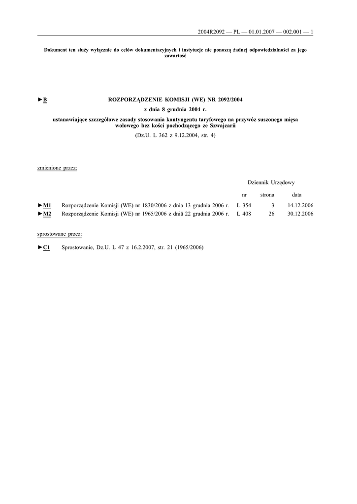 2004R2092 — PL — 01.01.2007 — 002.001 — 1 Dokument ten służy wyłącznie do celów dokumentacyjnych i instytucje nie ponoszą żadnej odpowiedzialności za jego zawartość ►B ROZPORZĄDZENIE KOMISJI (WE) NR 2092/2004 z dnia 8 grudnia 2004 r. ustanawiające szczegółowe zasady stosowania kontyngentu taryfowego na przywóz suszonego mięsa wołowego bez kości pochodzącego ze Szwajcarii (Dz.U. L 362 z 9.12.2004, str. 4) zmienione przez: Dziennik Urzędowy nr ►M1 ►M2 Rozporządzenie Komisji (WE) nr 1830/2006 z dnia 13 grudnia 2006 r. Rozporządzenie Komisji (WE) nr 1965/2006 z dniā 22 grudnia 2006 r. sprostowane przez: ►C1 Sprostowanie, Dz.U. L 47 z 16.2.2007, str. 21 (1965/2006) L 354 L 408 strona 3 26 data 14.12.2006 30.12.2006 2004R2092 — PL — 01.01.2007 — 002.001 — 2 ▼B ROZPORZĄDZENIE KOMISJI (WE) NR 2092/2004 z dnia 8 grudnia 2004 r. ustanawiające szczegółowe zasady stosowania kontyngentu taryfowego na przywóz suszonego mięsa wołowego bez kości pochodzącego ze Szwajcarii KOMISJA WSPÓLNOT EUROPEJSKICH, uwzględniając Traktat ustanawiający Wspólnotę Europejską, uwzględniając rozporządzenie Rady (WE) nr 1254/1999 z dnia 17 maja 1999 r. w sprawie wspólnej organizacji rynku wołowiny i cielęciny (1), w szczególności jego art. 32 ust. 1 akapit pierwszy, a także mając na uwadze, co następuje: (1) Umowa między Wspólnotą Europejską a Konfederacją Szwajcarską w sprawie handlu produktami rolnymi (2) (zwana dalej „Umową”), która została zatwierdzona w imieniu Wspólnoty decyzją 2002/309/WE, Euratom, ustanawia bezcłowy przywóz suszonego mięsa wołowego bez kości, objętego kodem CN ex 0210 20 90 w wysokości 1 200 ton na rok. (2) W związku z kryzysem spowodowanym przez BSE strony oświadczyły we wspólnej deklaracji dotyczącej sektora mięsa zawartej w akcie końcowym Umowy (3), że w drodze wyjątku Wspólnota może ustanowić roczny niezależny kontyngent w wysokości 700 ton wagi netto suszonego mięsa wołowego podlegającego stawce celnej ad valorem i zwolniony z cła specyficznego aż do chwili zniesienia ograniczeń przywozowych nałożonych na Szwajcarię przez niektóre Państwa Członkowskie. Rozporządzenie Komisji (WE) nr 2424/1999 z dnia 15 listopada 1999 r. ustanawiające szczegółowe zasady stosowania kontyngentu taryfowego na przywóz suszonej wołowiny bez kości przewidzianego w rozporządzeniu Rady (WE) nr 2249/1999 (4) ustanowiło wspólnotowy kontyngent taryfowy na przywóz suszonej wołowiny bez kości ze Szwajcarii na okres wieloletni w wysokości 700 ton na rok, począwszy od 1 lipca do 30 czerwca następnego roku. (3) Na trzecim posiedzeniu 4 grudnia 2003 r. w Brukseli Wspólny Komitet ds. Rolnictwa stwierdził, że biorąc pod uwagę przyjęcie przez Wspólny Komitet Weterynaryjny powołany na mocy Umowy między Wspólnotą Europejską i Konfederacją Szwajcarską w sprawie handlu produktami rolnymi z dnia 25 listopada 2003 r. decyzji nr 2/2003 zmieniającej dodatki 1, 2, 3, 4, 5, 6 oraz 11 do załącznika 11 do Umowy (5) oraz wynikające z nich zniesienie przez Państwa Członkowskie środków ograniczających w odniesieniu do Szwajcarii, należy, tak szybko jak to jest możliwe, zastosować koncesje przewidziane w Umowie. Jednak za względu na zmianę reguł pochodzenia obie strony uznały za konieczne zapewnienie operatorom wystarczającego czasu na dostosowanie się i podjęcie odpowiednich kroków w odniesieniu do ewentualnych zapasów. Dlatego też zgodzono się na wprowadzenie nowych koncesji od 1 stycznia 2005 r. (1) Dz.U. L 160 z 26.6.1999, str. 21. Rozporządzenie ostatnio zmienione rozporządzeniem Komisji (WE) nr 1899/2004 (Dz.U. L 328 z 30.10.2004, str. 67). (2) Dz.U. L 114 z 30.4.2002, str. 132. (3) Dz.U. L 114 z 30.4.2002, str. 352. (4) Dz.U. L 294 z 16.11.1999, str. 13. Rozporządzenie ostatnio zmienione rozporządzeniem (WE) nr 1118/2004 (Dz.U. L 217 z 17.6.2004, str. 10). (5) Dz.U. L 23 z 28.1.2004, str. 27. 2004R2092 — PL — 01.01.2007 — 002.001 — 3 ▼B (4) Szczegółowe przepisy dotyczące bezcłowego przywozu suszonego mięsa wołowego bez kości pochodzącego ze Szwajcarii, objętego kodem CN ex 0210 20 90, winny zostać zatem ustanowione na okres wieloletni w wysokości 1 200 ton na rok, począwszy od 1 stycznia 2005 r. (5) Aby kwalifikować się do skorzystania z wymienionego kontyngentu taryfowego, przedmiotowe produkty muszą pochodzić ze Szwajcarii, zgodnie z zasadami, o których mowa w art. 4 Umowy. Należy dokładnie zdefiniować produkty kwalifikujące się. Dla przywozu w ramach tego kontyngentu powinno zostać do celów kontroli przedłożone świadectwo autentyczności stwierdzające, że mięso dokładnie odpowiada definicji kwalifikowania się. Konieczne jest zatem opracowanie wzoru takiego świadectwa i ustanowienie szczegółowych przepisów dotyczących jego stosowania. (6) Instrumentami tymi powinno się zarządzać z wykorzystaniem pozwoleń na przywóz. W tym celu konieczne jest ustanowienie zasad składania wniosków oraz zasad dotyczących informacji podawanych we wnioskach i w pozwoleniach, tam gdzie to niezbędne, w drodze odstępstwa od rozporządzenia Komisji (WE) nr 1291/2000 z dnia 9 czerwca 2000 r. ustanawiającego wspólne szczegółowe zasady stosowania systemu pozwoleń na wywóz i przywóz oraz świadectw o wcześniejszym ustaleniu refundacji dla produktów rolnych (1) oraz od rozporządzenia Komisji (WE) nr 1445/95 z dnia 26 czerwca 1995 r. w sprawie zasad stosowania pozwoleń na przywóz i na wywóz w sektorze wołowiny i cielęciny oraz uchylające rozporządzenie (EWG) nr 2377/80 (2). (7) W celu zapewnienia odpowiedniego zarządzania przywozem przedmiotowych produktów należy ustanowić przepisy uzależniające wydawanie pozwoleń na przywóz w szczególności od sprawdzenia wpisów w świadectwach autentyczności. (8) Rozporządzenie (WE) nr 2424/1999 powinno zostać uchylone. (9) Środki przewidziane w niniejszym rozporządzen