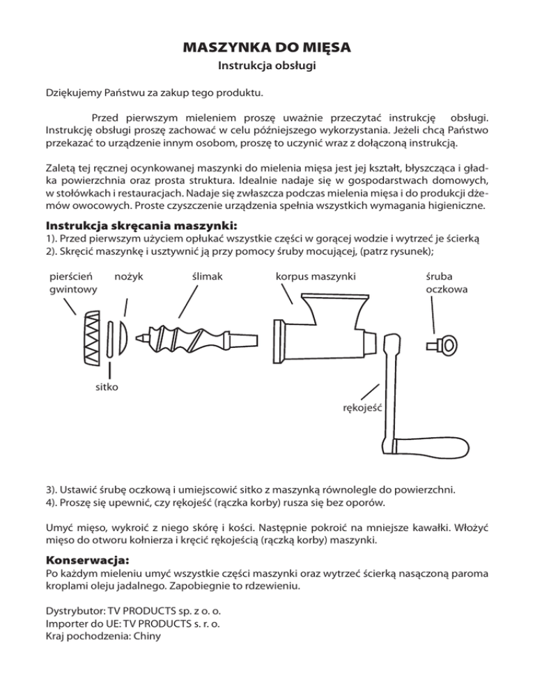 MASZYNKA DO MIĘSA Instrukcja obsługi Dziękujemy Państwu za zakup tego produktu. Przed pierwszym mieleniem proszę uważnie przeczytać instrukcję obsługi. Instrukcję obsługi proszę zachować w celu późniejszego wykorzystania. Jeżeli chcą Państwo przekazać to urządzenie innym osobom, proszę to uczynić wraz z dołączoną instrukcją. Zaletą tej ręcznej ocynkowanej maszynki do mielenia mięsa jest jej kształt, błyszcząca i gładka powierzchnia oraz prosta struktura. Idealnie nadaje się w gospodarstwach domowych, w stołówkach i restauracjach. Nadaje się zwłaszcza podczas mielenia mięsa i do produkcji dżemów owocowych. Proste czyszczenie urządzenia spełnia wszystkich wymagania higieniczne. Instrukcja skręcania maszynki: 1). Przed pierwszym użyciem opłukać wszystkie części w gorącej wodzie i wytrzeć je ścierką 2). Skręcić maszynkę i usztywnić ją przy pomocy śruby mocującej, (patrz rysunek); pierścień gwintowy nożyk ślimak korpus maszynki śruba oczkowa sitko rękojeść 3). Ustawić śrubę oczkową i umiejscowić sitko z maszynką równolegle do powierzchni. 4). Proszę się upewnić, czy rękojeść (rączka korby) rusza się bez oporów. Umyć mięso, wykroić z niego skórę i kości. Następnie pokroić na mniejsze kawałki. Włożyć mięso do otworu kołnierza i kręcić rękojeścią (rączką korby) maszynki. Konserwacja: Po każdym mieleniu umyć wszystkie części maszynki oraz wytrzeć ścierką nasączoną paroma kroplami oleju jadalnego. Zapobiegnie to rdzewieniu. Dystrybutor: TV PRODUCTS sp. z o. o. Importer do UE: TV PRODUCTS s. r. o. Kraj pochodzenia: Chiny MASZYNKA DO MIĘSA Instrukcja obsługi Dziękujemy Państwu za zakup tego produktu. Przed pierwszym mieleniem proszę uważnie przeczytać instrukcję obsługi. Instrukcję obsługi proszę zachować w celu późniejszego wykorzystania. Jeżeli chcą Państwo przekazać to urządzenie innym osobom, proszę to uczynić wraz z dołączoną instrukcją. Zaletą tej ręcznej ocynkowanej maszynki do mielenia mięsa jest jej kształt, błyszcząca i gładka powierzchnia oraz prosta struktura. Idealnie nadaje się w gospodarstwach domowych, w stołówkach i restauracjach. Nadaje się zwłaszcza podczas mielenia mięsa i do produkcji dżemów owocowych. Proste czyszczenie urządzenia spełnia wszystkich wymagania higieniczne. Instrukcja skręcania maszynki: 1). Przed pierwszym użyciem opłukać wszystkie części w gorącej wodzie i wytrzeć je ścierką 2). Skręcić maszynkę i usztywnić ją przy pomocy śruby mocującej, (patrz rysunek); pierścień gwintowy nożyk ślimak korpus maszynki śruba oczkowa sitko rękojeść 3). Ustawić śrubę oczkową i umiejscowić sitko z maszynką równolegle do powierzchni. 4). Proszę się upewnić, czy rękojeść (rączka korby) rusza się bez oporów. Umyć mięso, wykroić z niego skórę i kości. Następnie pokroić na mniejsze kawałki. Włożyć mięso do otworu kołnierza i kręcić rękojeścią (rączką korby) maszynki. Konserwacja: Po każdym mieleniu umyć wszystkie części maszynki oraz wytrzeć ścierką nasączoną paroma kroplami oleju jadalnego. Zapobiegnie to rdzewieniu. Dystrybutor: TV PRODUCTS sp. z o. o. Importer do UE: TV PRODUCTS s. r. o. Kraj pochodzenia: Chiny