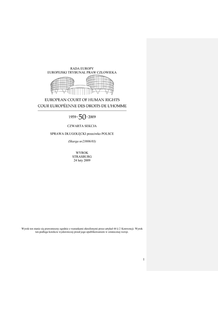 RADA EUROPY EUROPEJSKI TRYBUNAŁ PRAW CZŁOWIEKA CZWARTA SEKCJA SPRAWA DŁUGOŁĘCKI przeciwko POLSCE (Skarga nr23806/03) WYROK STRASBURG 24 luty 2009 Wyrok ten stanie się prawomocny zgodnie z warunkami określonymi przez artykuł 44 § 2 Konwencji. Wyrok ten podlega korekcie wydawniczej przed jego opublikowaniem w ostatecznej wersji. 1 W sprawie Długołęcki przeciwko Polsce, Europejski Trybunał Praw Człowieka (Czwarta Sekcja) zasiadając jako Izba składająca się z następujących sędziów: Nicolas Bratza, Przewodniczący, Lech Garlicki,, Ljiljana Mijović, David Thór Björgvinsson, Ján Šikuta, Päivi Hirvelä , Mihai Poalenungi, sędziowie, i Lawrence Early, Kanclerz Sekcji Obradując na posiedzeniu zamkniętym w dniu 3 lutego 2009 r., Wydaje następujący wyrok, który został przyjęty w tym dniu: POSTĘPOWANIE 1. Sprawa wywodzi się ze skargi (nr 23806/03) wniesionej w dniu 11 lipca 2003r. przeciwko Rzeczypospolitej Polskiej do Europejskiego Trybunału Praw Człowieka na podstawie artykułu 34 Konwencji o ochronie praw człowieka i podstawowych wolności („Konwencja”), przez obywatela polskiego Pana Jacka Długołęckiego („skarżący”). 2. Skarżący był reprezentowany przez Pana M. Puchalskiego, obrońcę praktykującego w Gdyni. Rząd polski („Rząd”) był reprezentowany przez swojego pełnomocnika Pana Jakuba Wołąsiewicza z Ministerstwa Spraw Zagranicznych. 3. Skarżący zarzucił naruszenie prawa do wolności słowa zagwarantowanej przez artykuł 10 Konwencji. 4. Dnia 5 września 2007r., Przewodniczący Czwartej Sekcji Trybunału zdecydował powiadomić Rząd o wpłynięciu skargi. Przyjęto, że sprawa zostanie rozpatrzona w tym samym czasie zarówno co do meritum jak i co do dopuszczalności (art. 29 § 3) . FAKTY I. OKOLICZNOŚCI SPRAWY 5. Skarżący urodził się w 1935 r. i mieszka w Gdańsku. 1) Artykuł w Kolbudzkie ABC. 6. Skarżący jest dziennikarzem i we wskazanym okresie był redaktorem naczelnym bezpłatnego biuletynu Kolbudzkie ABC, Periodyk, Prywatny, Niezależny. W trzynastym wydaniu informatora, z dnia 9 października 1998r., skarżący opublikował następujący artykuł: „Zasady Petera [tytuł powtórzony 6 razy] Zasady Petera: W trakcie swojej kariery w administracji urzędnik ma na celu osiągnięcie funkcji, do wykonywania której nie ma kompetencji. Kilka lat temu Pan A.W. objął i szybko utracił stanowisko wójta. W tym czasie sprawa była szeroko komentowana. Zaskoczenie redaktorów ABC było wielkie, kiedy nazwisko byłego wójta zobaczyli na liście kandydatów na radnego gminy. 2 Kod pola został zmieniony Kod pola został zmieniony To nie jest kandydat jak inni ponieważ stał się sławny z powodu skandalu związanego ze sprzedażą wspaniałych źródeł wody w Pęgowie za połowę ceny firmie Saur z Gdańska. Byliśmy zszokowani, kiedy znaleźliśmy nazwisko nieszczęsnego negocjatora na liście kandydatów na radnego. To może oznaczać, że niedoszły radny myśli, że mieszkańcy Kolbudy i okolic zapomnieli o wpadce Saur . To potwierdza Zasadę Petera – były wójt osiągnął stopień niekompetencji kilka lat temu. Wpadka nie powstrzymała go i dalej wczołguje się na inny stopień… polskiej specjalności…” 7. Pan A.W. nie został wybrany w wyborach do samorządu gminy dnia 11 października 1998r.. Jednak objął w wyborach uzupełniających mandat radnego w Radzie Miejskiej dnia 6 czerwca 1999r. 2. Postępowanie w sprawie o zniesławienie i zniewagę. 8. Dnia 8 stycznia 1999 r. Pan A.W. wniósł do Sądu Rejonowego Gdańsku prywatny akt oskarżenia przeciwko skarżącemu, zarzucając mu zniesławienie. Oskarżyciel prywatny twierdził, że na dwa dni przed wyborami do samorządu gminy skarżący w swojej publikacji poniżył go publicznie, co miało pozbawić go zaufania publicznego i w konsekwencji wpłynęło na przegraną w wyborach. W szczególności A.W. skarżył się na zarzuty stawiane mu przez skarżącego o sprzedanie praw do źródeł wody za połowę możliwej do uzyskania ceny. Ponadto skarżący zarzucił w swoim artykule, że A.W. jako wójt gminy „doszedł już kilka lat temu do szczytu swojej niekompetencji, lecz ten błąd podnosi go na jeszcze wyższy poziom niekompetencji”. Na koniec A.W. dodał, że tytuł artykułu, powtórzony wielokrotnie, był szkalujący. 9. Dnia 4 kwietnia 2000r., Sąd Rejonowy w Gdańsku uznał skarżącego za winnego popełnienia przestępstwa zniesławienia z artykułu 212 Kodeksu karnego, jak również zniewagi z artykułu 216 Kodeksu karnego. Skarżący został skazany na karę grzywny w wysokości 1000 PLN (polskich złotych) oraz został zobowiązany do wpłacenia 200 PLN (polskich złotych) na cele charytatywne. Ponadto skarżący został zobowiązany do zapłaty oskarżycielowi prywatnemu kwoty 300 PLN (polskich złotych) tytułem zwrotu kosztów poniesionych w związku z toczącym się postępowaniem. Sąd orzekł następująco: „W opinii Sądu zarówno forma jak i treść artykułu pod tytułem „Zasada Petera” jasno pokazują, że celem [skarżącego] było oczernienie A.W. poprzez postawienie w okresie przedwyborczym do Rady Gminy w Kolbudach zarzutów dopuszczenia się nadużyć podczas podpisywania umowy z firmą Saur. Zarzuty te mogły doprowadzić do utraty zaufania publicznego wyborców”.. 10. Dnia 16 sierpnia 2000r., skarżący odwołał się od wyroku sądu zarzucając, inter alia, naruszenie artykułu 10 Konwencji. 11. Dnia 30 stycznia 2001r. Sąd Okręgowy w Gdańsku uchylił poprzedni wyrok i przekazał sprawę do ponownego rozpoznania. 12. Dnia 10 grudnia 2002r. Sąd Rejonowy w Gdańsku wydał wyrok. Sąd uniewinnił skarżącego od zarzutu zniesławienia z artykułu 212 Kodeksu karnego. Jednak uznał, że skarżący zgodnie z brzmieniem artykułu 216 § 1 i 2 Kodeksu karnego znieważył A.W. pisząc w artykule pt. „Zasady Petera”, że A.W. „doszedł już kilka lat temu do szczytu swojej niekompetencji, lecz ten błąd 