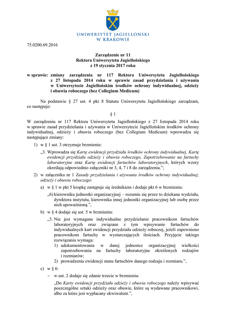 75.0200.69.2016 Zarządzenie nr 11 Rektora Uniwersytetu Jagiellońskiego z 19 stycznia 2017 roku w sprawie: zmiany zarządzenia nr 117 Rektora Uniwersytetu Jagiellońskiego z 27 listopada 2014 roku w sprawie zasad przydzielania i używania w Uniwersytecie Jagiellońskim środków ochrony indywidualnej, odzieży i obuwia roboczego (bez Collegium Medicum) Na podstawie § 27 ust. 4 pkt 8 Statutu Uniwersytetu Jagiellońskiego zarządzam, co następuje: §1 W zarządzeniu nr 117 Rektora Uniwersytetu Jagiellońskiego z 27 listopada 2014 roku w sprawie zasad przydzielania i używania w Uniwersytecie Jagiellońskim środków ochrony indywidualnej, odzieży i obuwia roboczego (bez Collegium Medicum) wprowadza się następujące zmiany: 1) w § 1 ust. 3 otrzymuje brzmienie: „3. Wprowadza się Kartę ewidencji przydziału środków ochrony indywidualnej, Kartę ewidencji przydziału odzieży i obuwia roboczego, Zapotrzebowanie na fartuchy laboratoryjne oraz Kartę ewidencji fartuchów laboratoryjnych, których wzory określają odpowiednio załączniki nr 3, 4, 7 i 8 do zarządzenia.”; 2) w załączniku nr 1 Zasady przydzielania i używania środków ochrony indywidualnej, odzieży i obuwia roboczego: a) w § 1 w pkt 5 kropkę zastępuje się średnikiem i dodaje pkt 6 w brzmieniu: „6) kierowniku jednostki organizacyjnej – rozumie się przez to dziekana wydziału, dyrektora instytutu, kierownika innej jednostki organizacyjnej lub osobę przez nich upoważnioną.”, b) w § 4 dodaje się ust. 5 w brzmieniu: „5. Nie jest wymagane indywidualne przydzielanie pracownikom fartuchów laboratoryjnych oraz związane z tym wpisywanie fartuchów do indywidualnych kart ewidencji przydziału odzieży roboczej, jeżeli zapewniono pracownikom fartuchy w wystarczających ilościach. Przyjęcie takiego rozwiązania wymaga: 1) udokumentowania w danej jednostce organizacyjnej wielkości zapotrzebowania na fartuchy laboratoryjne określonych rodzajów i rozmiarów; 2) prowadzenia ewidencji stanu fartuchów danego rodzaju i rozmiaru.”, c) w § 6: - w ust. 2 dodaje się zdanie trzecie w brzmieniu: „Do Karty ewidencji przydziału odzieży i obuwia roboczego należy wpisywać poszczególne sztuki odzieży oraz obuwie, które są wydawane pracownikowi, albo za które jest wypłacany ekwiwalent.”, - po ust. 2 dodaje się ust. 2a w brzmieniu: „2a. Przy przydziale fartuchów laboratoryjnych, o którym mowa w § 4 ust. 5, kierownik jednostki organizacyjnej określa wielkość zapotrzebowania na fartuchy danego rodzaju i rozmiaru. Wzór dokumentu Zapotrzebowanie na fartuchy laboratoryjne stanowi załącznik nr 7 do zarządzenia. Zakupy i likwidacje fartuchów laboratoryjnych danego rodzaju i rozmiaru należy odnotowywać na Karcie ewidencji fartuchów laboratoryjnych, której wzór stanowi załącznik nr 8 do zarządzenia.”, - dodaje się ust. 7 w brzmieniu: „7. Do kontrolowania prawidłowości przydziału środków ochrony indywidualnej oraz odzieży i obuwia roboczego jest uprawniony Inspektorat BHP UJ.”; 3) załącznik nr 2 Tabela przydziału odzieży i obuwia roboczego dla pracowników Uniwersytetu Jagiellońskiego otrzymuje brzmienie określone w załączniku nr 1 do niniejszego zarządzenia; 4) załącznik nr 3 (wzór Karty ewidencji przydziału środków ochrony indywidualnej) otrzymuje brzmienie określone w załączniku nr 2 do niniejszego zarządzenia; 5) załącznik nr 4 (wzór Karty ewidencji przydziału odzieży i obuwia roboczego) otrzymuje brzmienie określone w załączniku nr 3 do niniejszego zarządzenia; 6) załącznik nr 6 (wzór Listy pracowników uprawnionych do ekwiwalentów pieniężnych za używanie własnej odzieży lub obuwia i/lub pranie odzieży) otrzymuje brzmienie określone w załączniku nr 4 do niniejszego zarządzenia; 7) dodaje się załącznik nr 7 (wzór Zapotrzebowania na fartuchy laboratoryjne) oraz załącznik nr 8 (wzór Karty ewidencji fartuchów laboratoryjnych) w brzmieniu określonym odpowiednio w załącznikach nr 5 i 6 do niniejszego zarządzenia. §2 1. W terminie do dnia 31 stycznia 2017 roku należy uzupełnić dokumenty ewidencyjne, o których mowa w ust. 2 i 3. 2. Do Karty ewidencji przydziału odzieży i obuwia roboczego należy dokonać wpisu odzieży i obuwia roboczego, za które w roku 2015 i roku 2016 został wypłacony ekwiwalent, a które dotychczas nie zostały wpisane. 3. Jeżeli jest to wymagane, należy sporządzić dokument Zapotrzebowanie na fartuchy laboratoryjne, a do Karty ewidencji fartuchów laboratoryjnych wpisać bieżący stan ilościowy fartuchów danego rodzaju i rozmiaru. §3 Zarządzenie wchodzi w życie z dniem podpisania. Rektor Prof. dr hab. med. Wojciech Nowak Dotyczy: – wszystkie jednostki organizacyjne UJ (bez Collegium Medicum) Załącznik nr 1 do zarządzenia nr 11 Rektora UJ z 19 stycznia 2017 r. TABELA PRZYDZIAŁU ODZIEŻY I OBUWIA ROBOCZEGO DLA PRACOWNIKÓW UNIWERSYTETU JAGIELLOŃSKIEGO Objaśnienia do tabeli: Kolumna 1. Lp. – liczba porządkowa. Kolumna 2. Rodzaj pracy – jako podstawa przydziału odzieży i obuwia roboczego. Kolumna 3. Przykładowe nazwy stanowisk pracy – nazwy występujące w dokumentacji oceny ryzyka zawodowego, określające charakter wykonywanych prac, przestrzeń pracy, wyposażenie, itp. Kolumna 4. Rodzaj odzieży lub obuwia roboczego – odzież i obuwie przysługujące pracownikowi wykonującemu prace wymienione w kolumnie 2. Kolumna 5. Okres używalności – przewidywany okres używalności odzieży lub obuwia roboczego. Kolumna 6. Własna odzież lub obuwie robocze – informacja o dopuszczalności używania przez pracowników własnej odzieży i obuwia roboczego wg § 1 ust. 4 zarządzenia nr 117 Rektora UJ z 27 listopada 2014 roku. 1. BIBLIOTEKI, ARCHIWA, MUZEA Lp. Rodzaj pracy 1 2 1. 2. 3. 4. Prace przy zbiorach, aktach Prace w magazynie zbiorów Przykładowe nazwy stanowisk pracy 3 kustosz, bibliotekarz, archiwista, dokumentalista magazynier, woźna, pracownik gospodarczy Kon