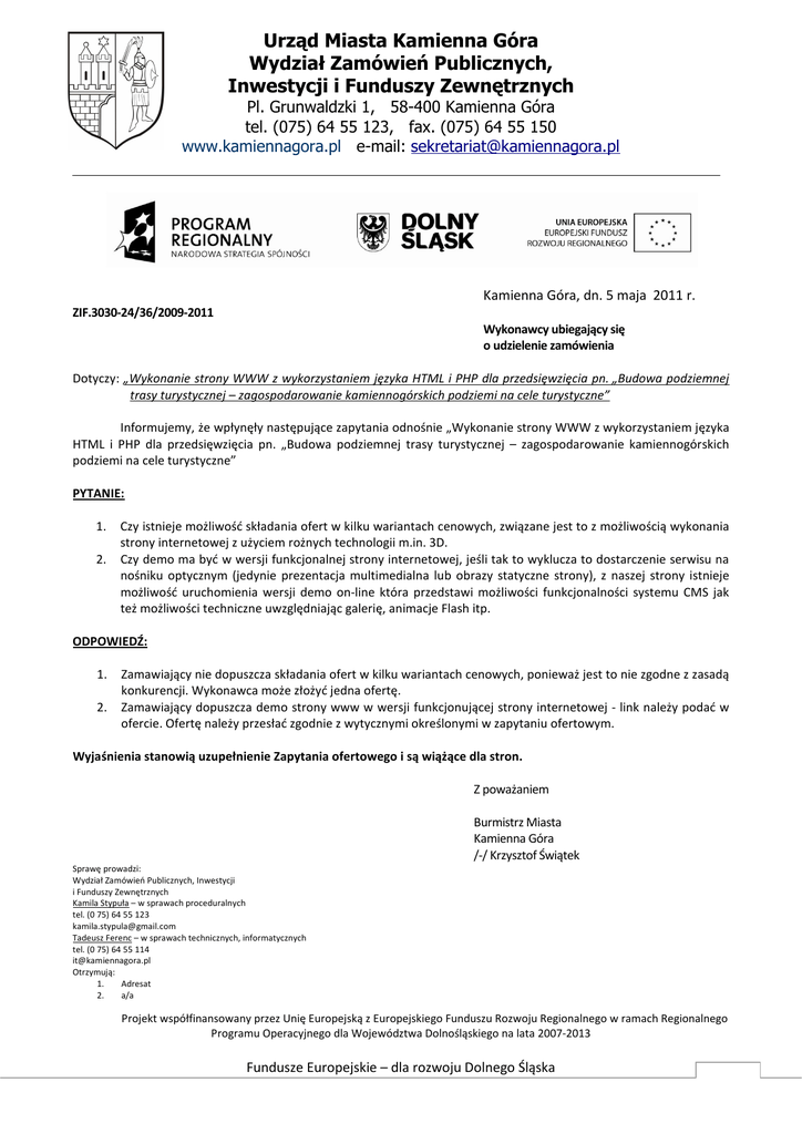 Urząd Miasta Kamienna Góra Wydział Zamówień Publicznych, Inwestycji i Funduszy Zewnętrznych Nie moŜna wy świetlić obrazu. Na k omputerze moŜe brak ować pamięci do otwarcia obrazu lub obraz moŜe by ć uszk odzony . Uruchom ponownie k omputer, a następnie otwórz plik ponownie. Jeśli czerwony znak x nadal będzie wy świetlany , k onieczne moŜe by ć usunięcie obrazu, a następnie ponowne wstawienie go. Pl. Grunwaldzki 1, 58-400 Kamienna Góra tel. (075) 64 55 123, fax. (075) 64 55 150 www.kamiennagora.pl e-mail: [email protected] Kamienna Góra, dn. 5 maja 2011 r. ZIF.3030-24/36/2009-2011 Wykonawcy ubiegający się o udzielenie zamówienia Dotyczy: „Wykonanie strony WWW z wykorzystaniem języka HTML i PHP dla przedsięwzięcia pn. „Budowa podziemnej trasy turystycznej – zagospodarowanie kamiennogórskich podziemi na cele turystyczne” Informujemy, że wpłynęły następujące zapytania odnośnie „Wykonanie strony WWW z wykorzystaniem języka HTML i PHP dla przedsięwzięcia pn. „Budowa podziemnej trasy turystycznej – zagospodarowanie kamiennogórskich podziemi na cele turystyczne” PYTANIE: 1. 2. Czy istnieje możliwość składania ofert w kilku wariantach cenowych, związane jest to z możliwością wykonania strony internetowej z użyciem rożnych technologii m.in. 3D. Czy demo ma być w wersji funkcjonalnej strony internetowej, jeśli tak to wyklucza to dostarczenie serwisu na nośniku optycznym (jedynie prezentacja multimedialna lub obrazy statyczne strony), z naszej strony istnieje możliwość uruchomienia wersji demo on-line która przedstawi możliwości funkcjonalności systemu CMS jak też możliwości techniczne uwzględniając galerię, animacje Flash itp. ODPOWIEDŹ: 1. 2. Zamawiający nie dopuszcza składania ofert w kilku wariantach cenowych, ponieważ jest to nie zgodne z zasadą konkurencji. Wykonawca może złożyć jedna ofertę. Zamawiający dopuszcza demo strony www w wersji funkcjonującej strony internetowej - link należy podać w ofercie. Ofertę należy przesłać zgodnie z wytycznymi określonymi w zapytaniu ofertowym. Wyjaśnienia stanowią uzupełnienie Zapytania ofertowego i są wiążące dla stron. Z poważaniem Burmistrz Miasta Kamienna Góra /-/ Krzysztof Świątek Sprawę prowadzi: Wydział Zamówień Publicznych, Inwestycji i Funduszy Zewnętrznych Kamila Stypuła – w sprawach proceduralnych tel. (0 75) 64 55 123 [email protected] Tadeusz Ferenc – w sprawach technicznych, informatycznych tel. (0 75) 64 55 114 [email protected] Otrzymują: 1. Adresat 2. a/a Projekt współfinansowany przez Unię Europejską z Europejskiego Funduszu Rozwoju Regionalnego w ramach Regionalnego Programu Operacyjnego dla Województwa Dolnośląskiego na lata 2007-2013 Fundusze Europejskie – dla rozwoju Dolnego Śląska