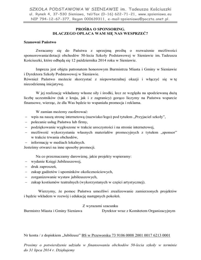 SZKOŁA PODSTAWOWA W SIENIAWIE im. Tadeusza Kościuszki ul. Rynek 4, 37-530 Sieniawa, tel/fax (0-16) 622-71-21, www.spsieniawa.eu NIP 794-12-67-377, Regon 000639311, e-mail:[email protected]. PROŚBA O SPONSORING. DLACZEGO OPŁACA WAM SIĘ NAS WESPRZEĆ? Szanowni Państwo Zwracamy się do Państwa z uprzejmą prośbą o rozważenie możliwości sponsorowania/dotacji obchodów 50-lecia Szkoły Podstawowej w Sieniawie im. Tadeusza Kościuszki, które odbędą się 12 października 2014 roku w Sieniawie. Impreza jest objęta patronatem honorowym Burmistrza Miasta i Gminy w Sieniawie i Dyrektora Szkoły Podstawowej w Sieniawie. Również Państwo możecie skorzystać z niepowtarzalnej okazji i włączyć się w tę niecodzienną inicjatywę. W jej realizację wkładamy własne siły i środki, lecz ze względu na spodziewaną dużą liczbę uczestników (tak z kraju, jak i z zagranicy) gorąco liczymy na Państwa wsparcie finansowe, wierząc, że dla Was będzie to wspaniała promocja i reklama. W zamian możemy zaoferować: - wpis na naszą stronę internetową (nazwisko/logo) pod tytułem „Przyjaciel szkoły”, - polecanie usług Państwa lub firmy, - podziękowanie wygłoszone w trakcie uroczystości i na stronie internetowej, - możliwość wykorzystania własnych materiałów promocyjnych z tytułem „sponsor” w trakcie trwania obchodów, - informację w mediach lokalnych. Jesteśmy otwarci na inne sposoby promocji. - Na co przeznaczamy darowiznę, jakie projekty wspieramy: wydanie Księgi Jubileuszowej, druk zaproszeń, zakup gadżetów i upominków okolicznościowych, zorganizowanie wystaw jubileuszowych, zakup kostiumów teatralnych (wykorzystanych w części artystycznej). Wierzymy, że pomoc Państwa umożliwi zrealizowanie zamierzonych projektów i będzie wkładem w rozwój i edukację następnych pokoleń. Z wyrazami szacunku Burmistrz Miasta i Gminy Sieniawa Dyrektor wraz z Komitetem Organizacyjnym Nr konta / z dopiskiem „Jubileusz” BS w Przeworsku 73 9106 0008 2001 0017 6213 0001 Prosimy o potwierdzenie udziału w finansowaniu obchodów 50-lecia szkoły w terminie do 31 lipca 2014 r. Dziękujemy DYREKTOR SZKOŁY PODSTAWOWEJ W SIENIAWIE IM. TADEUSZA KOŚCIUSZKI - O OBCHODACH 50-LECIA SZKOŁY - W LIŚCIE DO ABSOLWENTÓW, BYŁYCH PRACOWNIKÓW I SYMPATYKÓW SZKOŁY Szanowni Państwo W imieniu Komitetu Organizacyjnego mam wielką przyjemność poinformować Państwa, że w roku 2014 mija 50 lat od daty oddania do użytku naszego budynku szkolnego. W związku z Jubileuszem, planujemy zorganizowanie uroczystości, których główna część odbędzie się 12 października 2014 roku w Sieniawie. Przewidujemy, że odbędą się m. in. następujące wydarzenia: - uroczysta msza św., - wystawa „Z historii szkoły”, - akademia środowiskowa, - spotkanie władz szkolnych, miejskich z absolwentami i pracownikami szkoły. Po części oficjalnej szkoła będzie otwarta dla wszystkich absolwentów i sympatyków. Zapraszamy do obejrzenia naszych wnętrz, wystaw, spotkań z koleżankami, kolegami, nauczycielami, proponujemy nabycie okolicznościowych publikacji. Zapewniamy skromny poczęstunek. Zachęcamy wszystkich do: - udziału w uroczystościach, - do zgłaszania sukcesów na polu zawodowym, społecznym i kulturalnym, - do przesyłania wspomnień, zdjęć i innych materiałów, - do wsparcia finansowego imprezy lub szkoły (więcej na stronie internetowej szkoły pod hasłem „Prośba o sponsoring. Dlaczego Wam się opłaca nas wesprzeć?”). Prosimy o podjęcie współpracy. Każda pomoc jest dla nas cenna. Po raz pierwszy organizujemy jubileusz na tak dużą skalę. Proszę o zawiadomienie kolegów, koleżanek, krewnych i znajomych absolwentów niemieszkających w Sieniawie o treści niniejszego listu. Wspólnie zadbajmy o wizerunek naszej szkoły. Z poważaniem Dyrektor wraz z Komitetem Organizacyjnym Nr konta / z dopiskiem „Jubileusz” BS w Przeworsku 73 9106 0008 2001 0017 6213 0001