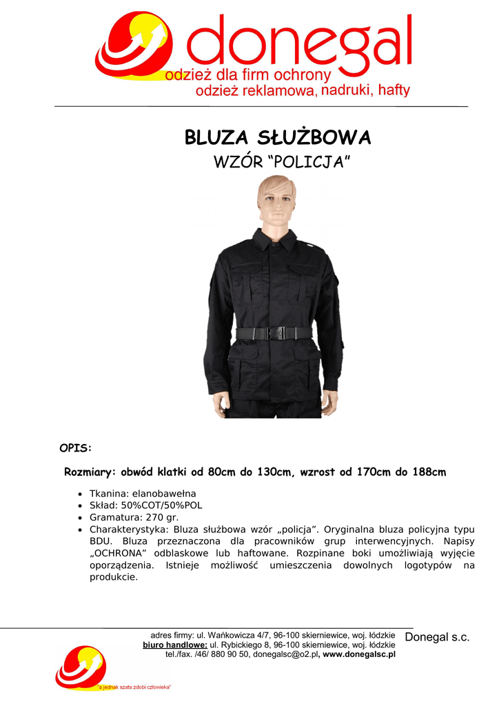 BLUZA SŁUŻBOWA WZÓR “POLICJA” OPIS: Rozmiary: obwód klatki od 80cm do 130cm, wzrost od 170cm do 188cm Tkanina: elanobawełna Skład: 50%COT/50%POL Gramatura: 270 gr. Charakterystyka: Bluza służbowa wzór „policja”. Oryginalna bluza policyjna typu BDU. Bluza przeznaczona dla pracowników grup interwencyjnych. Napisy „OCHRONA” odblaskowe lub haftowane. Rozpinane boki umożliwiają wyjęcie oporządzenia. Istnieje możliwość umieszczenia dowolnych logotypów na produkcie. adres firmy: ul. Wańkowicza 4/7, 96-100 skierniewice, woj. łódzkie biuro handlowe: ul. Rybickiego 8, 96-100 skierniewice, woj. łódzkie tel./fax. /46/ 880 90 50, [email protected], www.donegalsc.pl Donegal s.c.